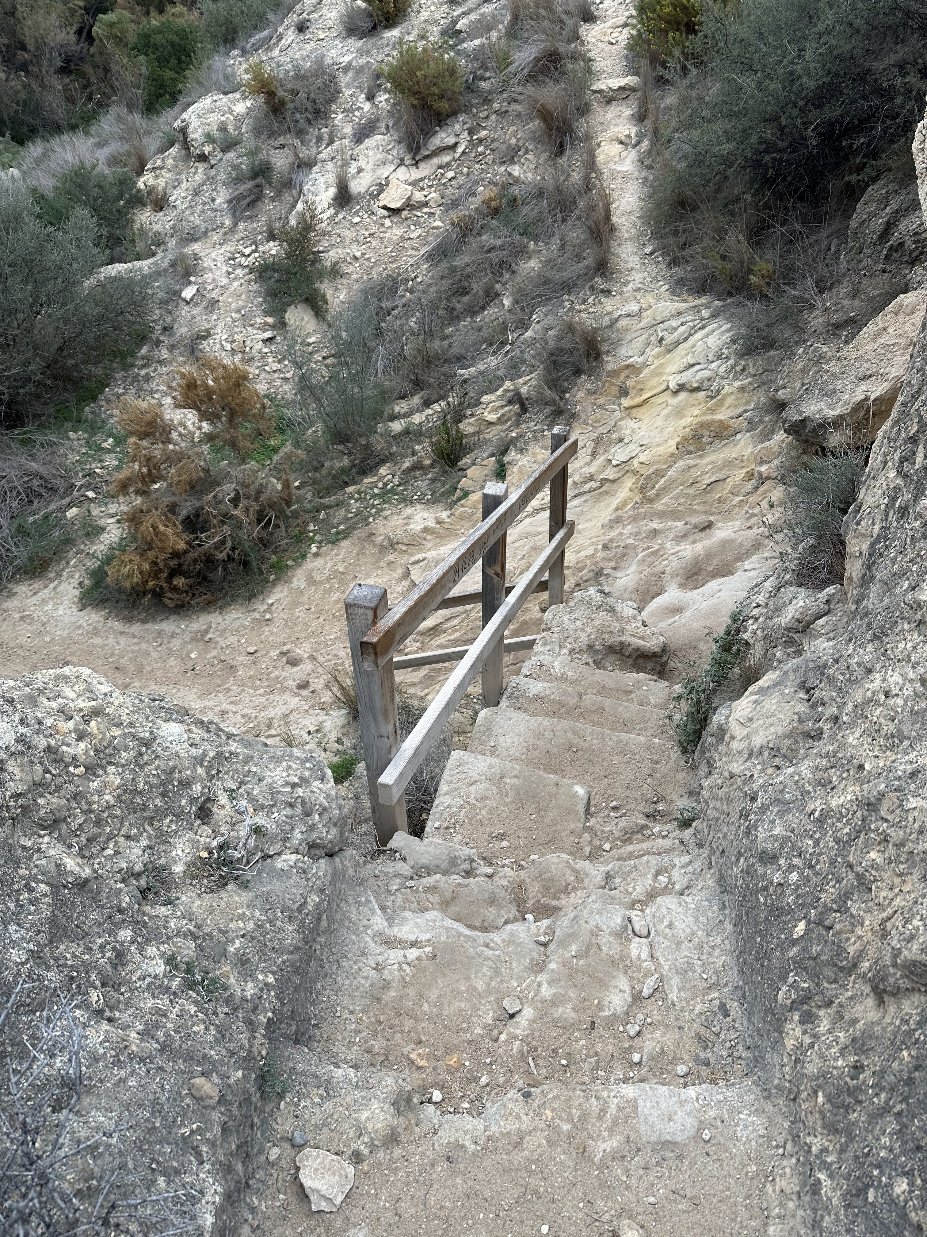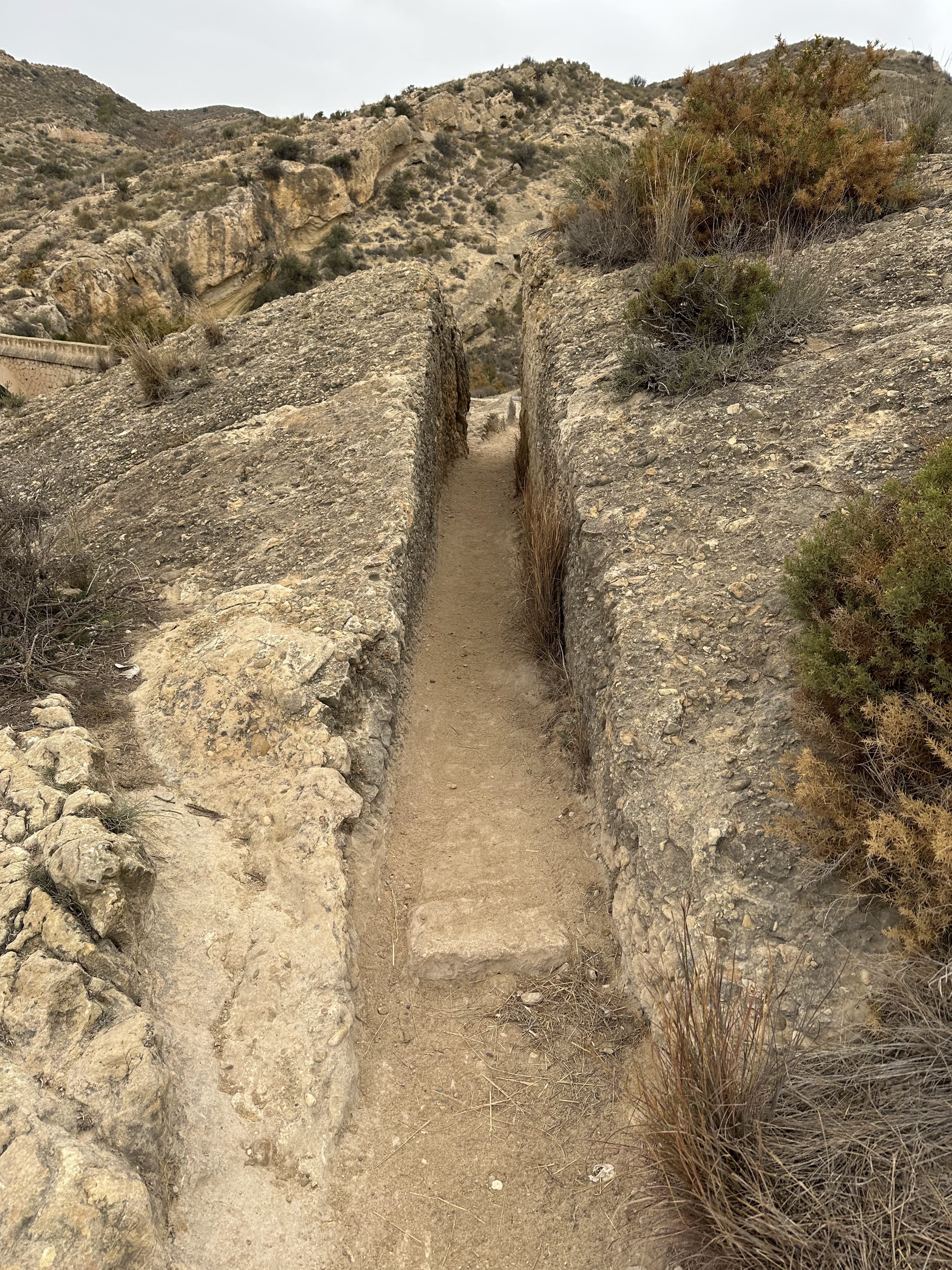 Se va andando entre la acequia mayor del pantano y el río Vinalopó, de hecho se llegan casi a cruzar o estar muy juntos, por caminos al principio no muy difíciles aún.