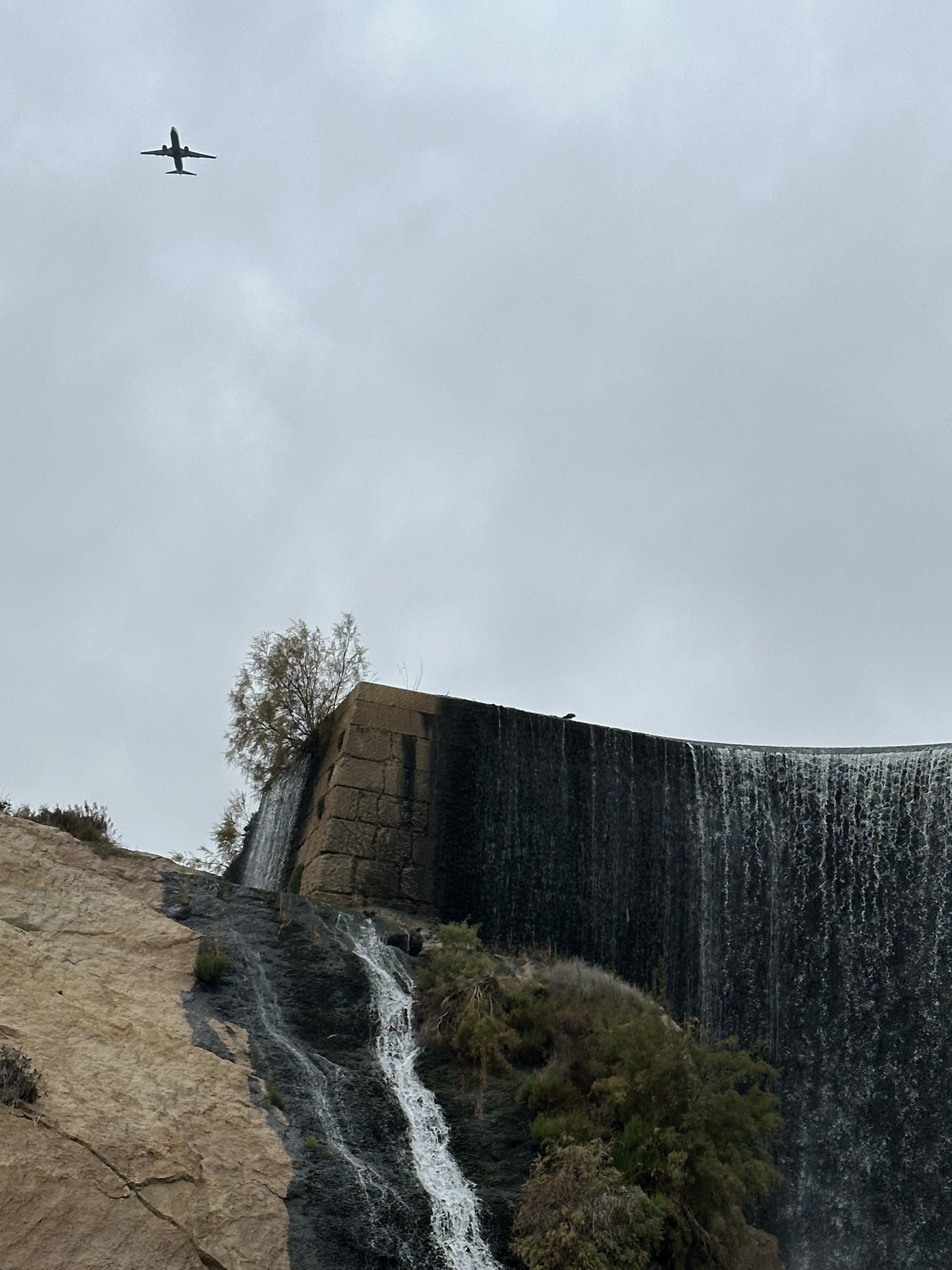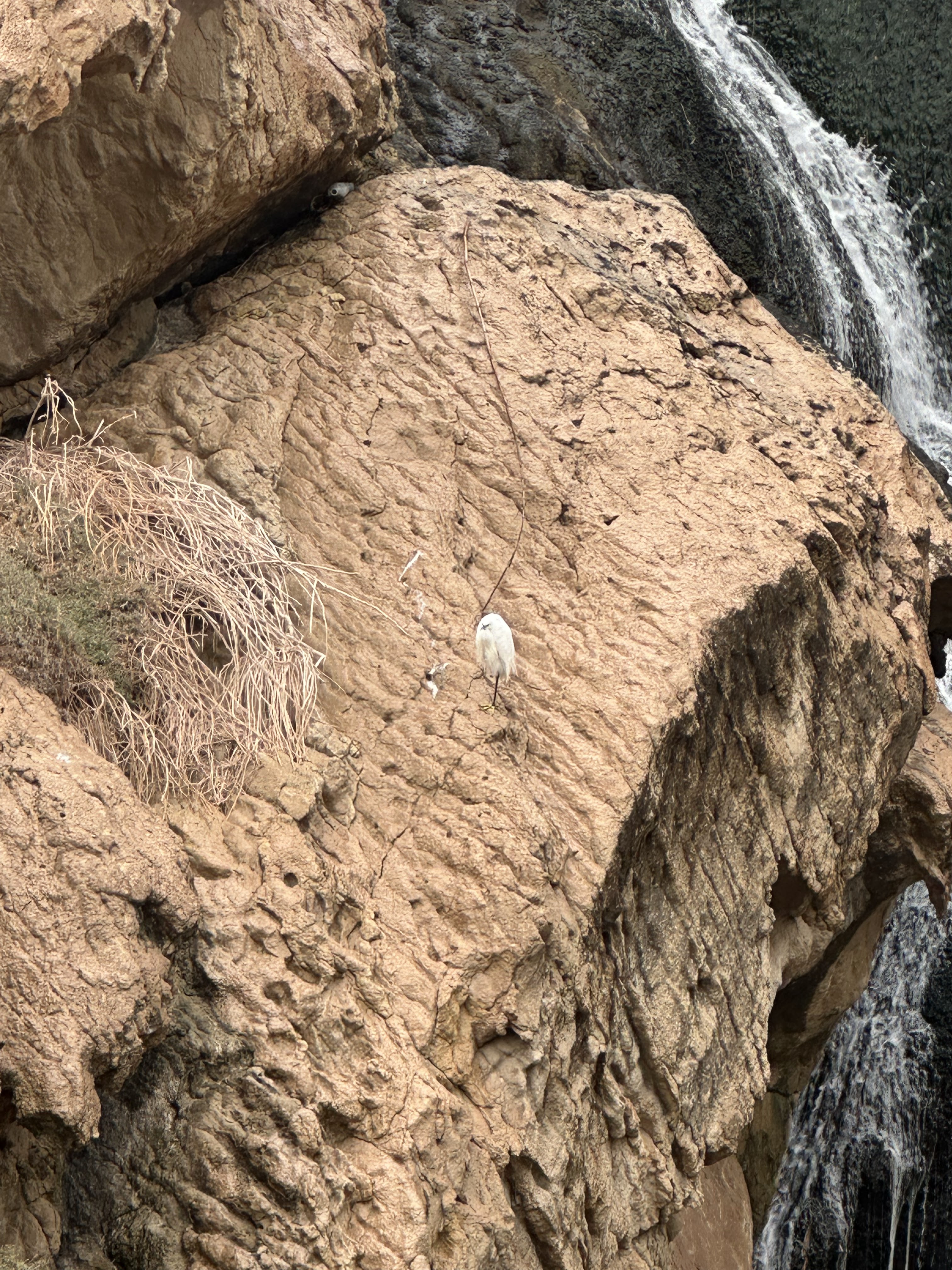 Cierro apartado pantano con las imágenes de un avión sobrevolando éste y una curiosa ave sobre la roca de la cascada a su salida.