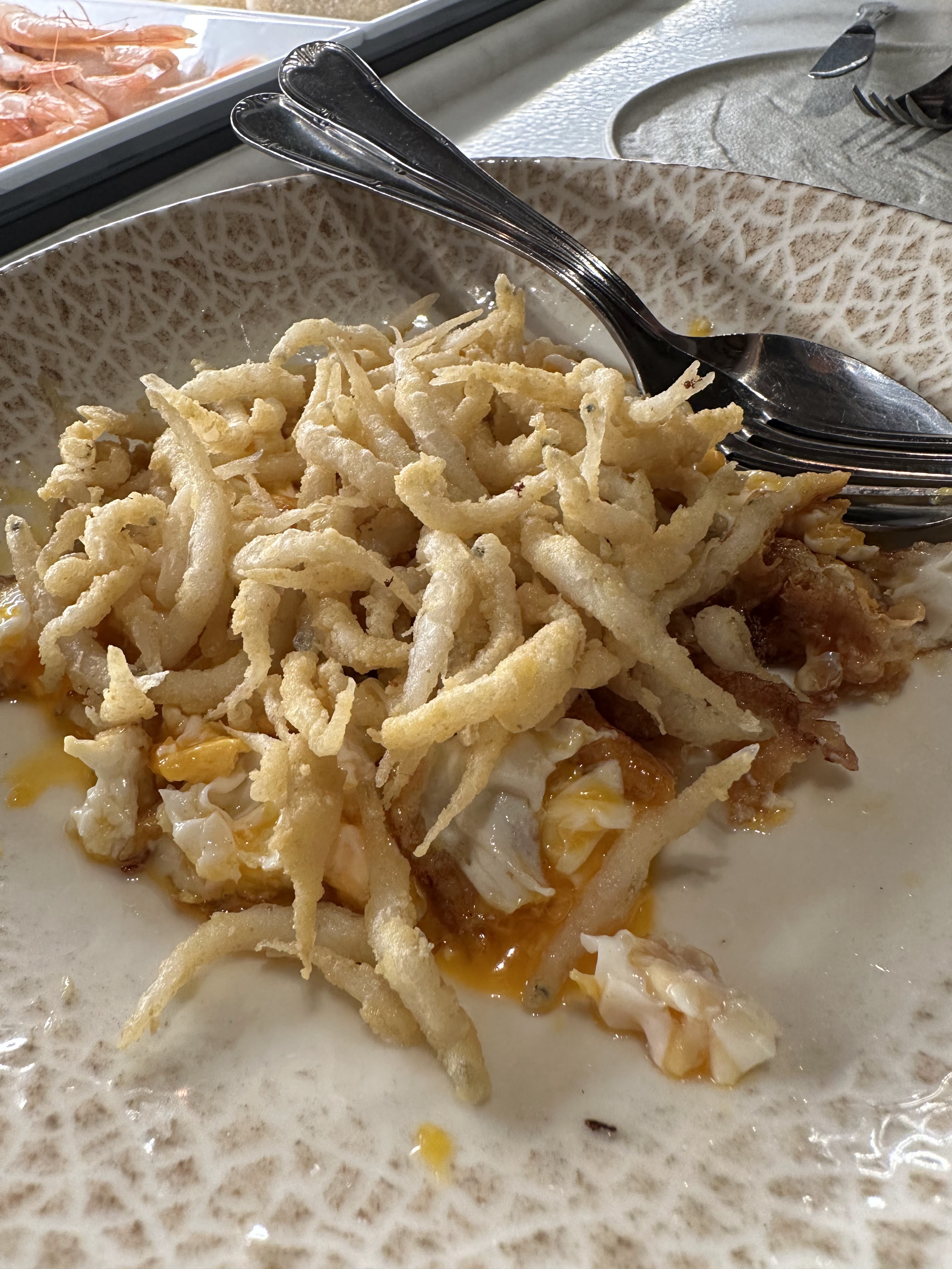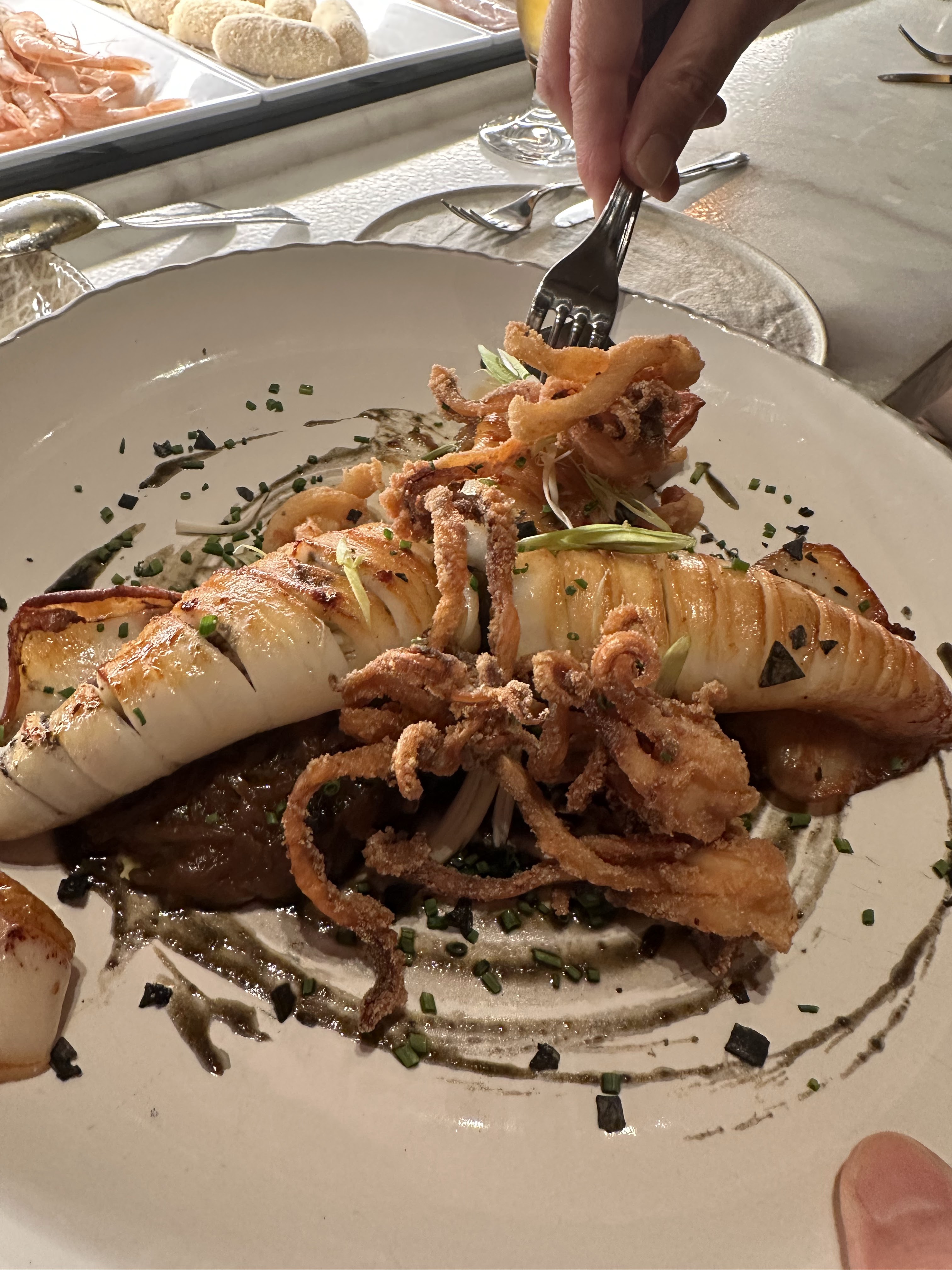 Nos gusta su barra y aunque tuvimos que esperar un poco para pillar hueco, nos acoplamos enseguida. Básicamente tomamos unas croqueta de jamón y tigre, un carpaccio gamba, unos huevos con chanquetes y un calamar encebollado.