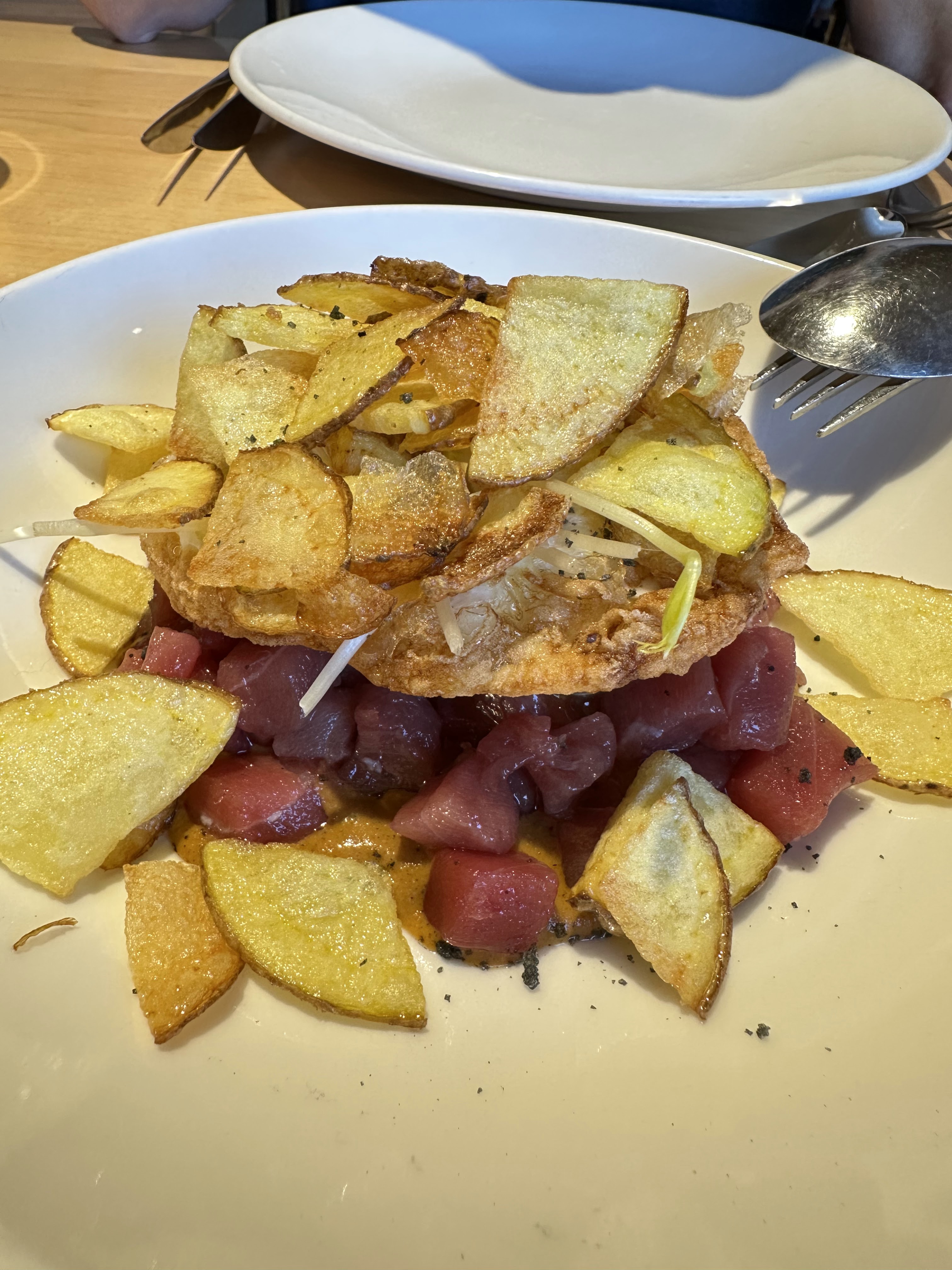 -Tartar de atún rojo con una suave salsa romescu y huevo frito.