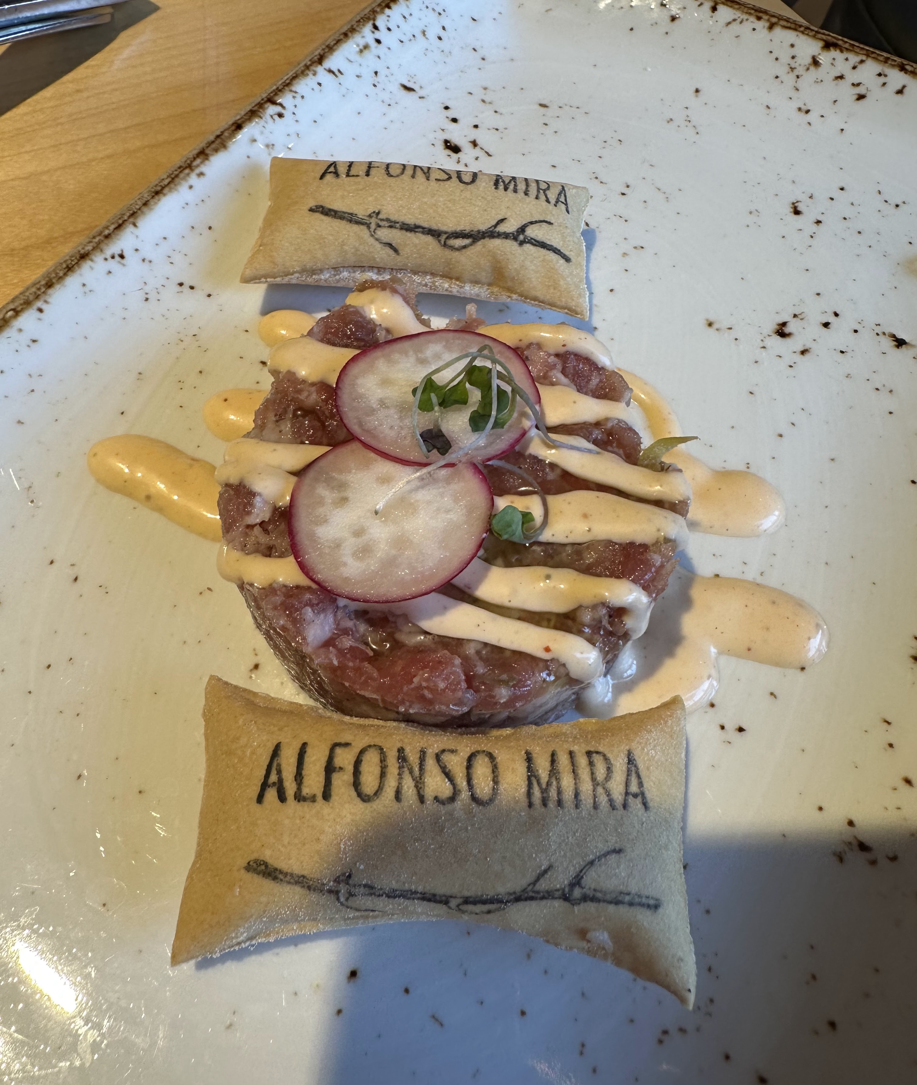 -Tartar de longaniza aspense (sustituyó al bikini de jarrete, queso parmesano y yema de huevo curada)