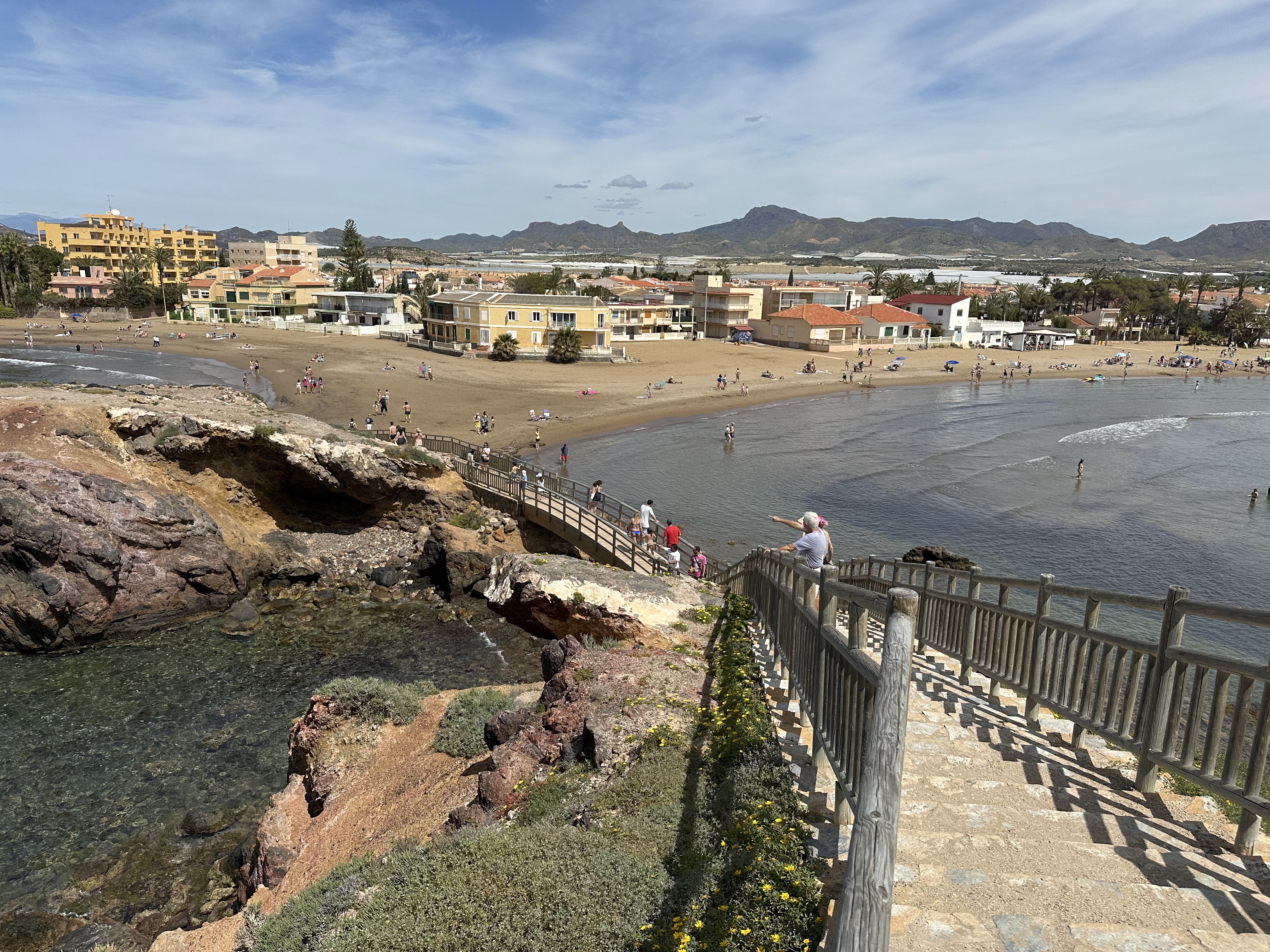 Aparcados en la calle Mateo Gª Martínez y tras ver cantidad de gente en la playa de Bahía y algunos bañándose, subimos por un paseo entre maderas (suelo y escaleras), al Mirador Cabezo de la Reya.