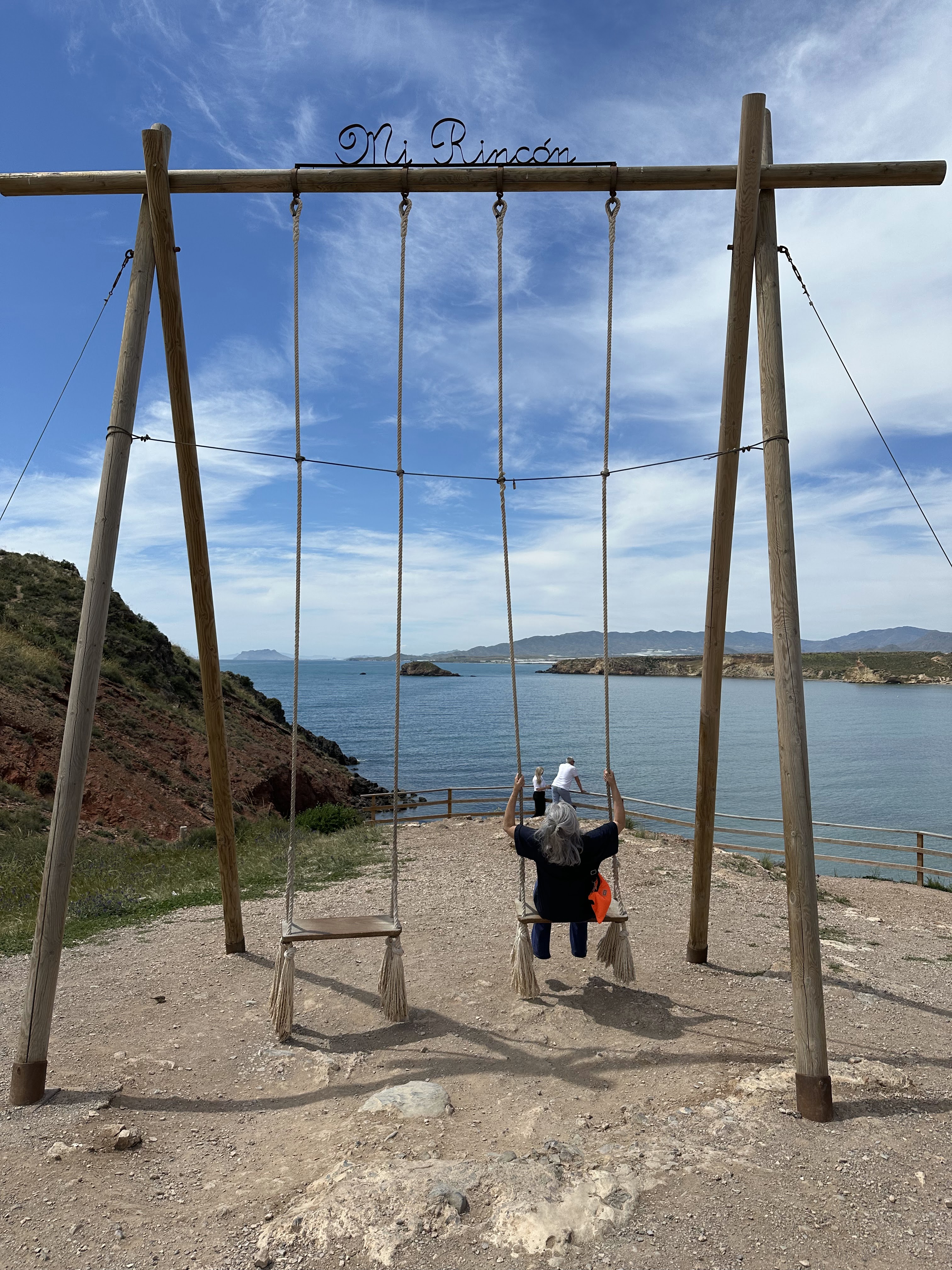 También subir al Columpio Mirador «Mi rincón», que es así como se llama el lugar, aunque podría ser mi rincón y sobre todo de los peques a los que les hace ilusión este tipo de atracciones de jardín, etc….bueno, nosotros también hicimos un poco el niño/a que llevamos dentro y nos columpiamos mirando a marrrr.