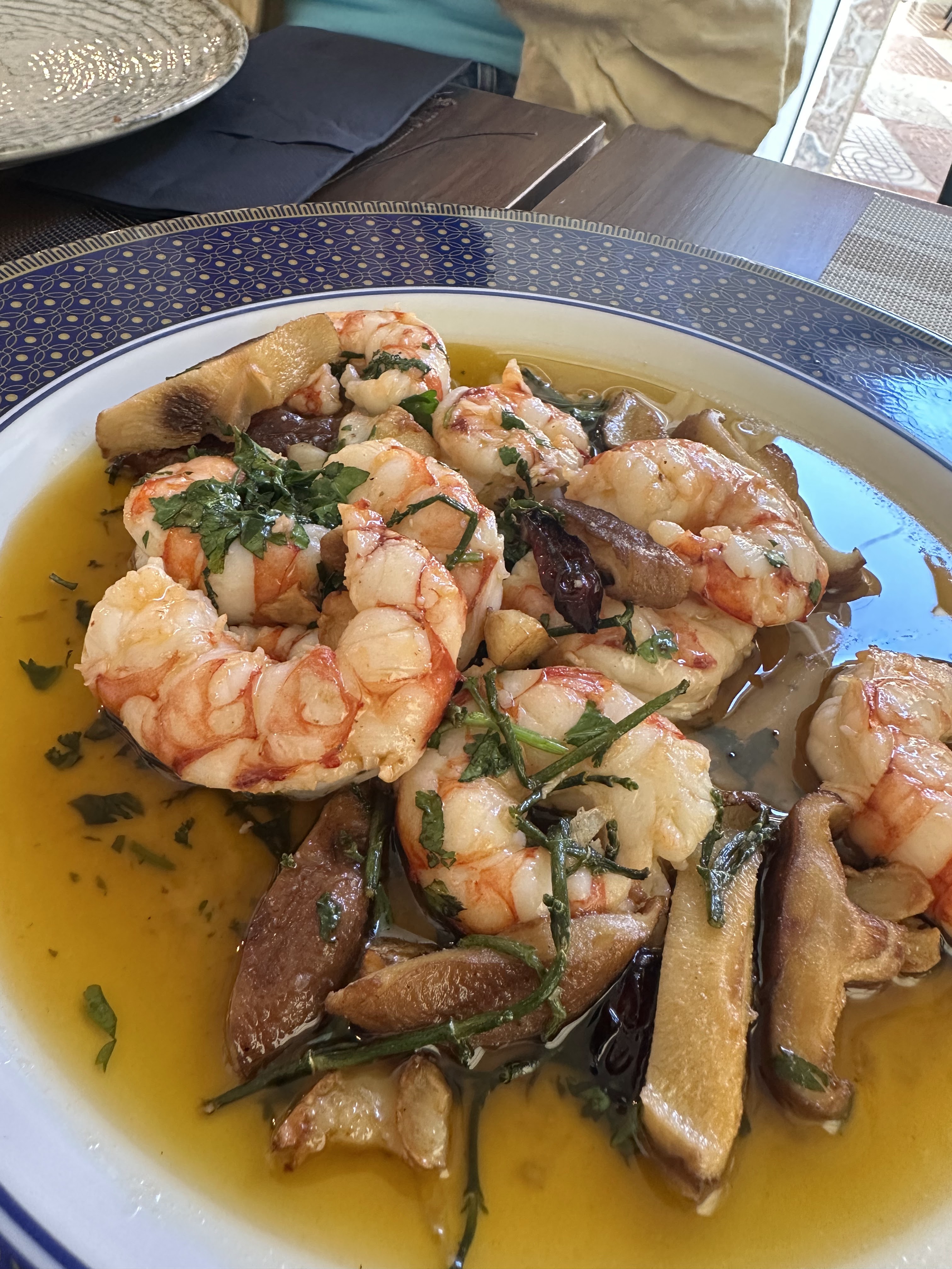 -Gambas al ajillo a nuestra manera (con setas y buena gamba; idem de buenas)