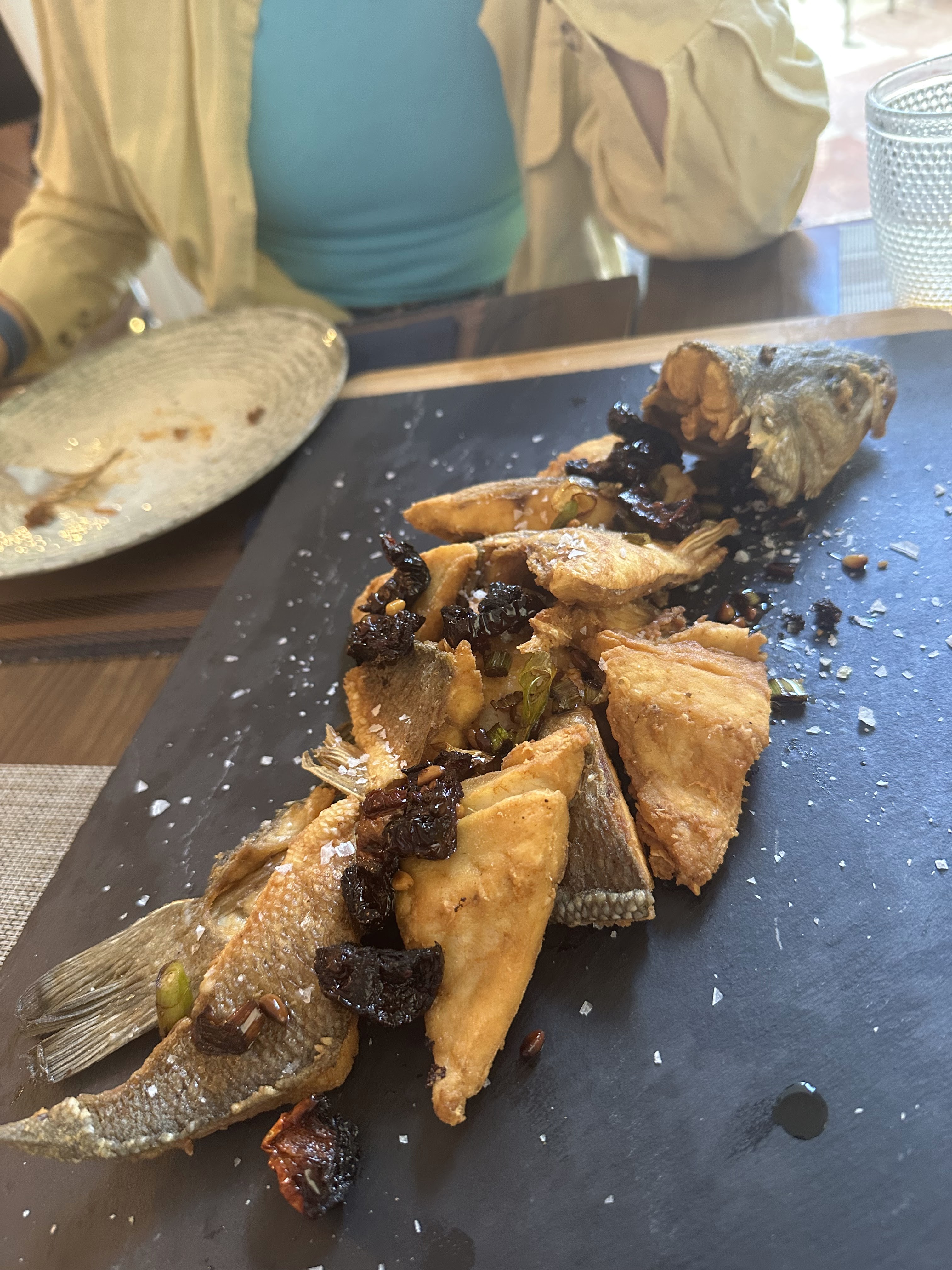 -Lubina frita con pericana de tomate seco, ajos tiernos y piñones (de buen tamaño y rica)
