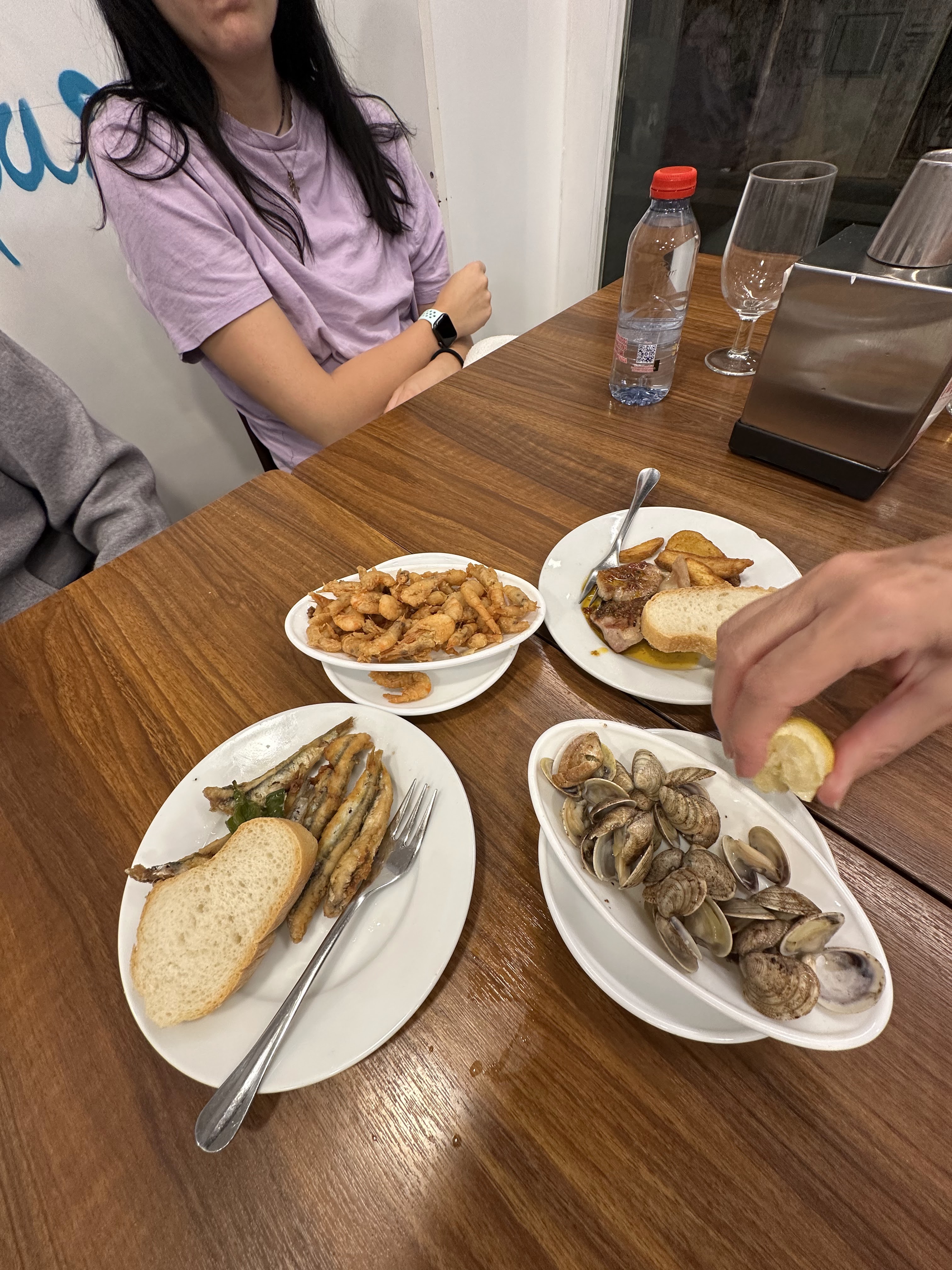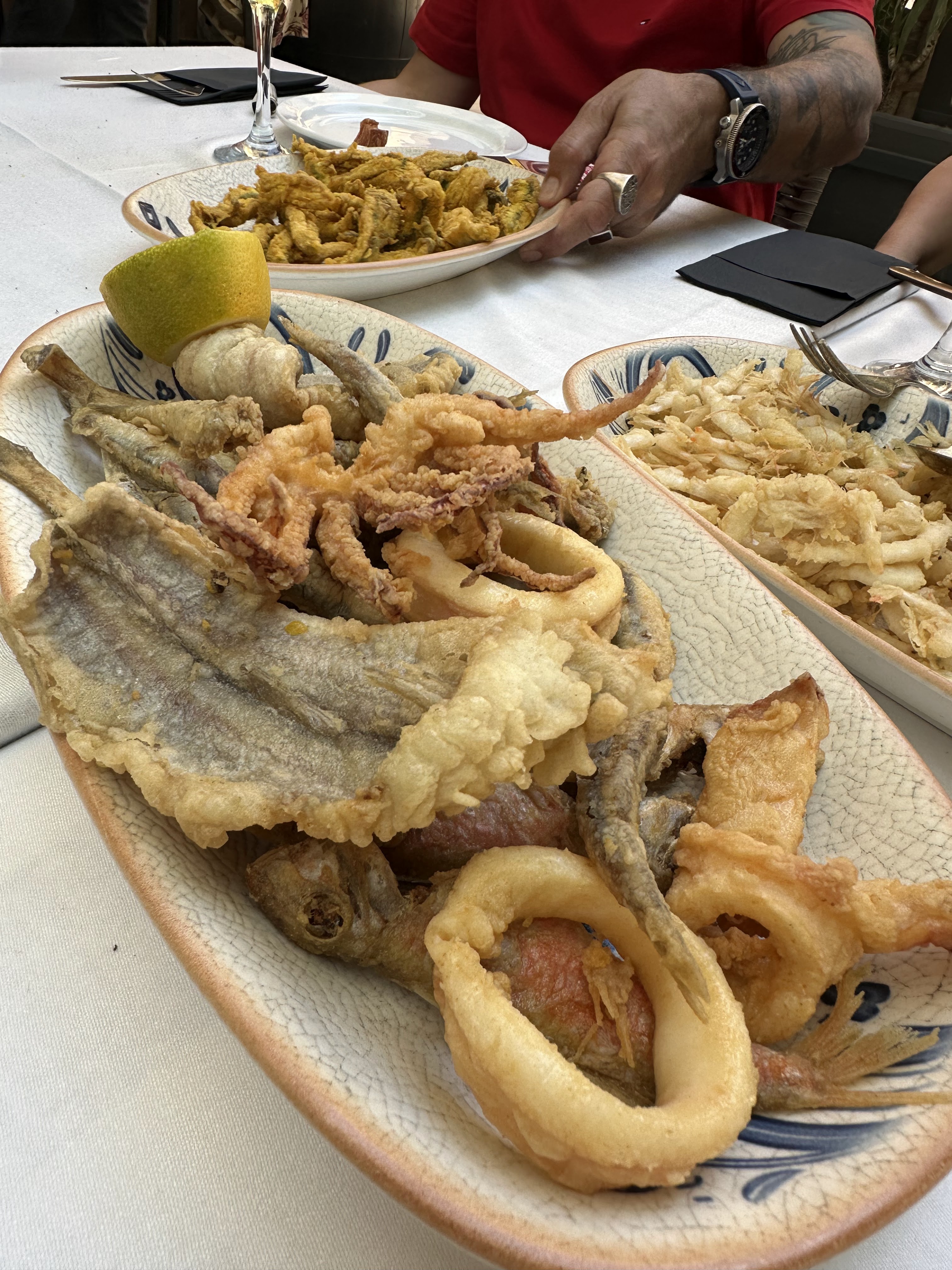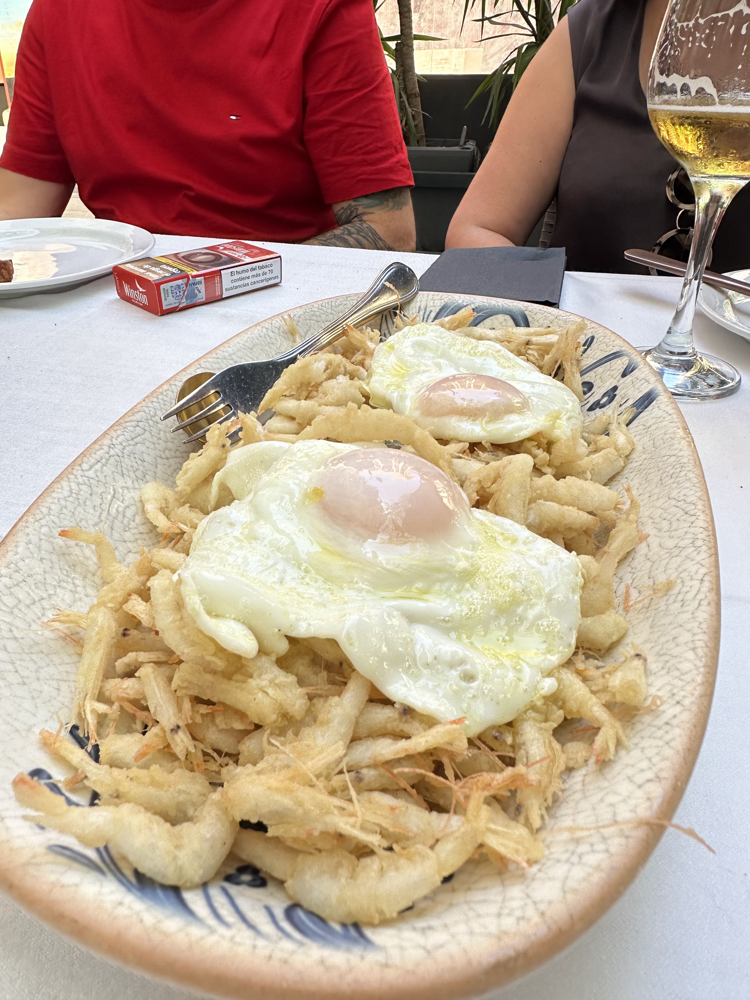 Cañas de Alhambra (cayeron 19…ya todos incorporados) y tomamos tapas como la gambita frita, patatas alioli y boquerones, secreto, hueva frita, mejillones vapor, burguer c/queso, burguer, croquetas pollo, champiñones salsa verde, boquerón plancha, boquerón frito, bacalao frito, atún plancha y almejas. También pedimos como ½ ración salmonete frito (16 eur).