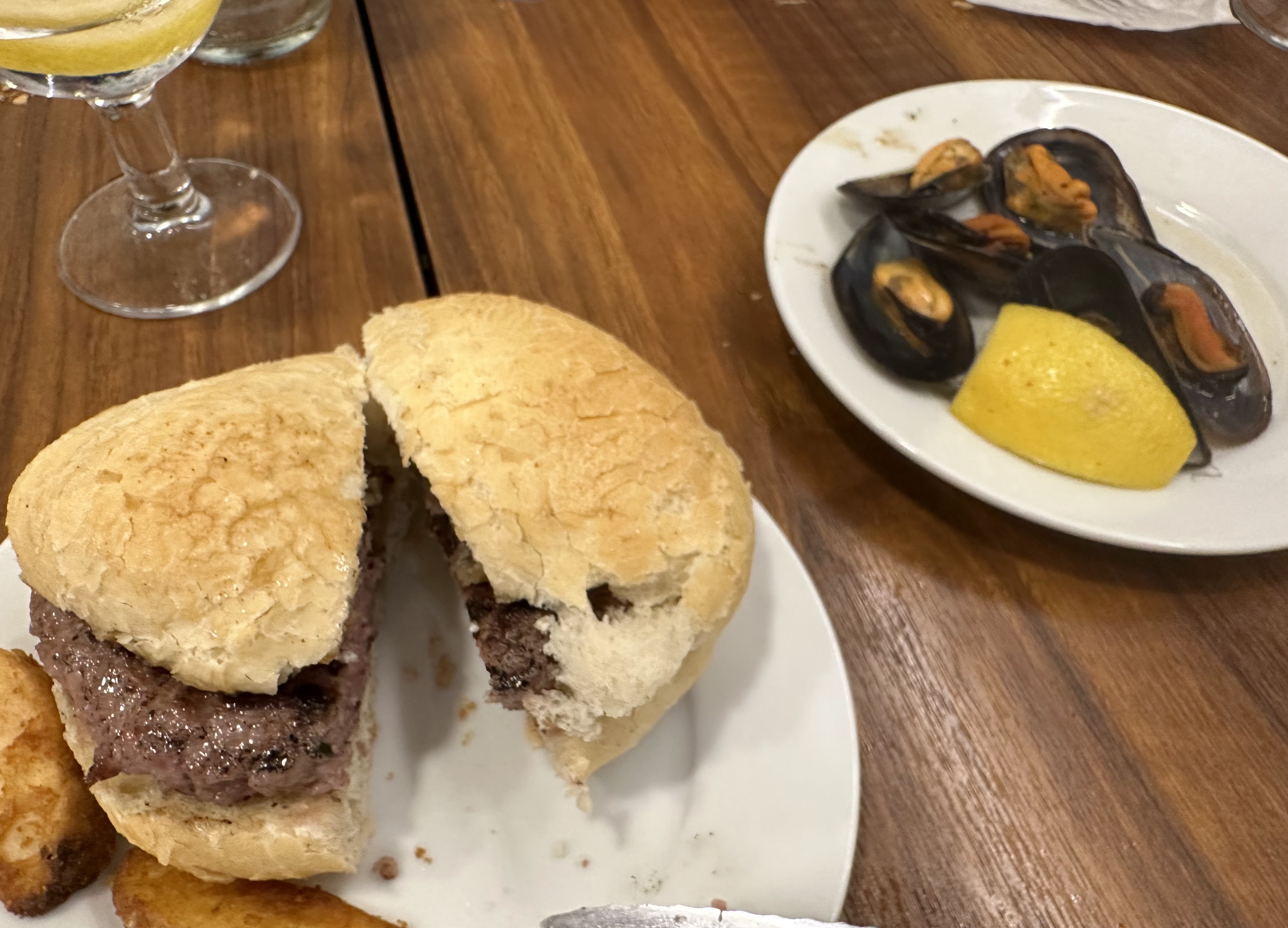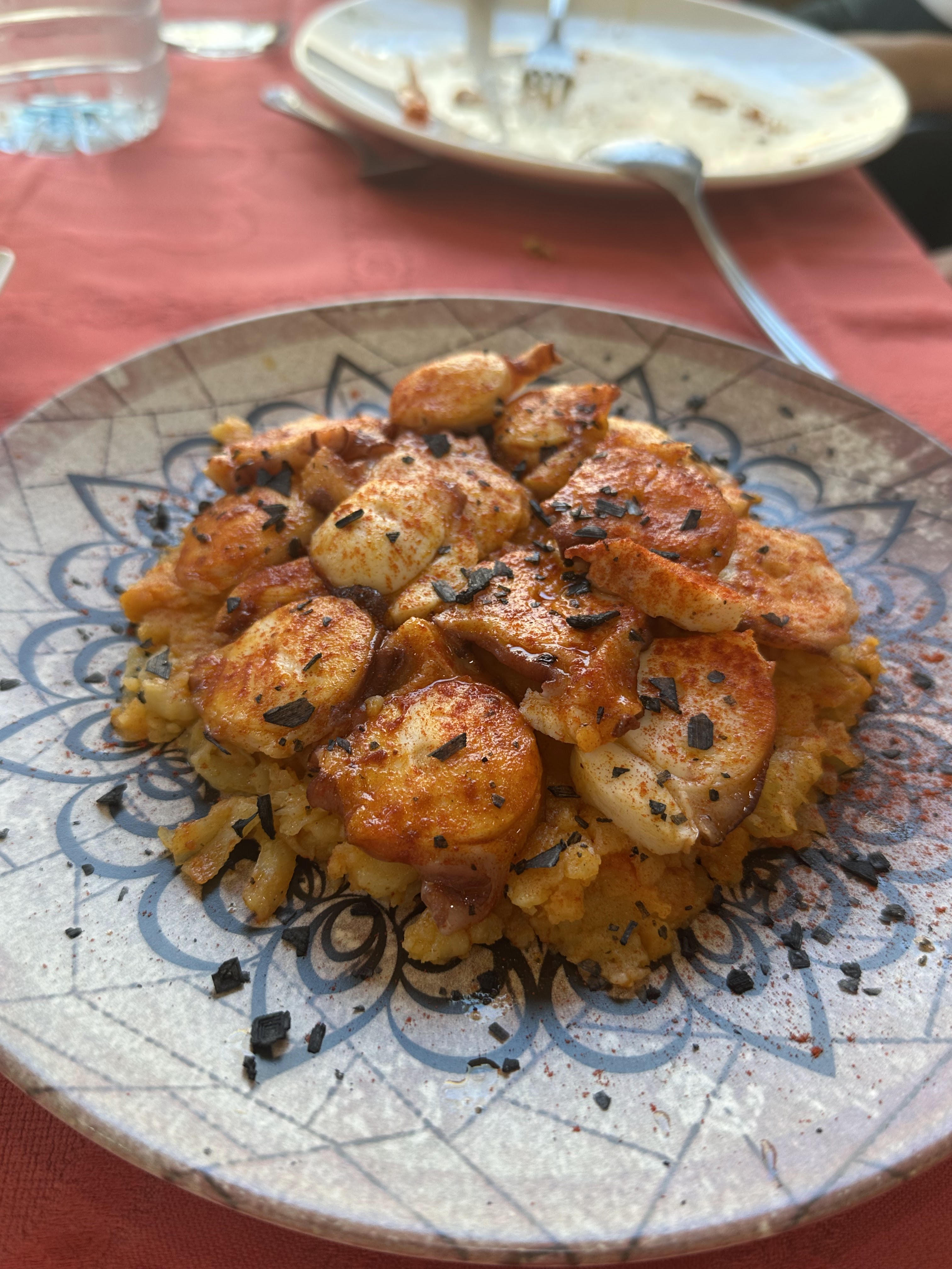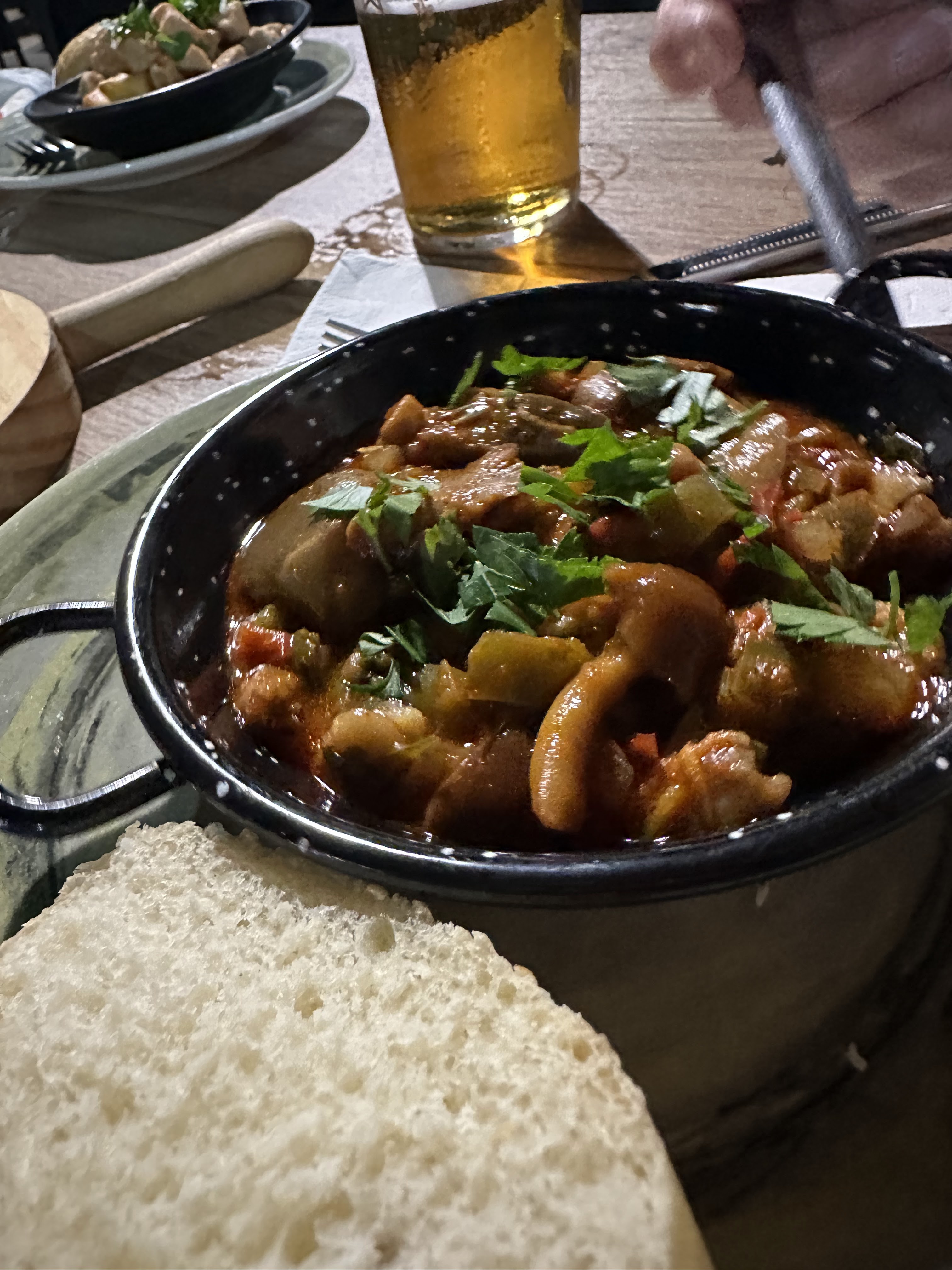 Cañas de Alhambra (cayeron 19…ya todos incorporados) y tomamos tapas como la gambita frita, patatas alioli y boquerones, secreto, hueva frita, mejillones vapor, burguer c/queso, burguer, croquetas pollo, champiñones salsa verde, boquerón plancha, boquerón frito, bacalao frito, atún plancha y almejas. También pedimos como ½ ración salmonete frito (16 eur).