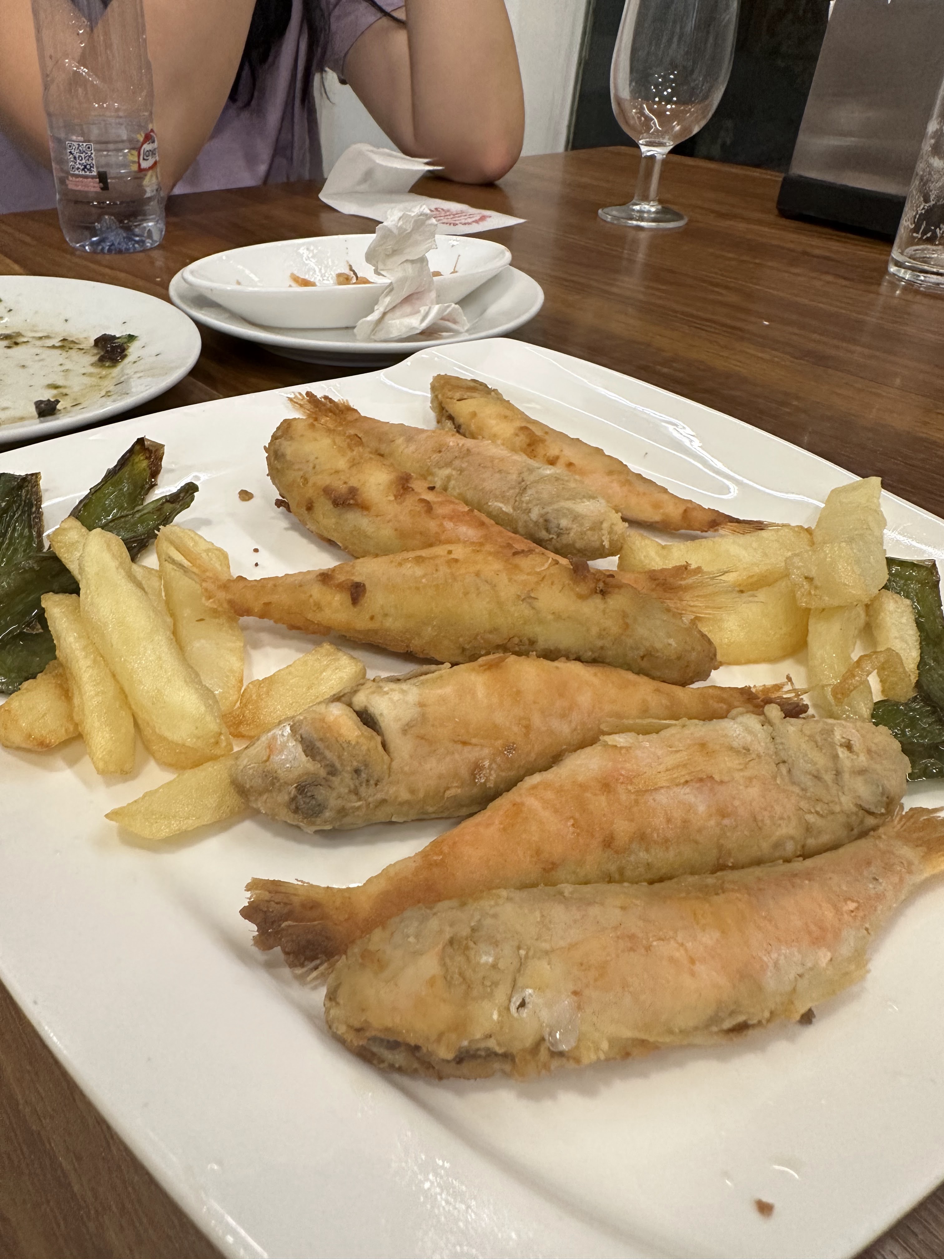 Tomamos torreznos, gambas de cristal, ½ ración de boquerones en adobo y una fritura de pescado.