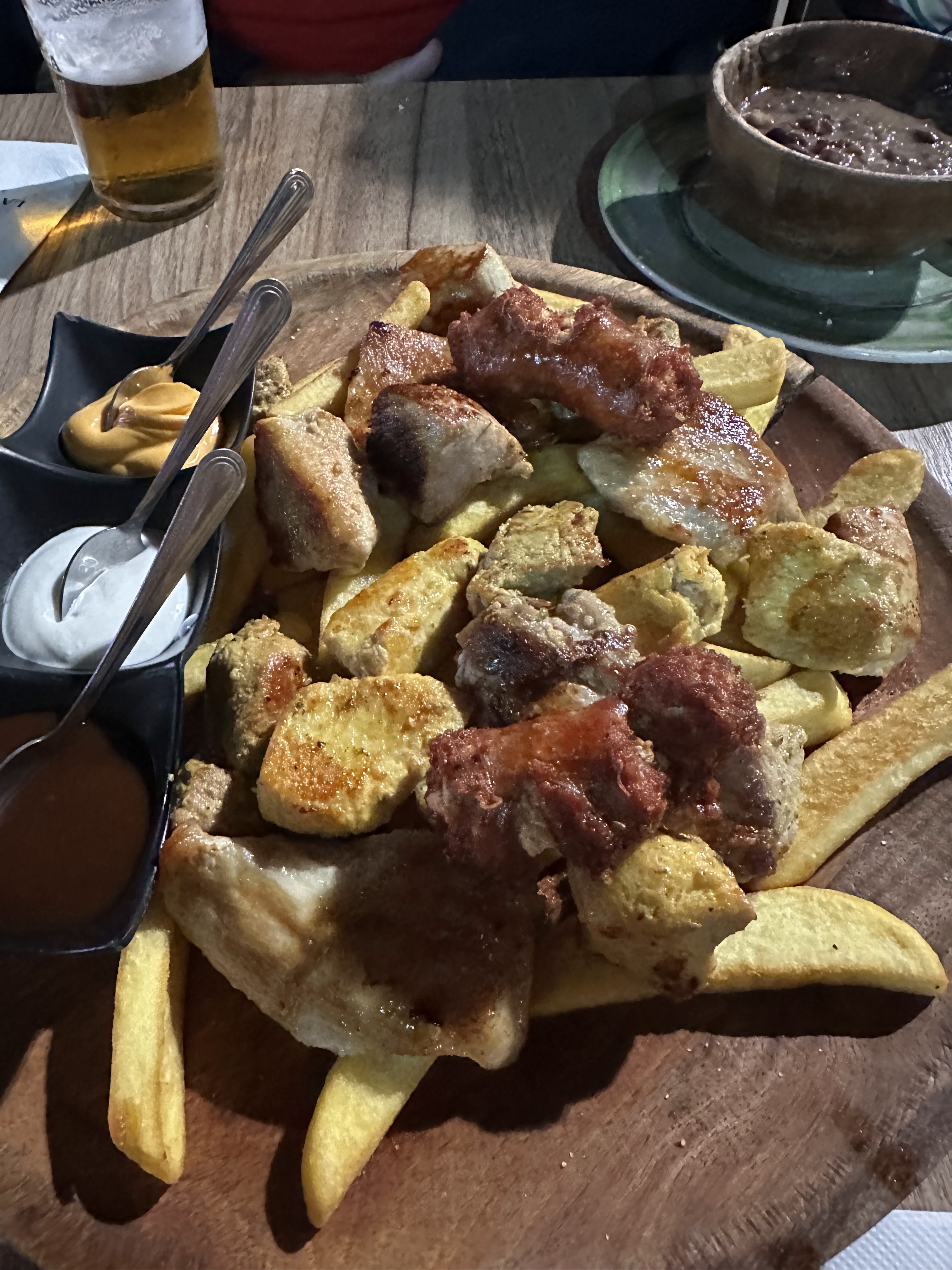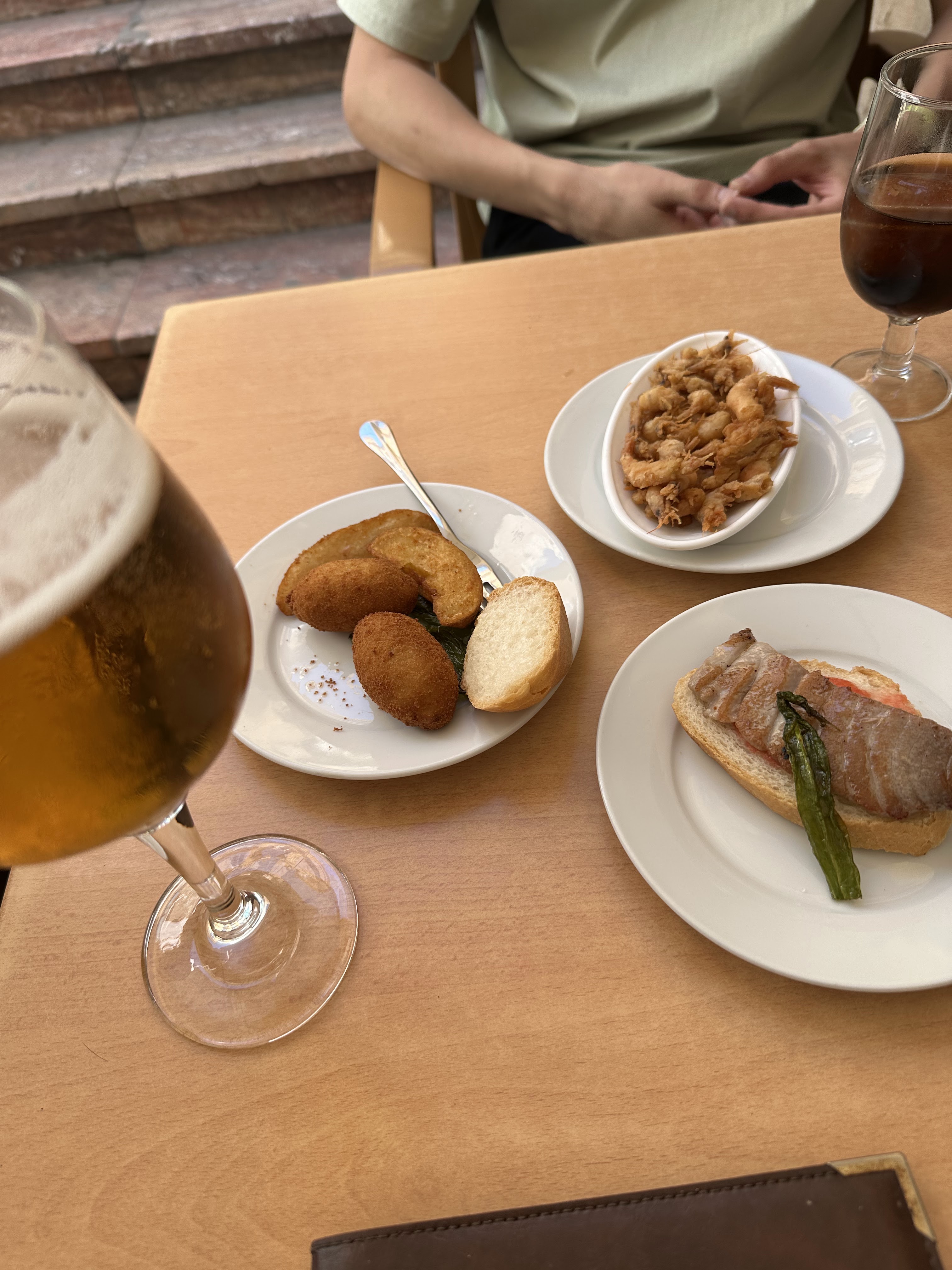 Copas de cerveza a 3,50 eur c.u. (tomamos 12) y al estar sentado en mesa desde inicio, solo pusieron tapa con la primera, un fuentón de buñuelos de bacalao para 7 que éramos. Agua grande, 2,50 eur.