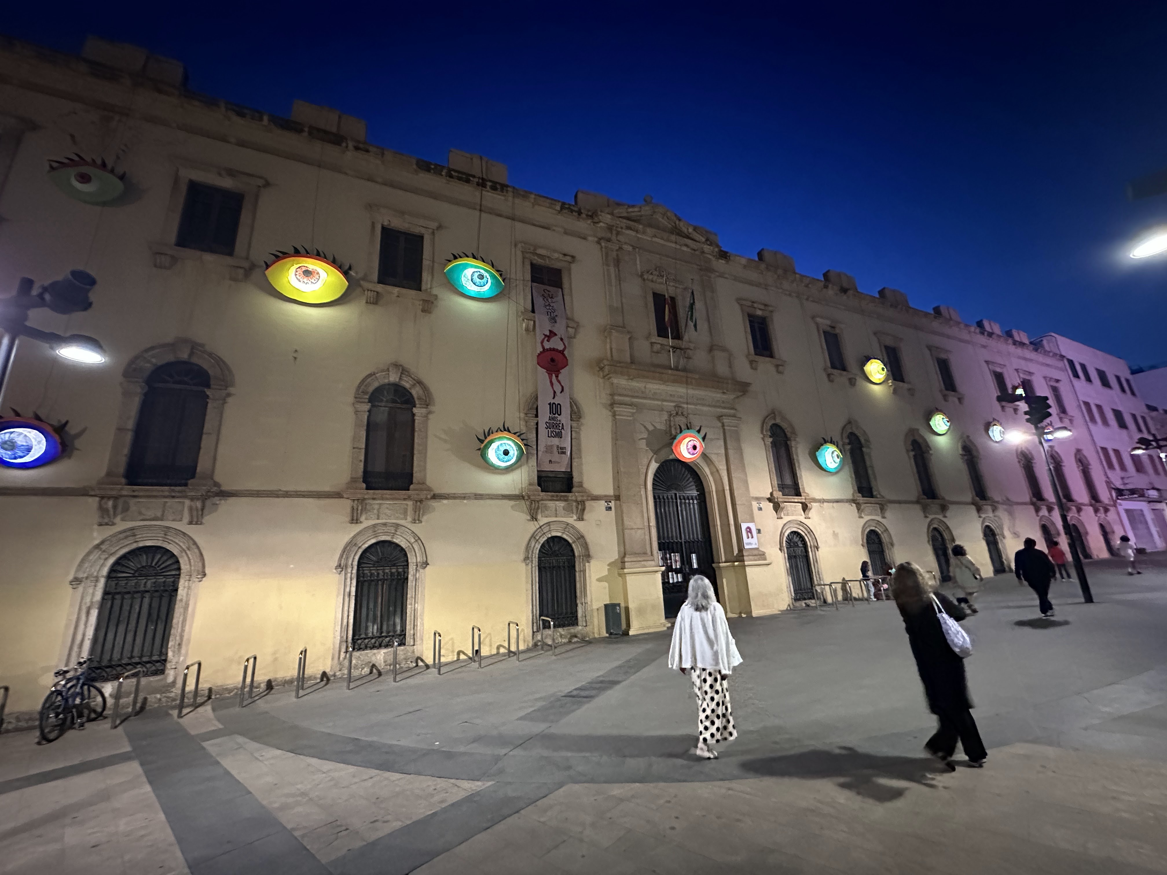 Luego la plaza Pablo Cazard donde se encuentra la Escuela de Arte y Superior de Diseño Carlos Pérez Siquier. En la fachada del edificio de ésta anuncio de la exposición «100 años de Surrealismo» y unos ojos luminosos alumbran ésta.