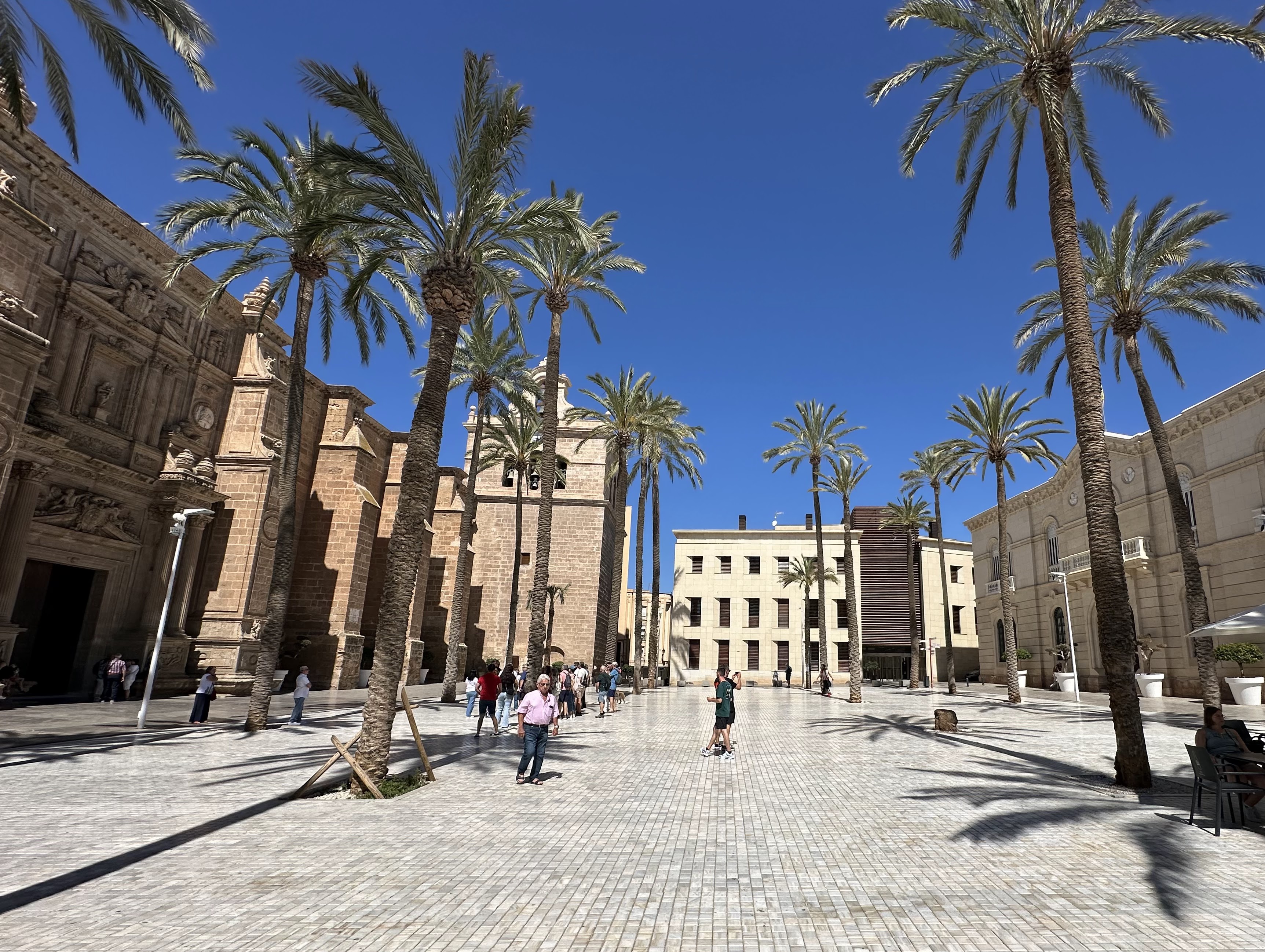 «La Plaza diseñada a mediados del siglo XIX, ha sufrido varias remodelaciones, la última en el año 2000. En ella destaca la monumental fachada que la preside de la catedral-fortaleza, del siglo XVI, con su portada principal renacentista.