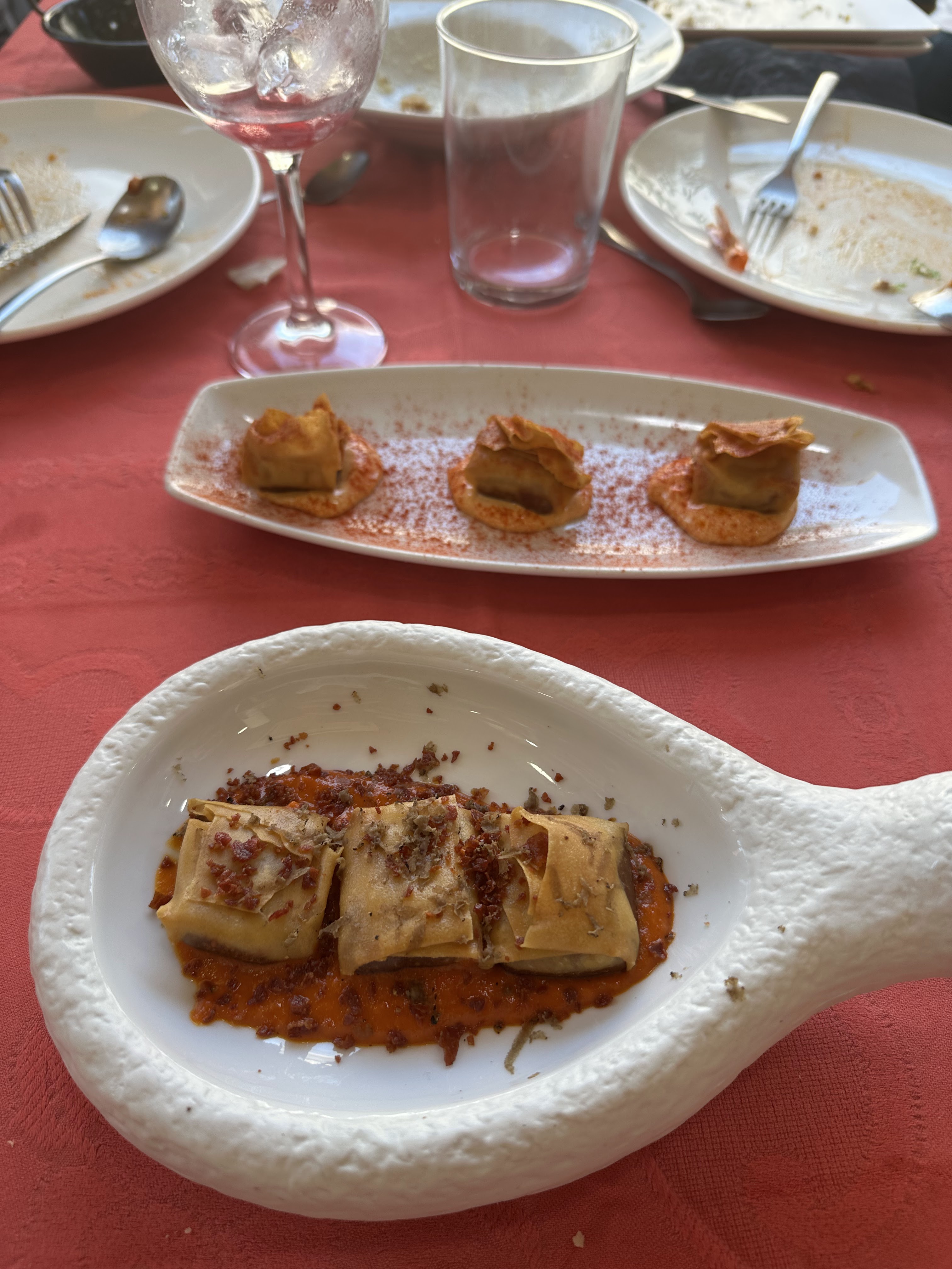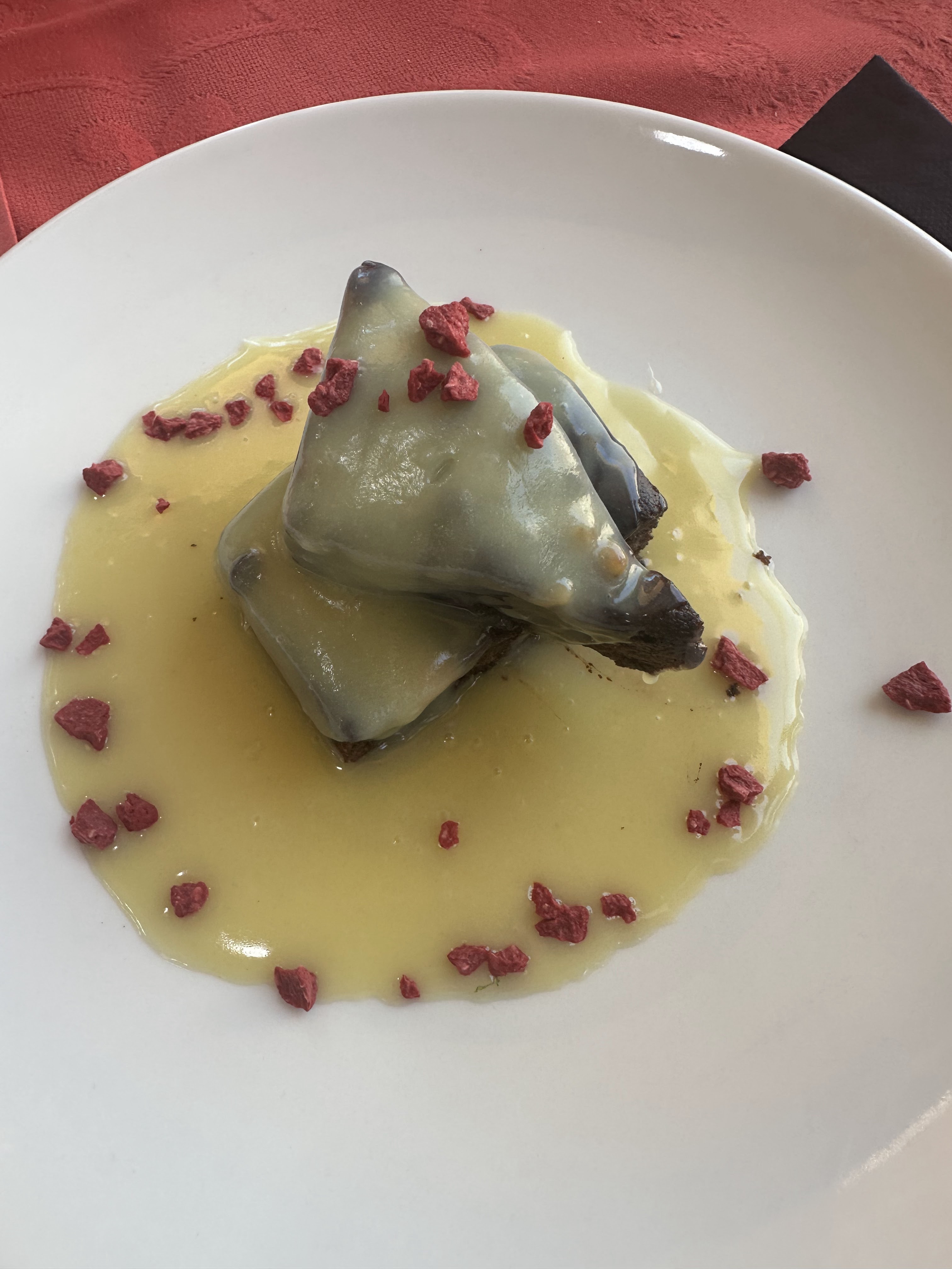 2 raviolis crujientes de secreto, cebolla caramelizada y jamón, c/mojo boletus, trufa negra y polvo de ibérico.