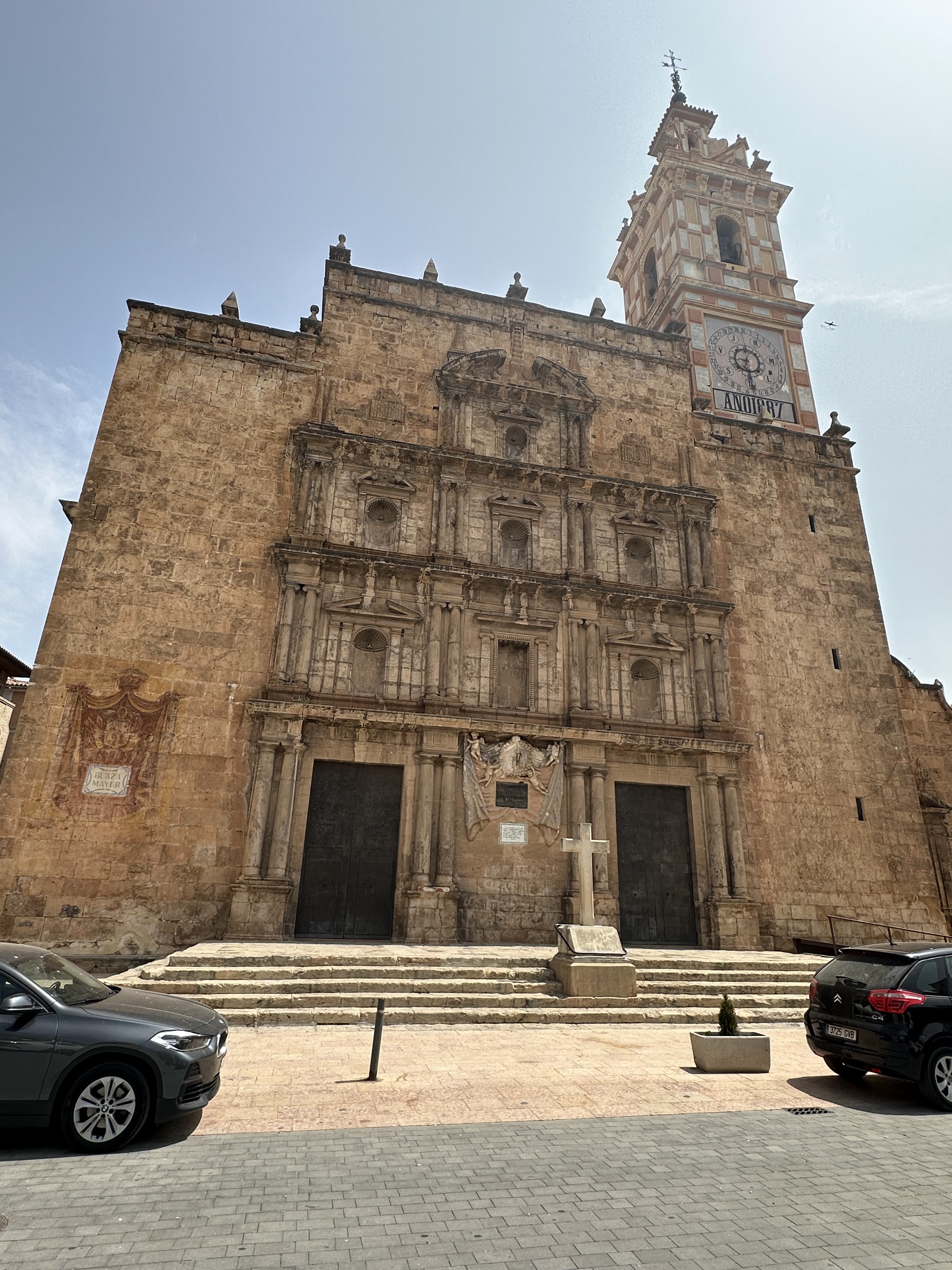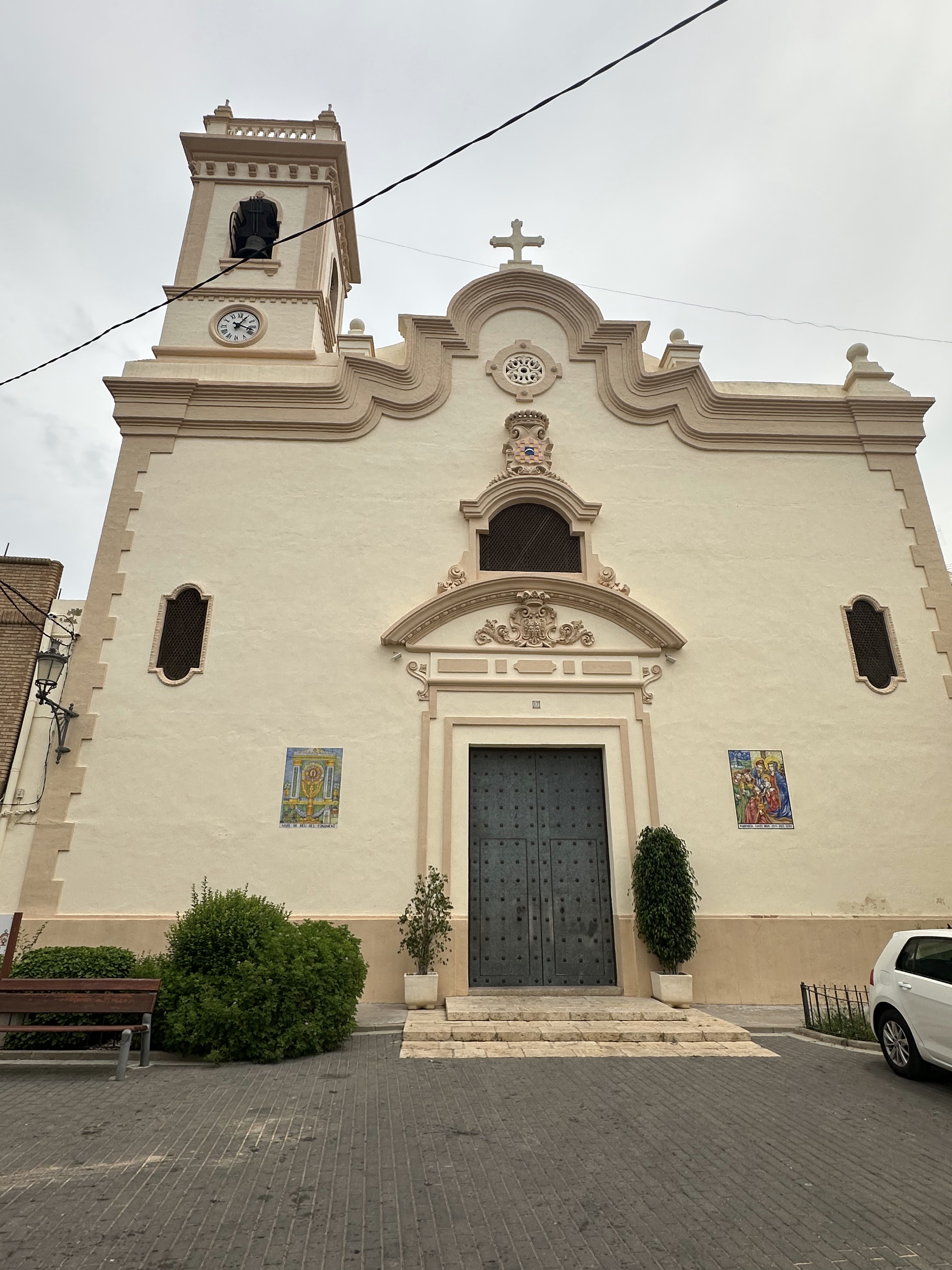 Se atribuye a Juan Bautista Pérez Castiel la exuberante decoración barroca interior, la gran cúpula de media naranja y el campanario considerado el primero del Barroco Valenciano. Con casi 60m. de altura, esta torre culmina con un original reloj, de propiedad municipal que señala las horas, días de la semana y el mes.»