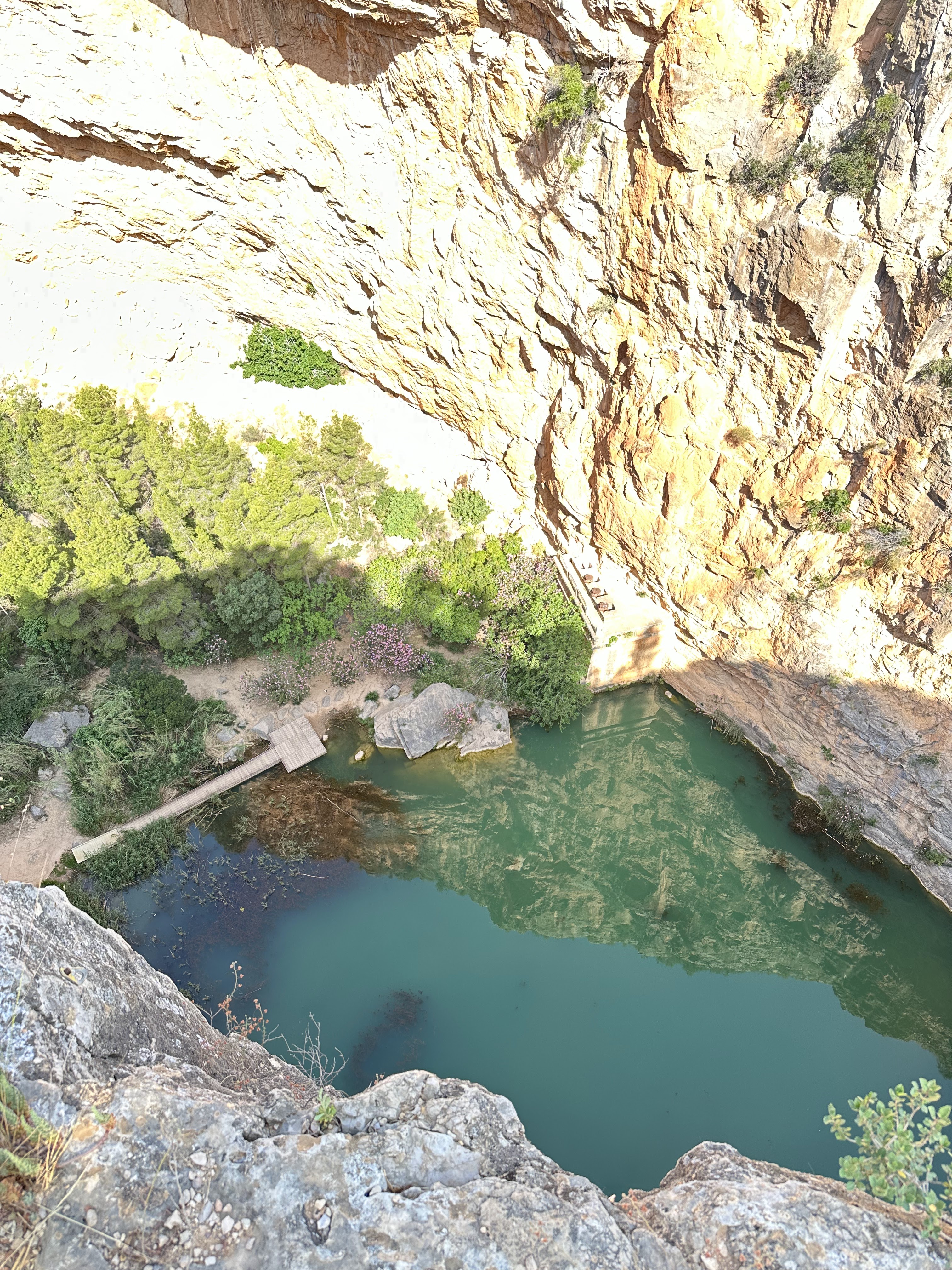 Ya en el Charco Azul veremos unas pasarelas ancladas a la pared. Dichas pasarelas están en muy mal estado, por lo que no hay que intentar cruzarlas ni subirse en ellas. Actualmente están cerradas y no se debe acercar a ellas.