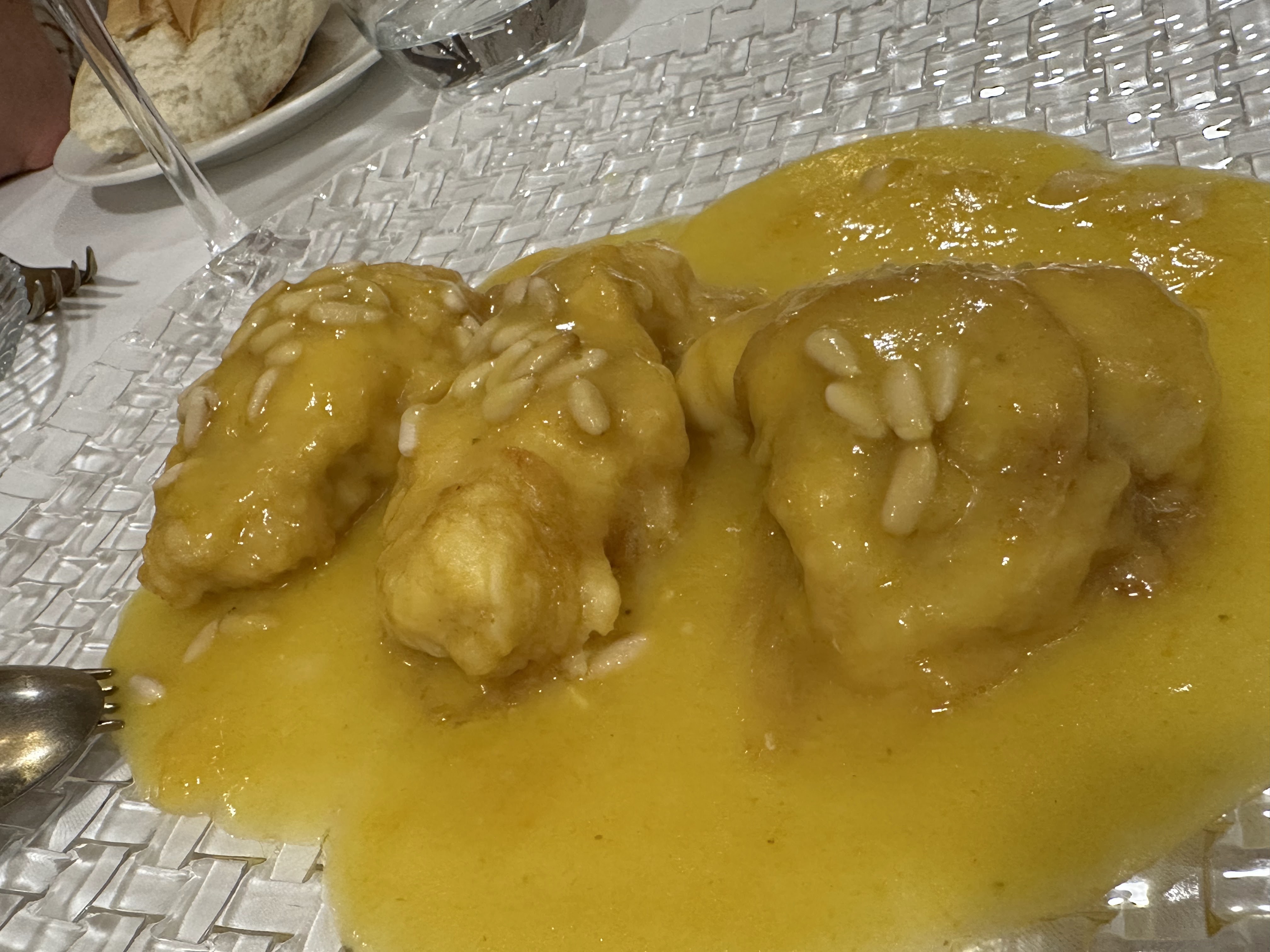 *Patatas bravas; chipirones fritos; saquitos de setas y tataki de atún rojo. De postre : Sopa de mango con helado.