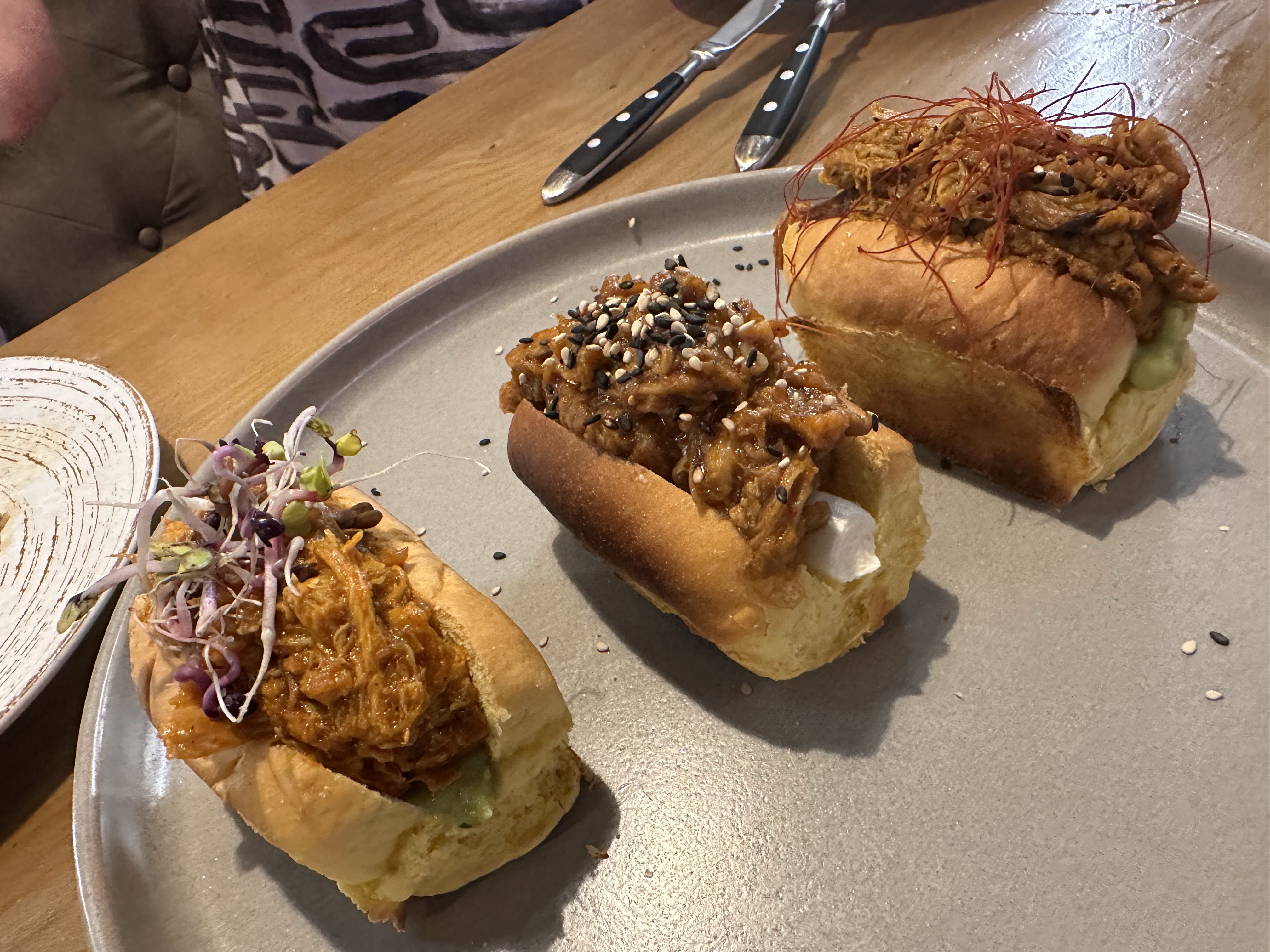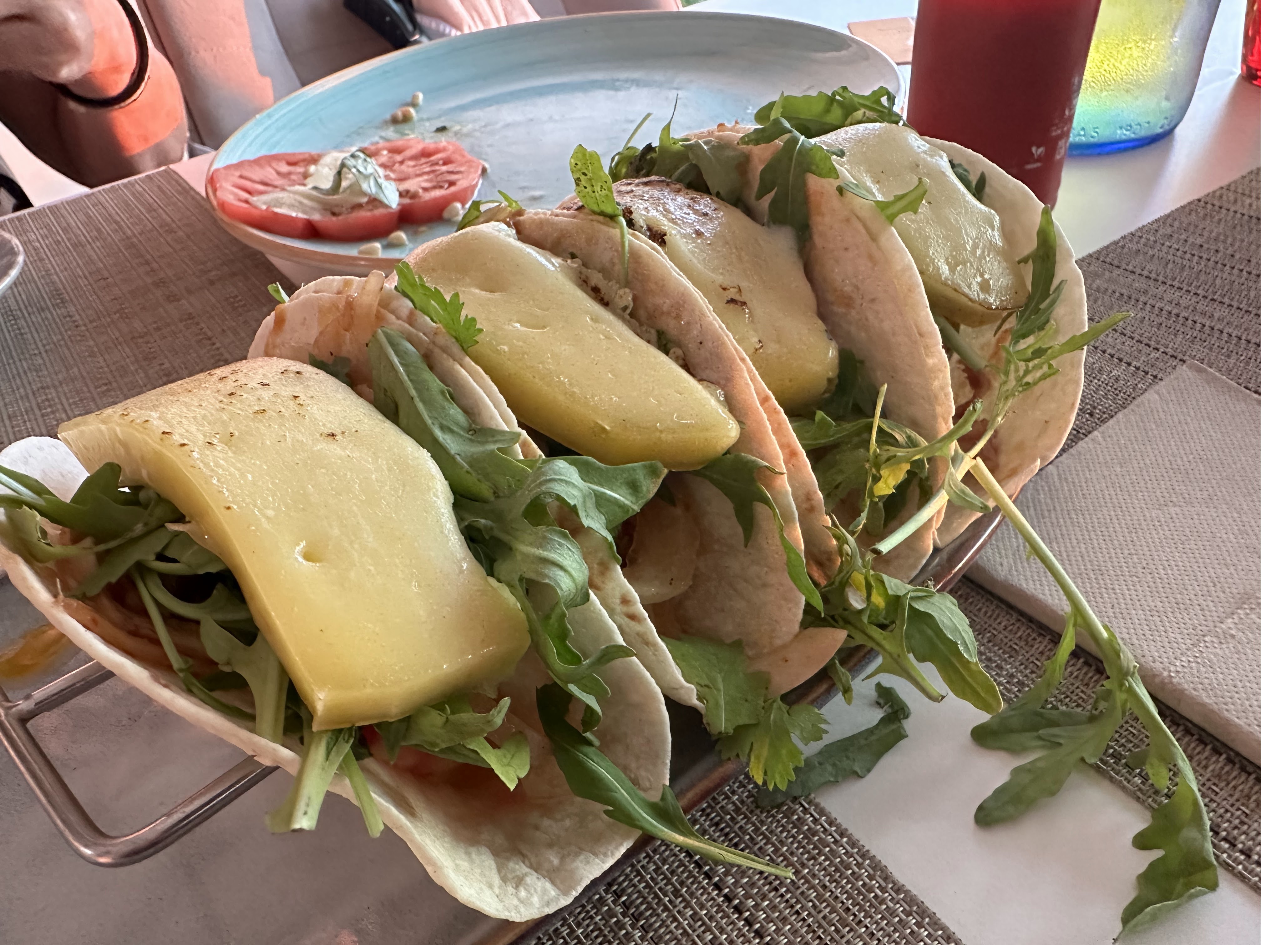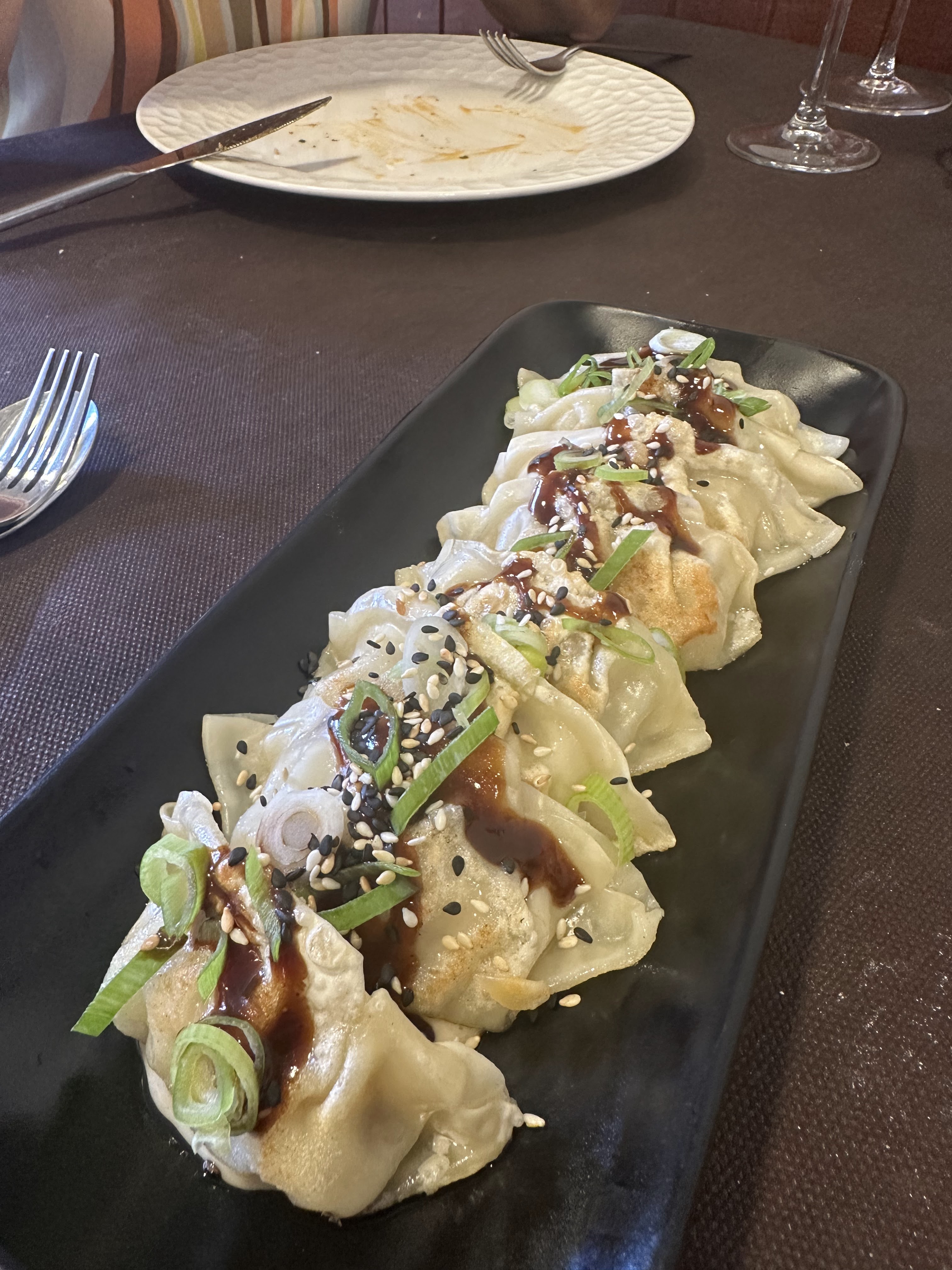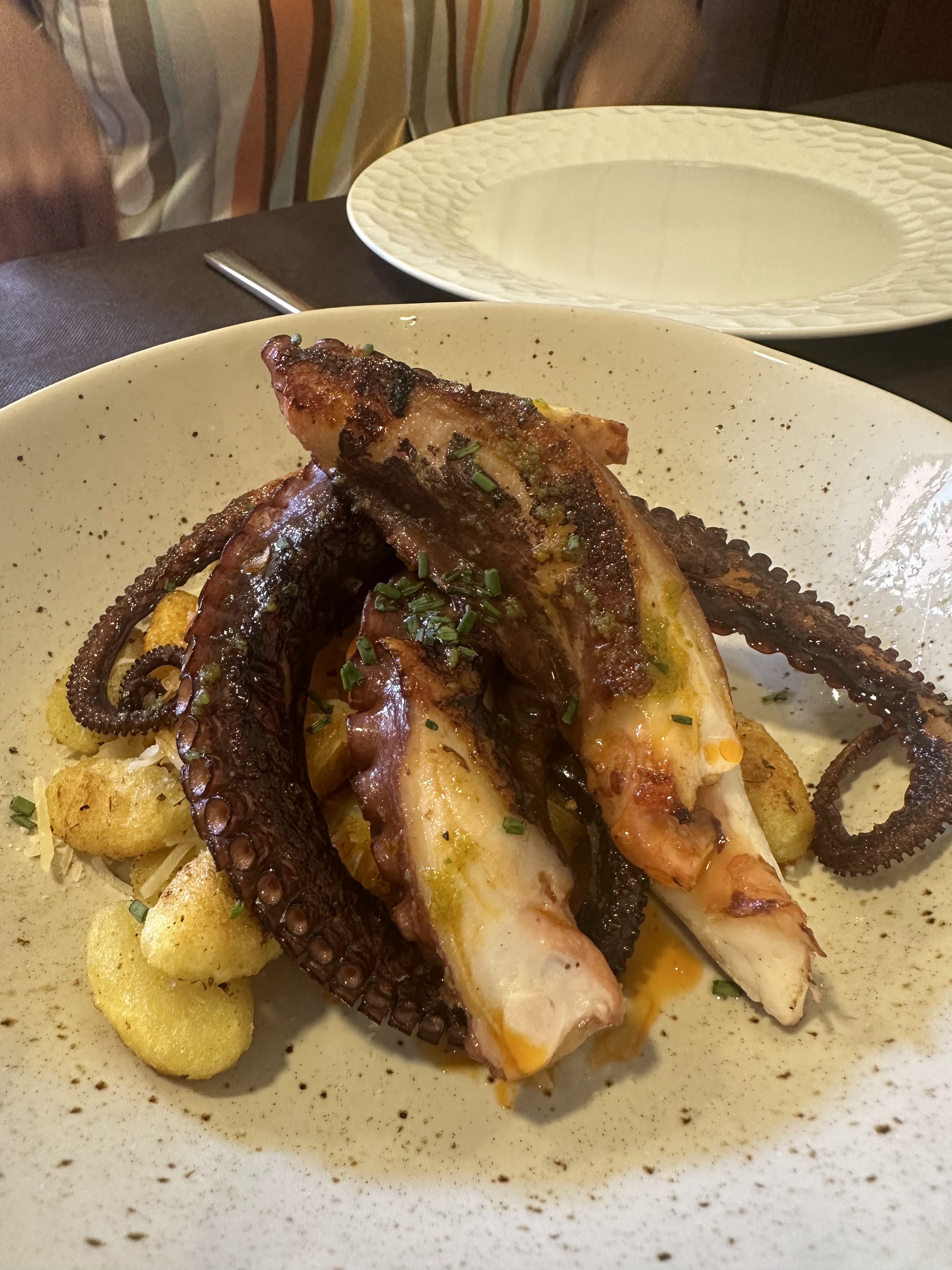 *Pulpo a la plancha con gnochis y parmesano; tapa de croquetas de la casa; gyozas de carne y verduras y croca de vaca al pil-pil de piquillos y chimichurri.