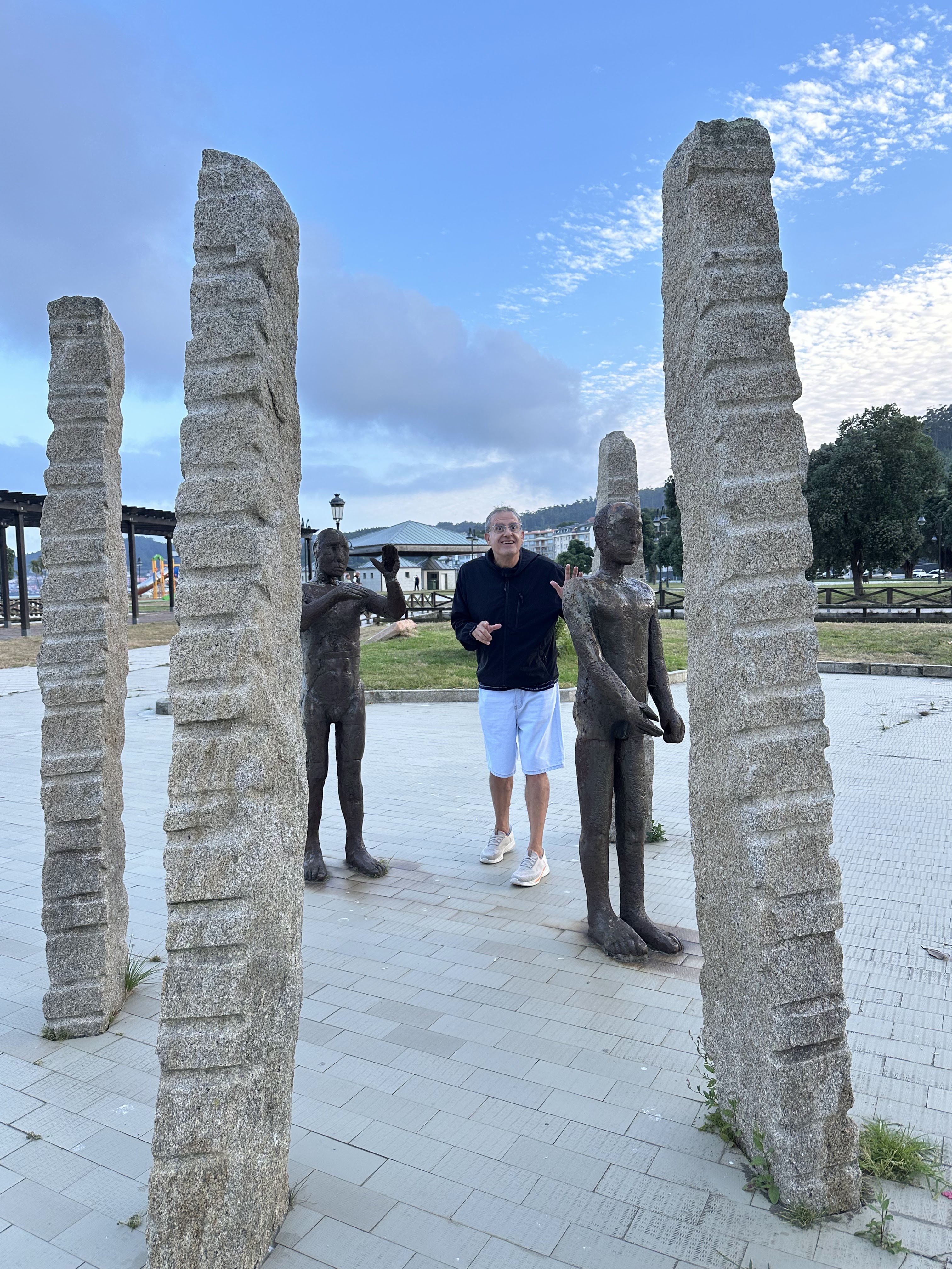 De paseo por la plaza 8 de marzo con sus esculturas/monumentos de una aleta pescado, escultura de la mujer peregrina, etc.