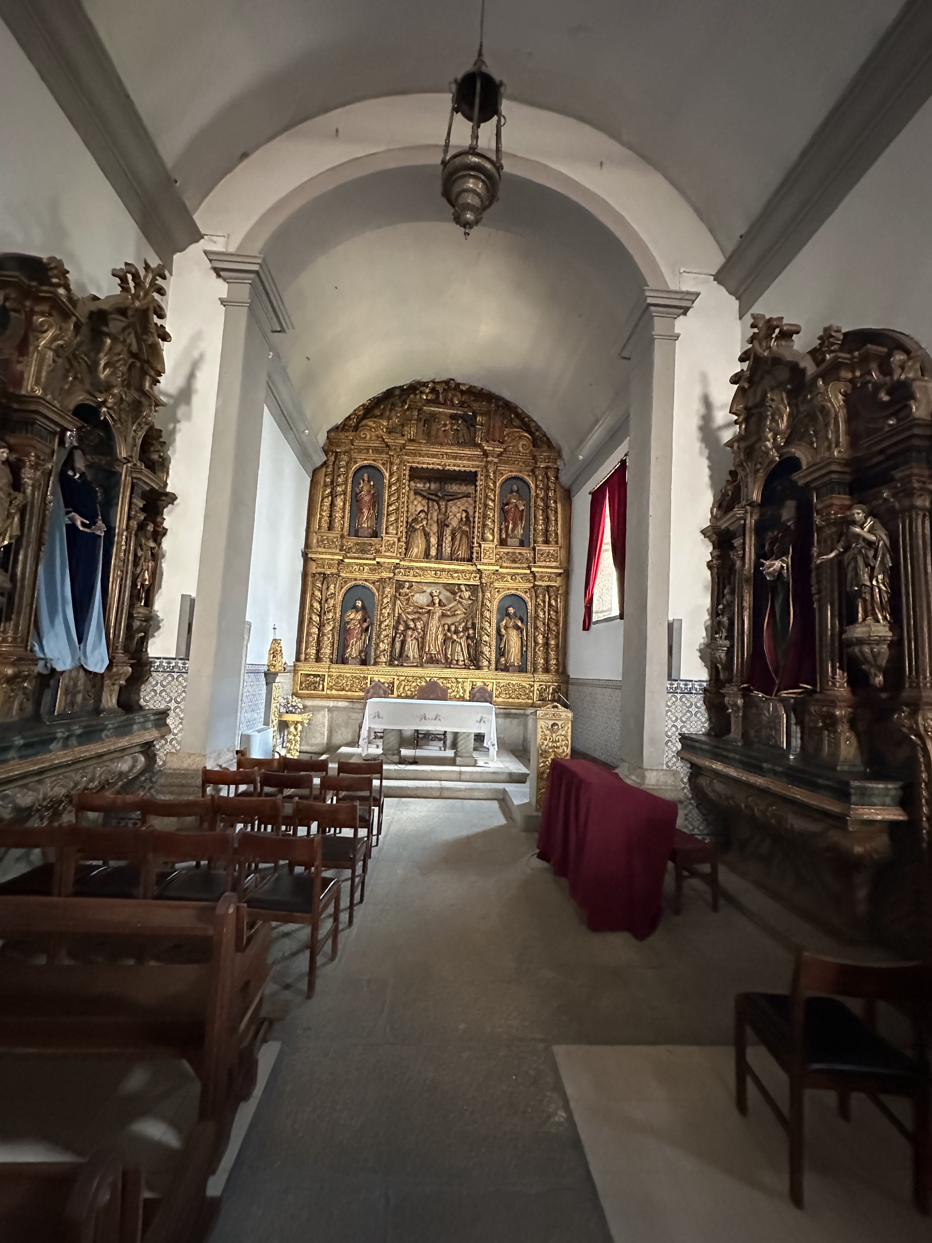 En los fines del siglo XVII, el altar mayor sería dotado con un valioso retablo manierista (como figura central N. S. de la Misericordia). En una capilla anexa, puede admirarse una bella imagen del Señor de los Pasos, de los fines del siglo XVIII. El revestimiento a azulejos de la frontera es de la segunda mitad del siglo XIX.»
