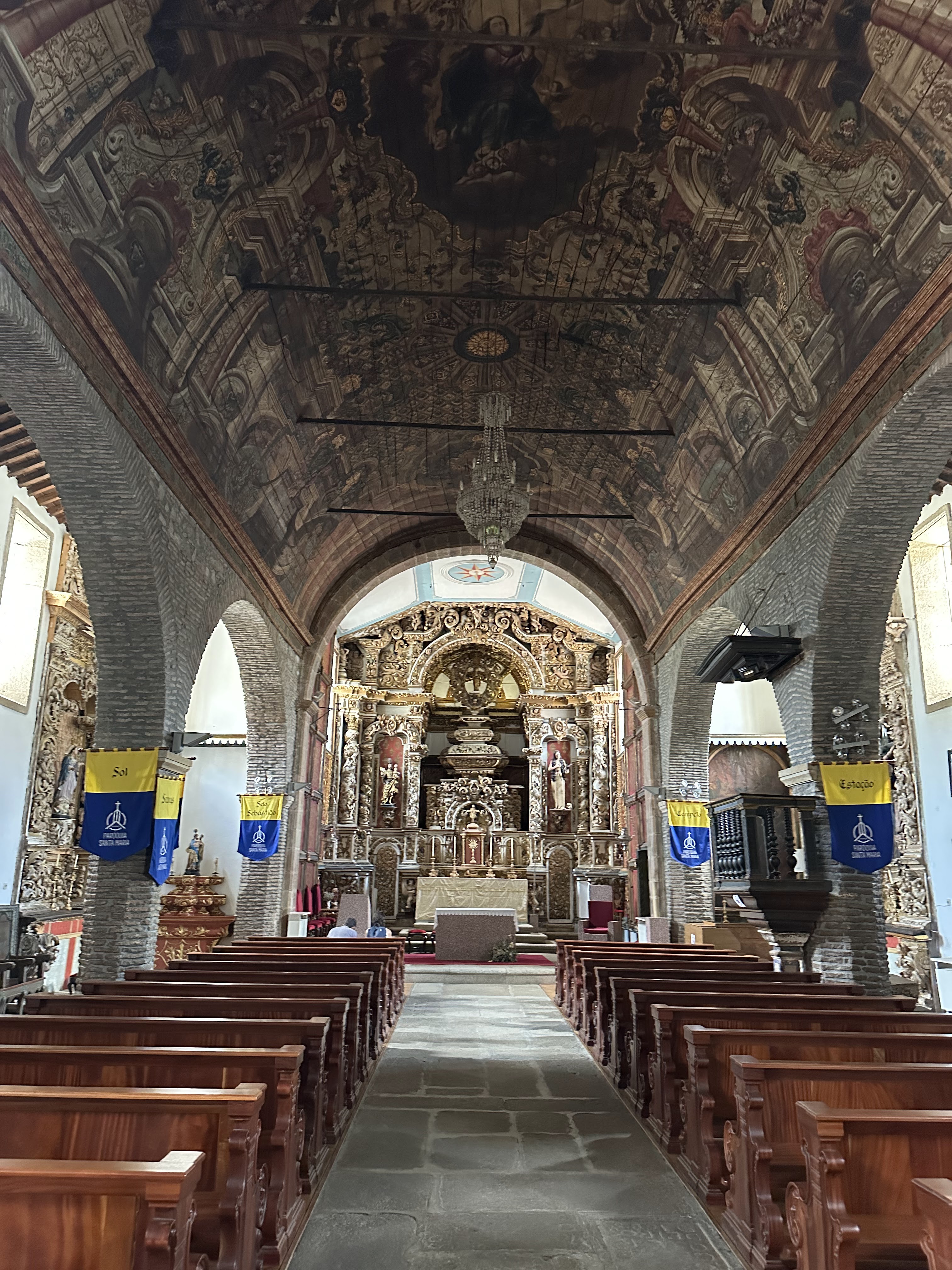 Su interior está formado por tres naves separadas por columnas poligonales, que sostienen los arcos y una pintura escenográfica, en la cubierta del cuerpo de la Iglesia, representando la Asunción de la Virgen. Aún se destaca la capilla mayor y la capilla de los Figueiredos, el retablo a San Esteban y la imagen de Santa María Magdalena.»