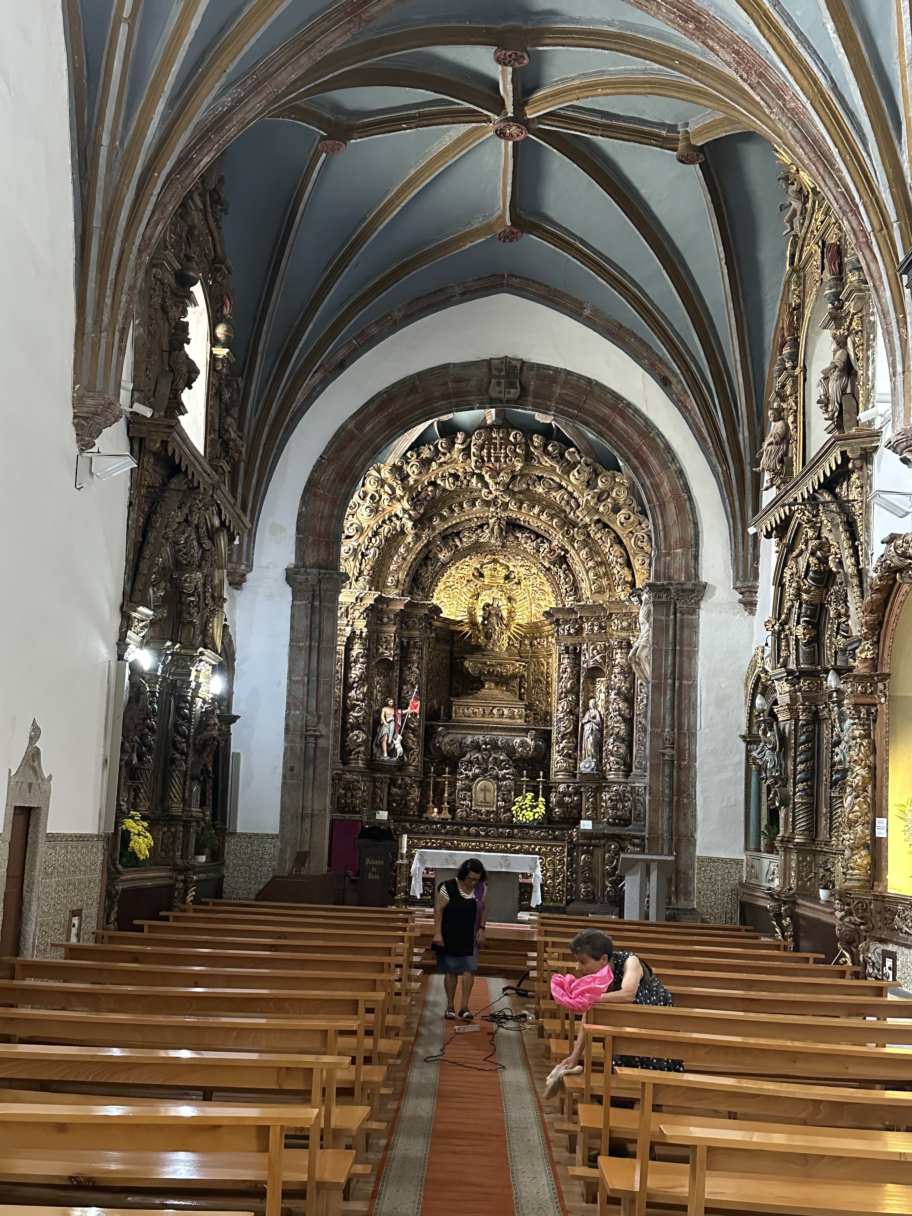 Su interior presenta una gran profusión de maderas doradas del siglo XVII y el presbiterio está ornamentado con una maravillosa bóveda pintada y dorada.