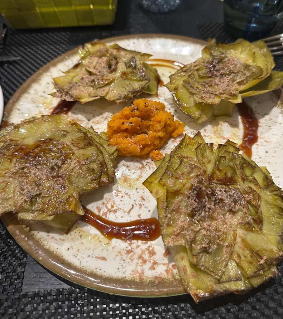 *Coquinas; alcachofas con foie y cachopo. *De Postre : Fondant blanco.