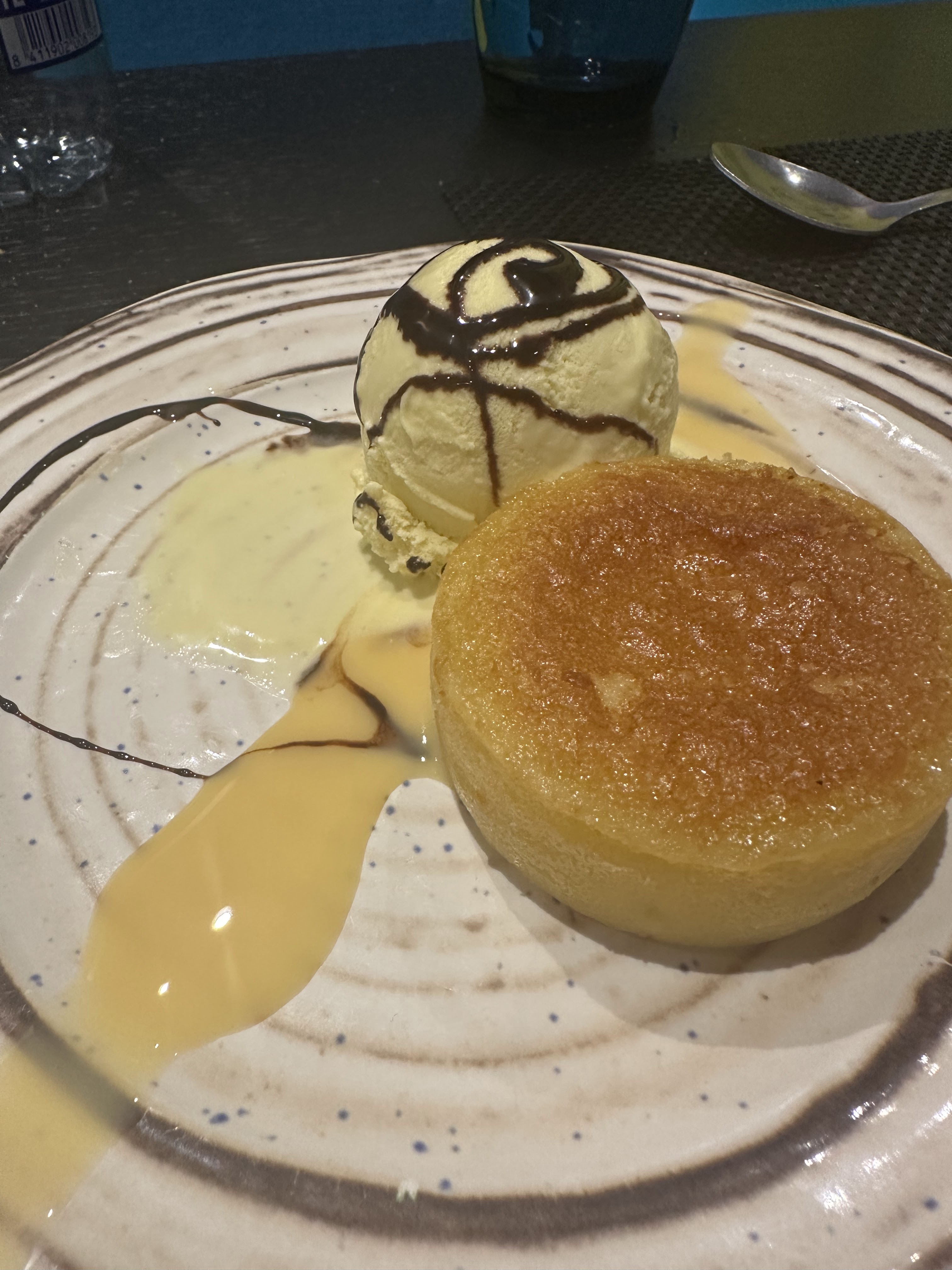 *De postre : Mousse de chocolate y Folhado de Maça caramelizada e amendoa com Helado (hojaldre). Buenos los dos.