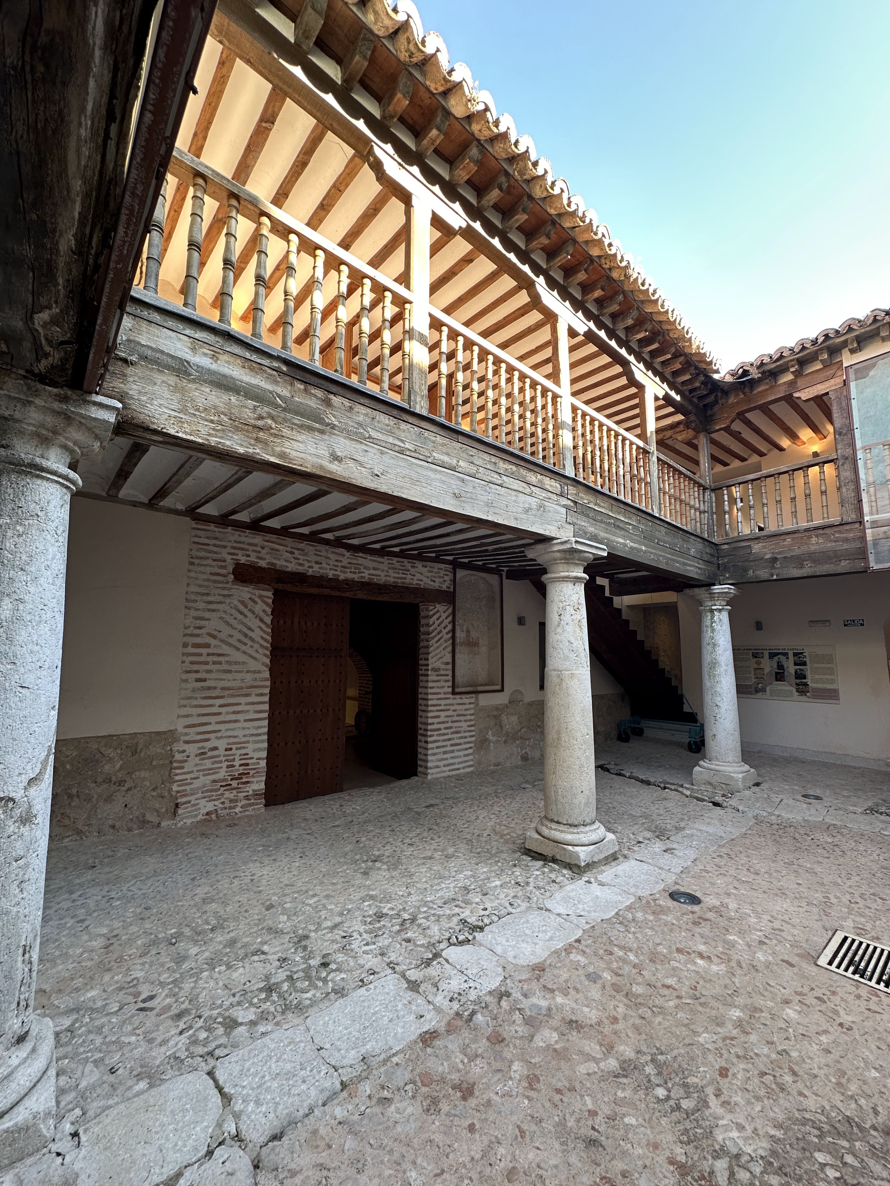 Accedemos a un patio interior columnado, claro ejemplo de arquitectura castellana. De las ocho columnas que soportaban los balcones corredizos, tan sólo cinco están a nuestra disposición visual. Ello es debido a que el s. XIX (1875) con la Desamortización de Mendizábal, todos los bienes religiosos fueron subastados públicamente, y este edificio no corrió diferente suerte por pertenecer a la Orden Militar de Santiago desde su construcción. El edificio completo fue comprado por la familia Rivera, que lo tiene en su poder hasta los años 40 del s. XX, momento en que es traspasada en 4 lotes a diferentes familias. Aunque el ayuntamiento ha recuperado la parte visitable del mismo, lo que fueran las celdas de los Freires de la Orden Militar de Santiago, cocinas, horno y aula de gramática, siguen siendo viviendas y propiedades particulares.