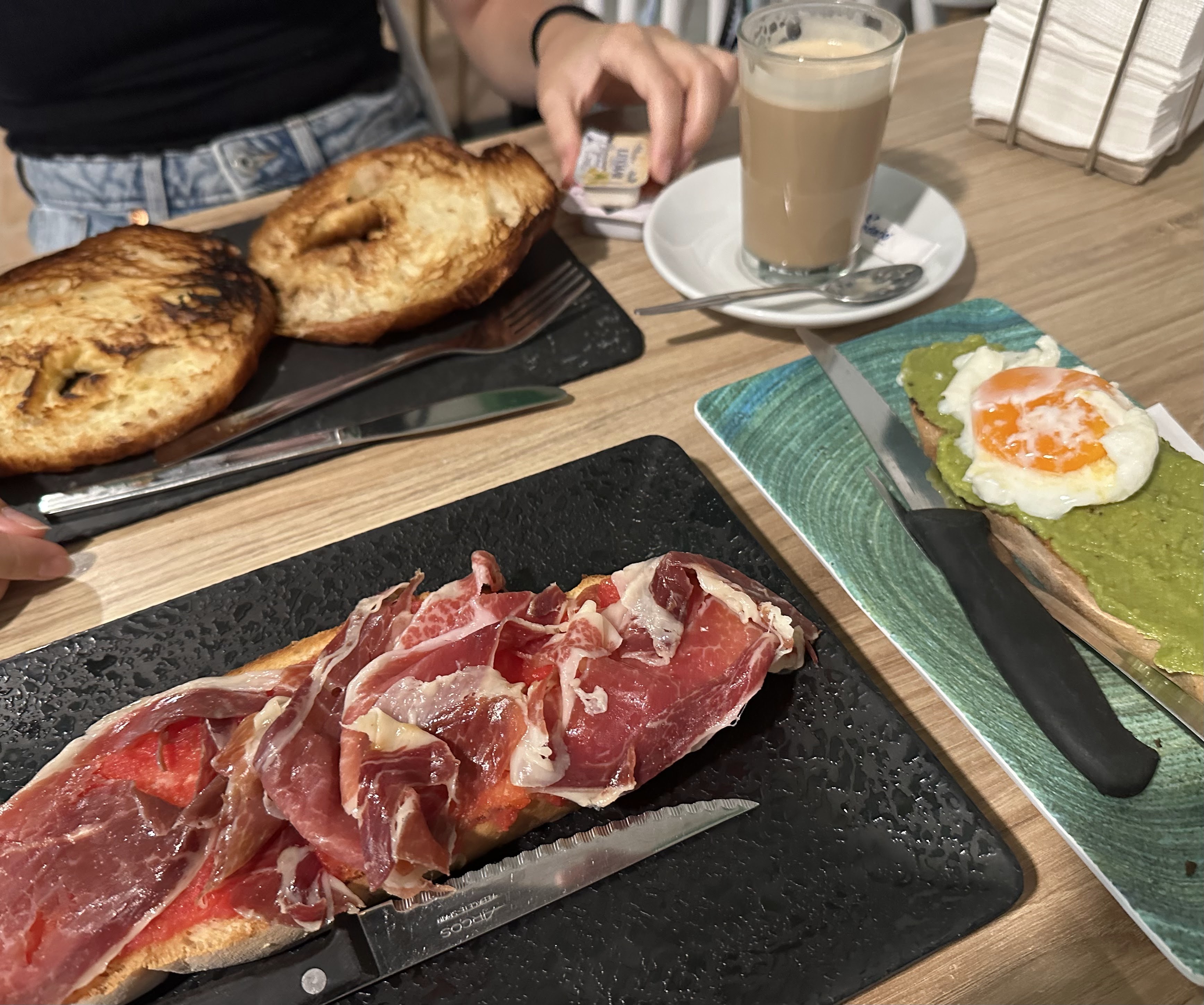 3 cafés con leche y 2 1/2 tostadas de jamón, y guacamole y huevo duro.