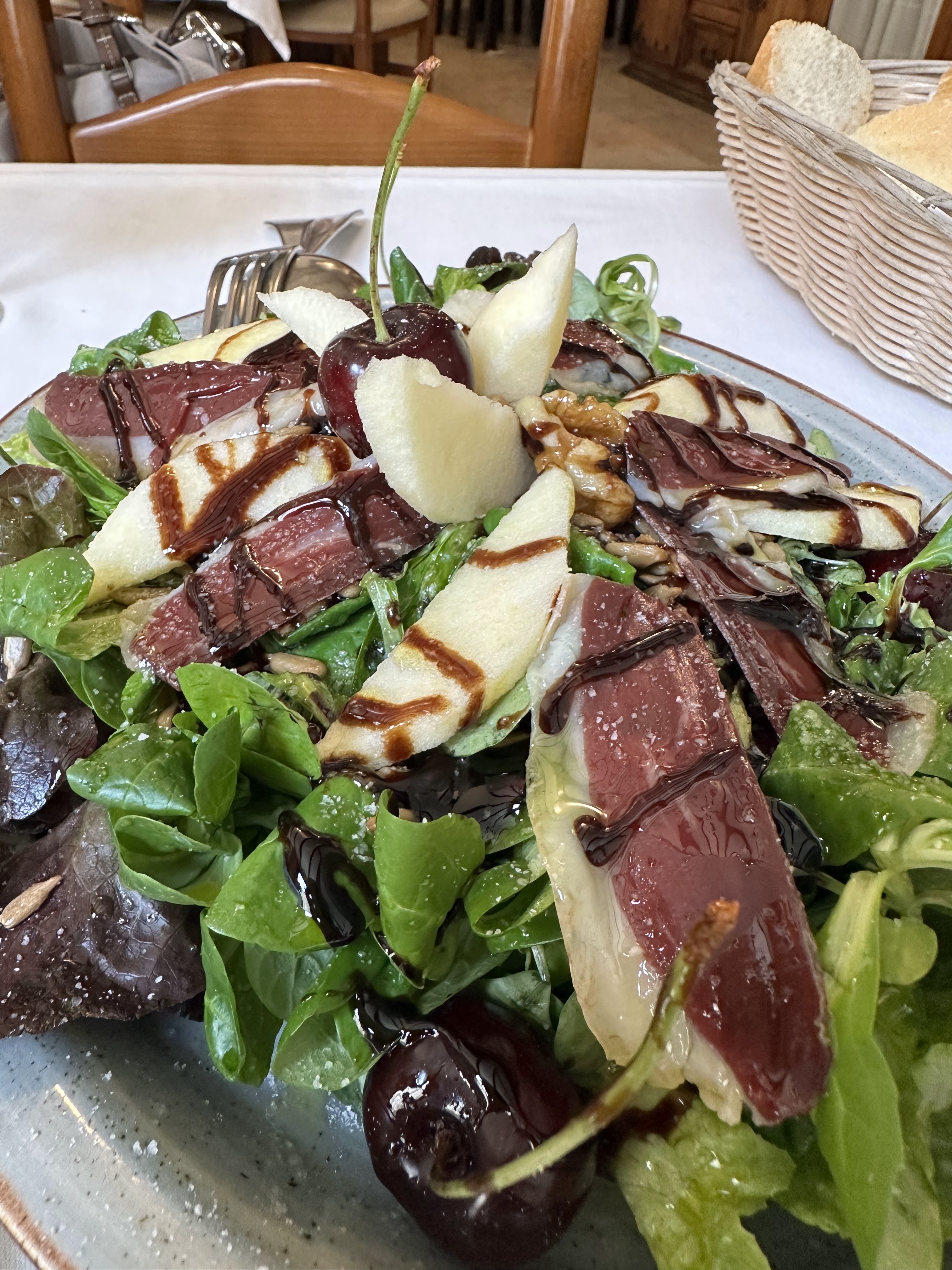 -Ensalada de canónigos, jamón de pato, manzana y cerezas (son de la localidad, ya os hablaré de éstas). Estaba buena, refrescante.
