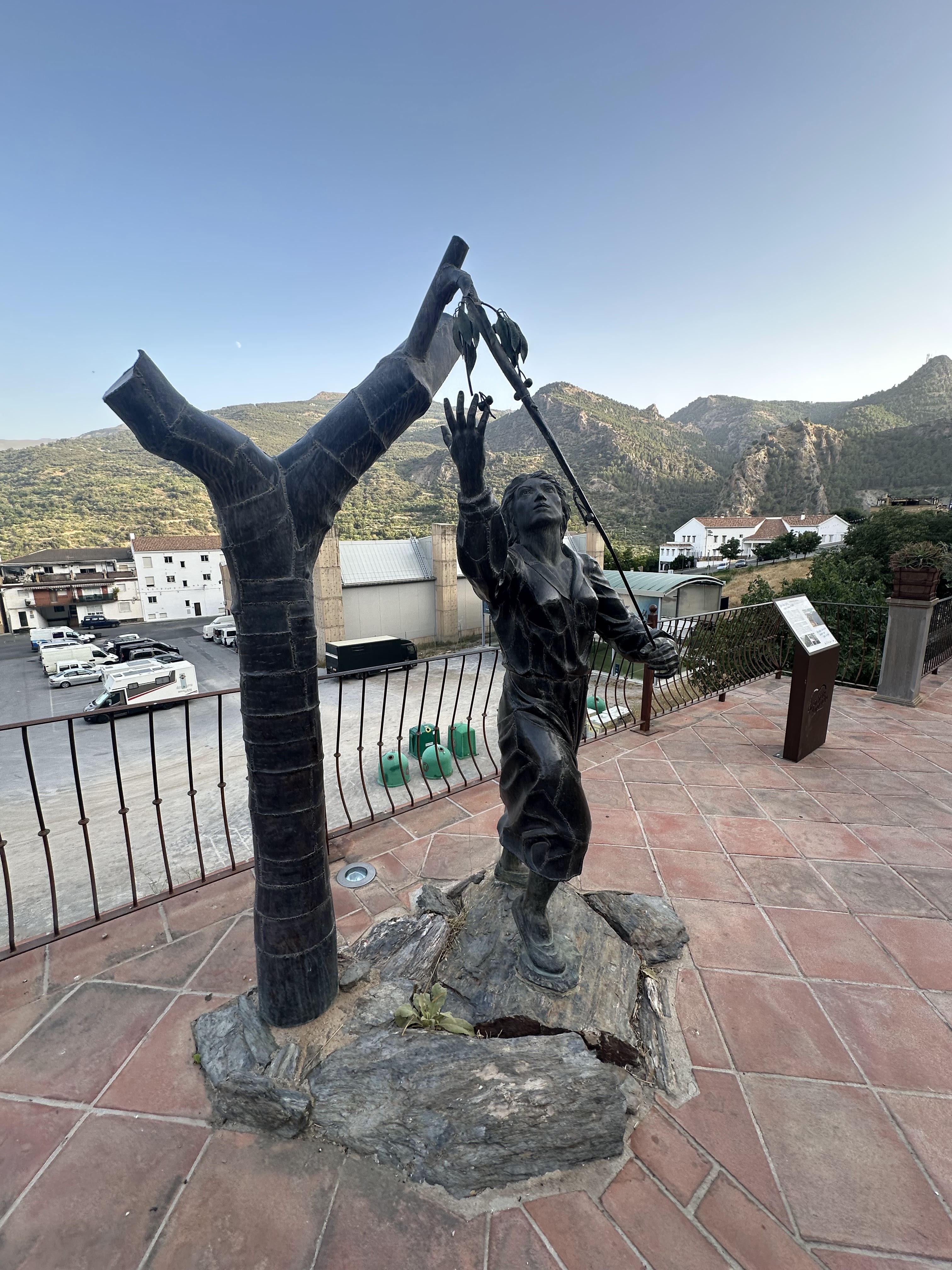 «Representa a una mujer recogiendo los frutos manualmente de un cerezo. Fue realizada por el escultor granadino Miguel Moreno Romera en 2015.»