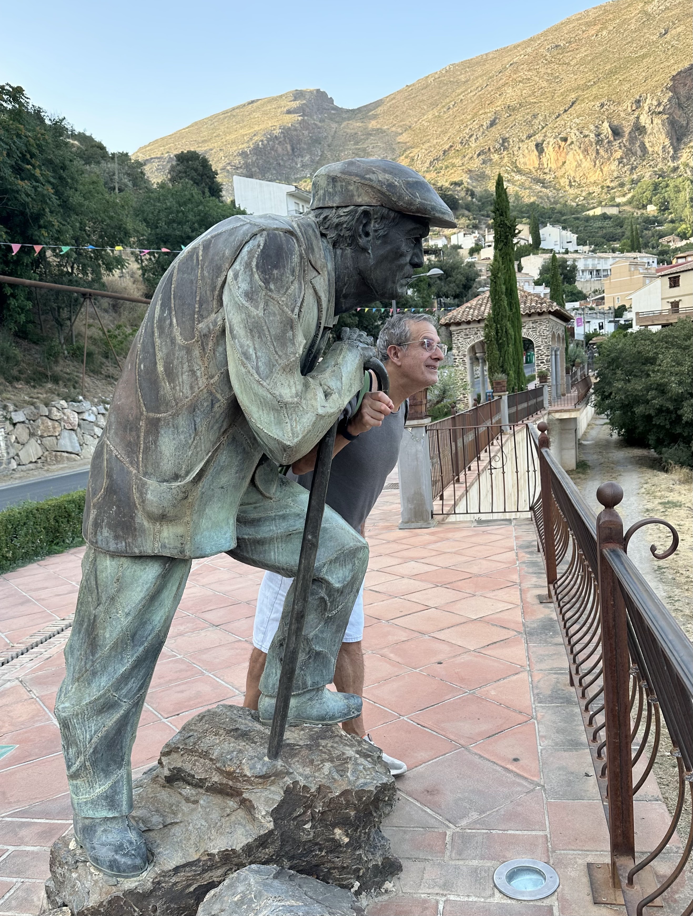 A continuación, otra escultura/monumento Asómate a Güejar, representado por una persona mayor, con su gorra y cayado/bastón mirando a las montañas.