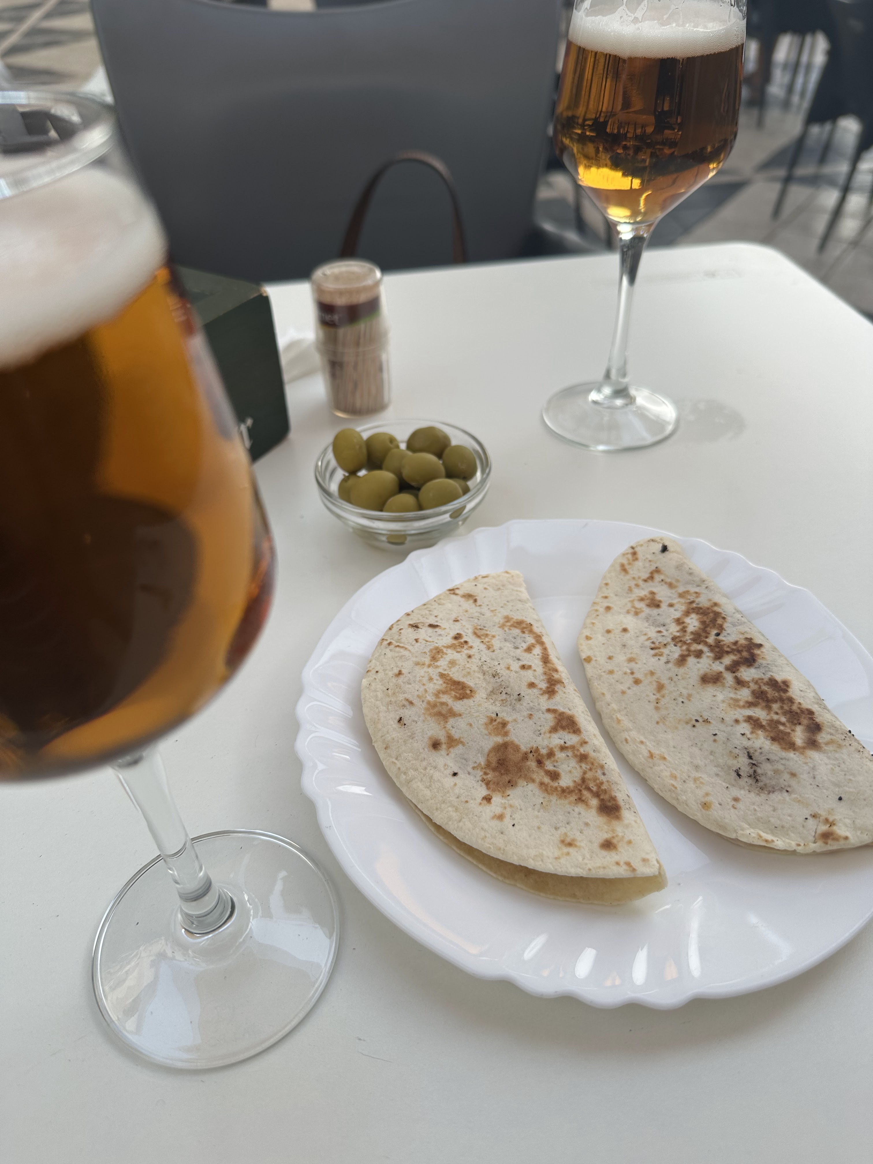 Con unas «padinas/mini-crepès» de carne, una patata asada y un bocadillo fueron suficientes como tapas con las cervezas (caña+tapa=2,50 eur).