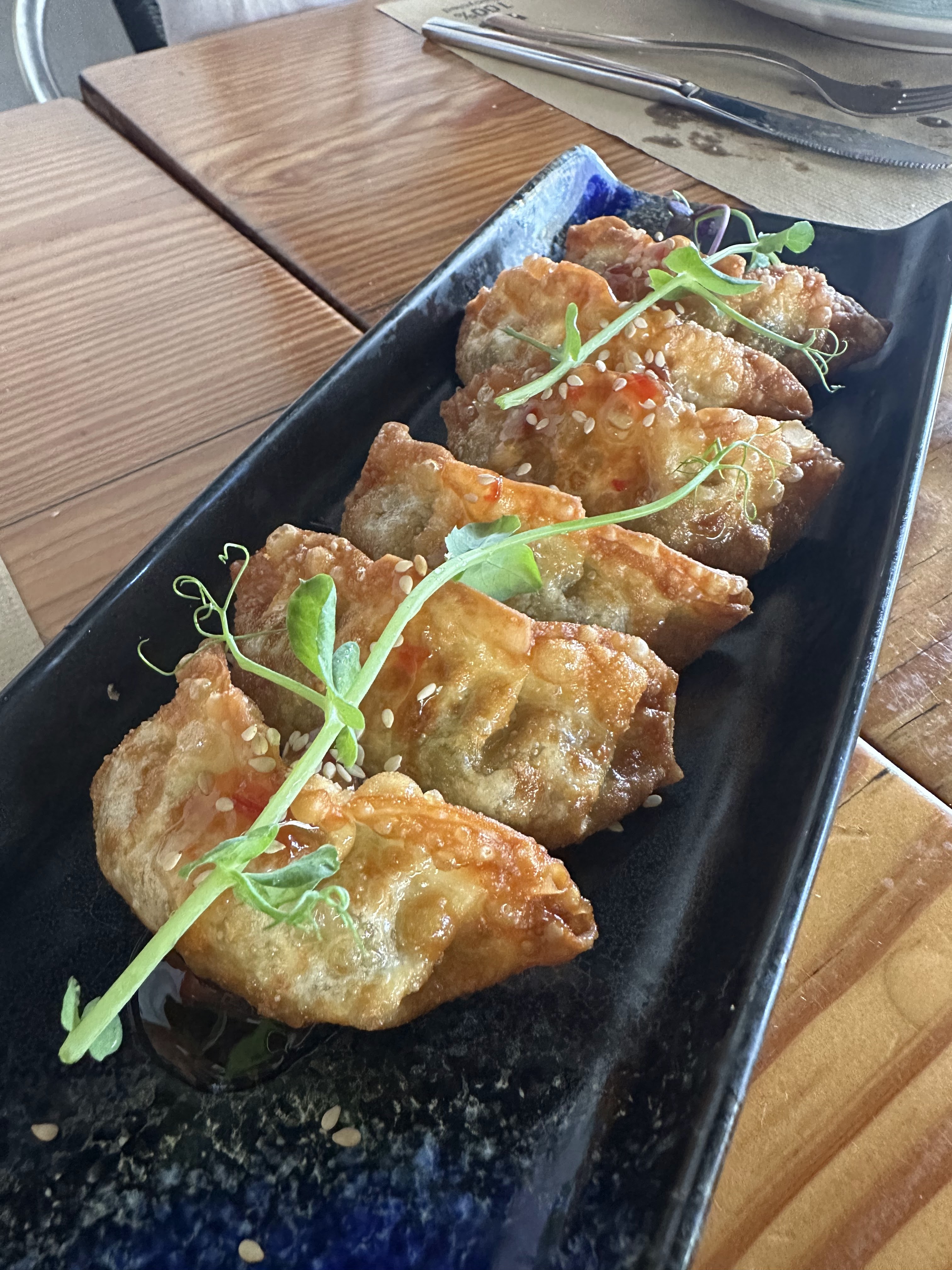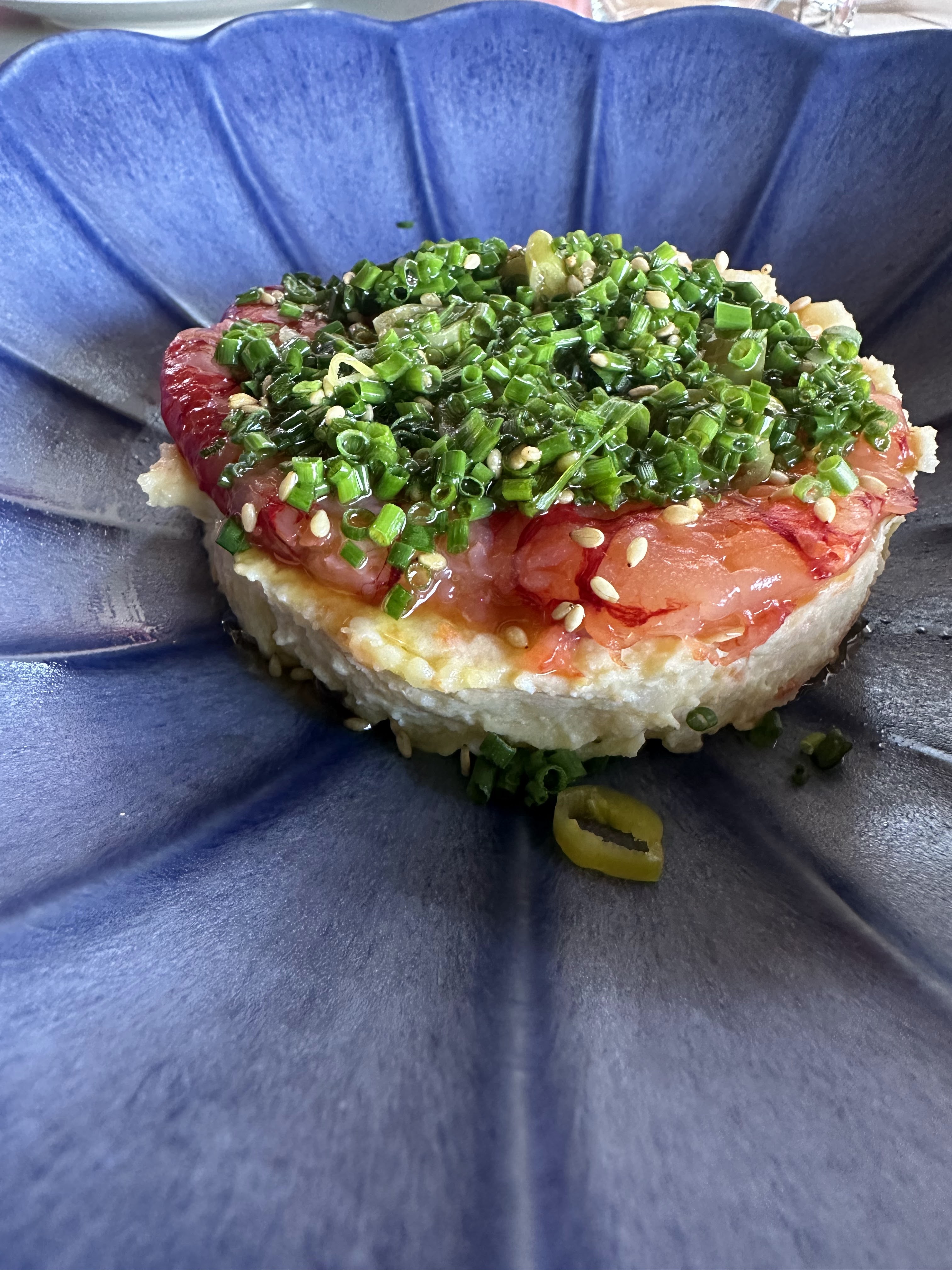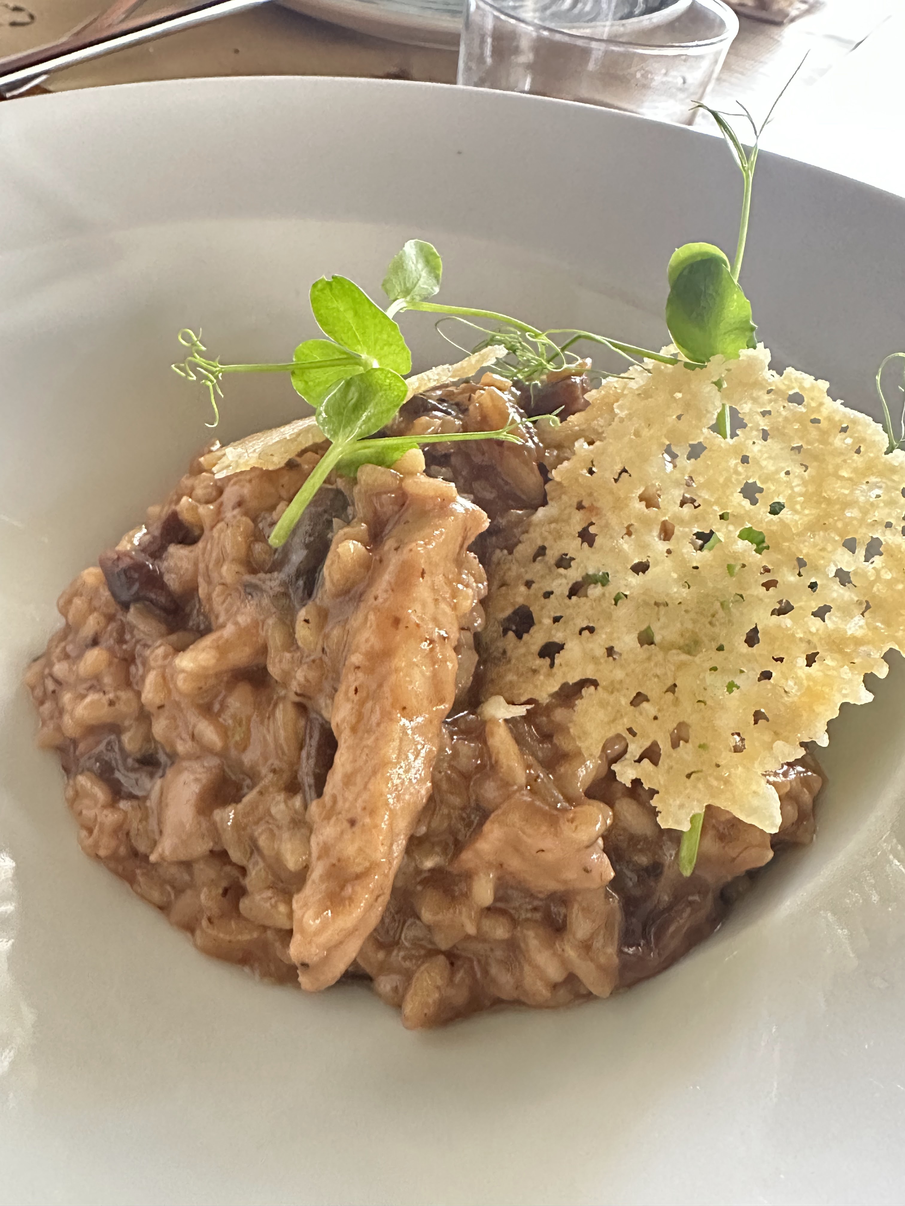 Ensalada caprese; gyozas; cazuela mixta de gambas y setas y risotto de secreto. De postre : Gofio en 4 texturas.