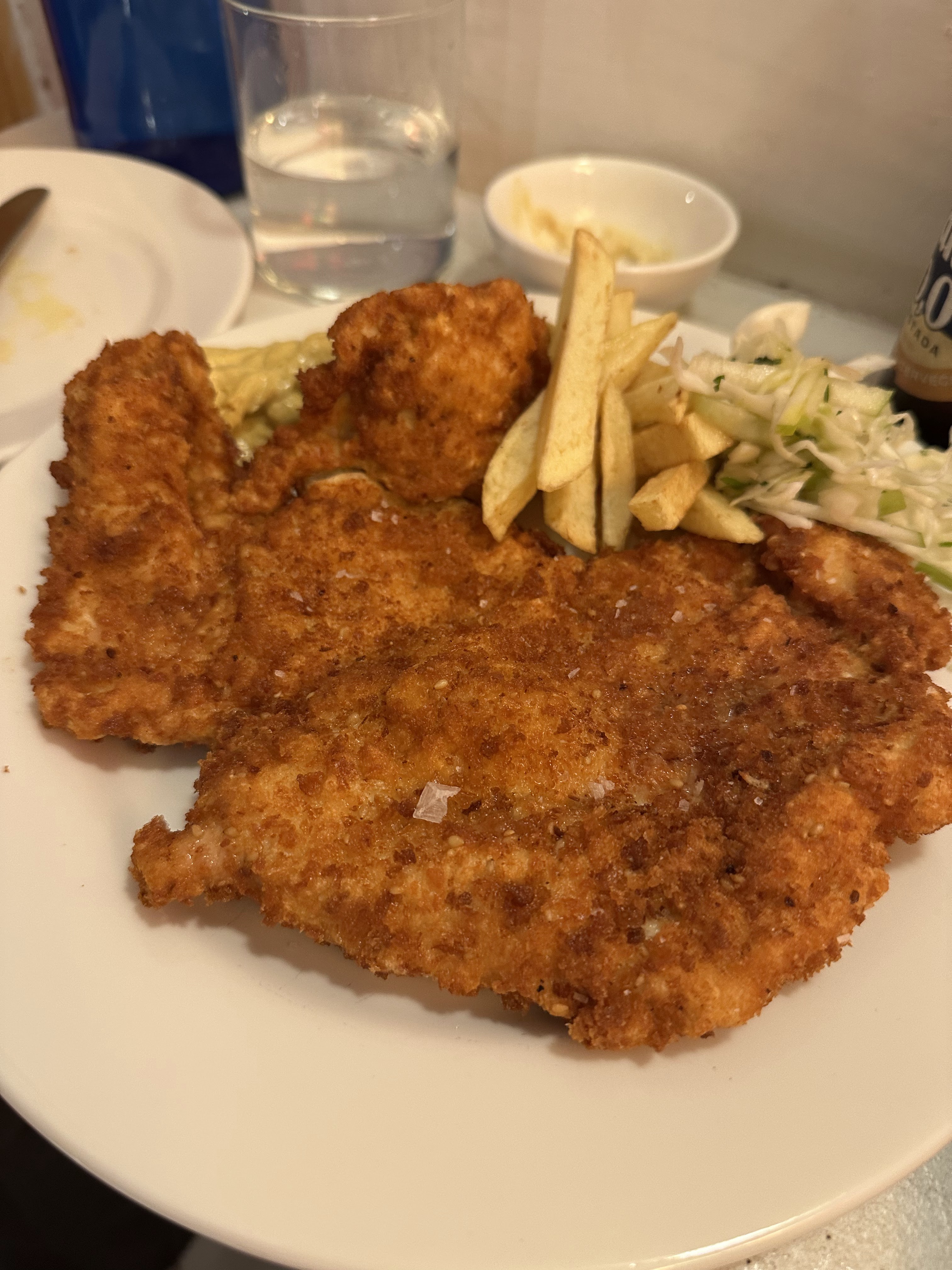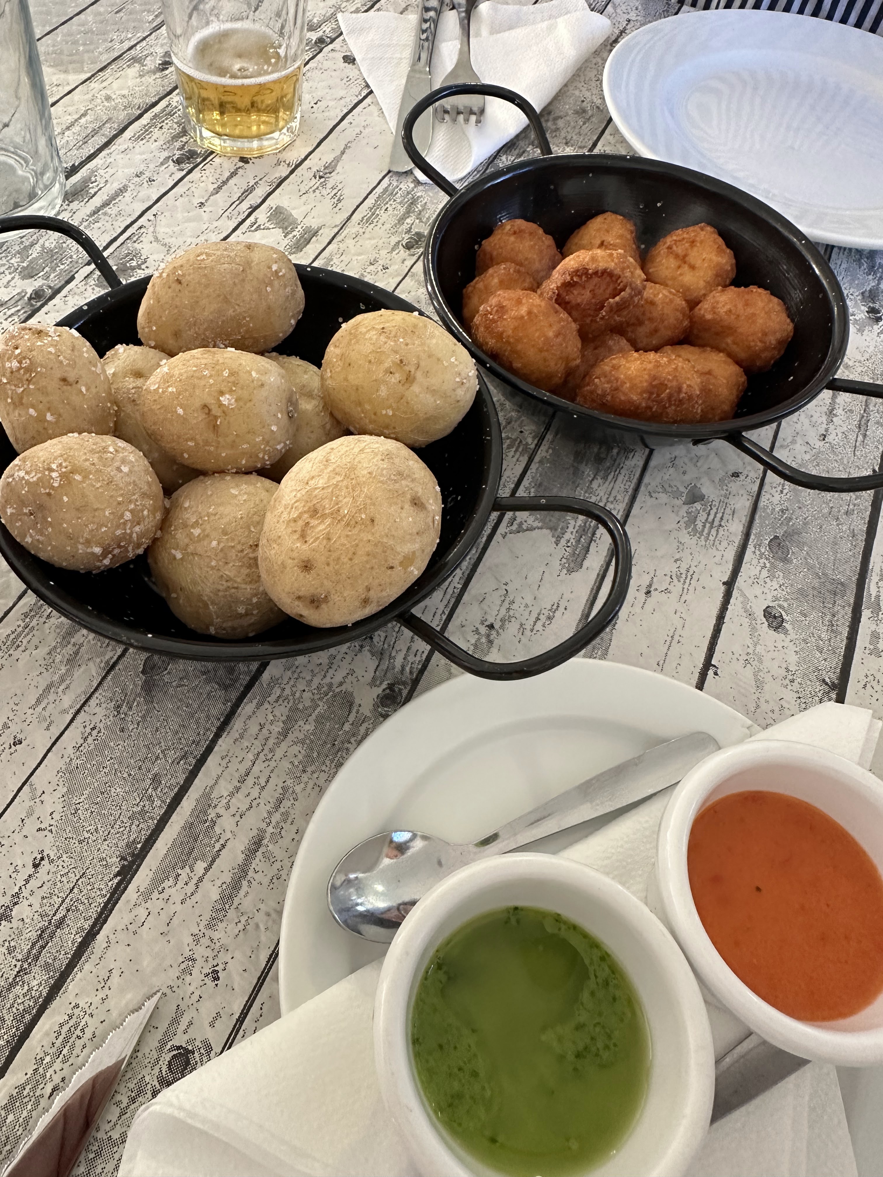 Un par de cervezas (a 2 eur c.u.), un agua (1,50 eur), una ensalada de pollo, unas papas arrugás y unas empanadillas.