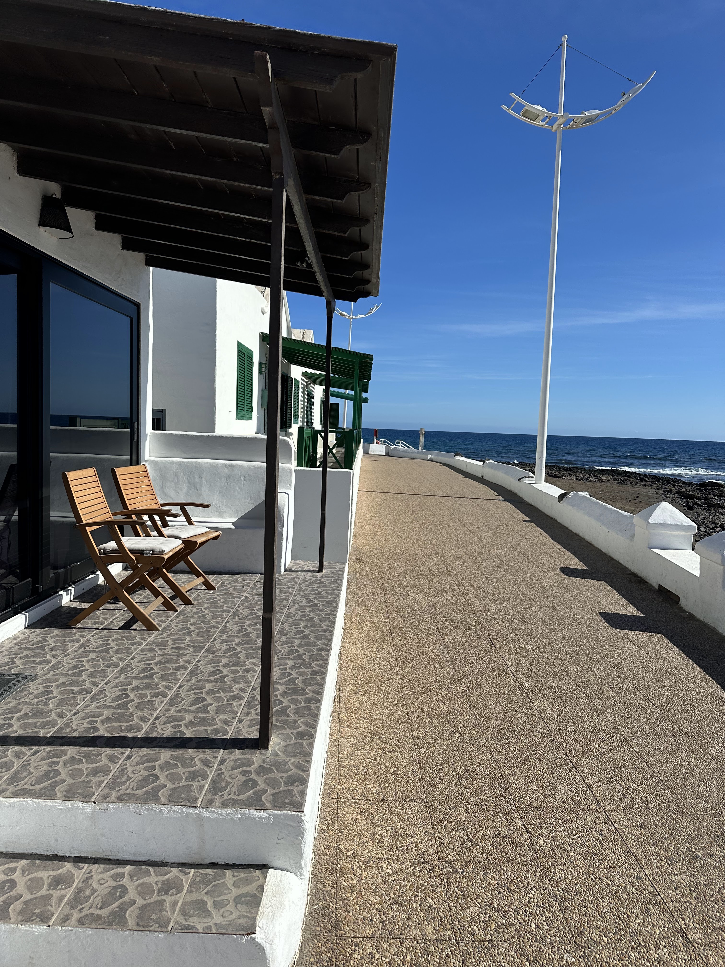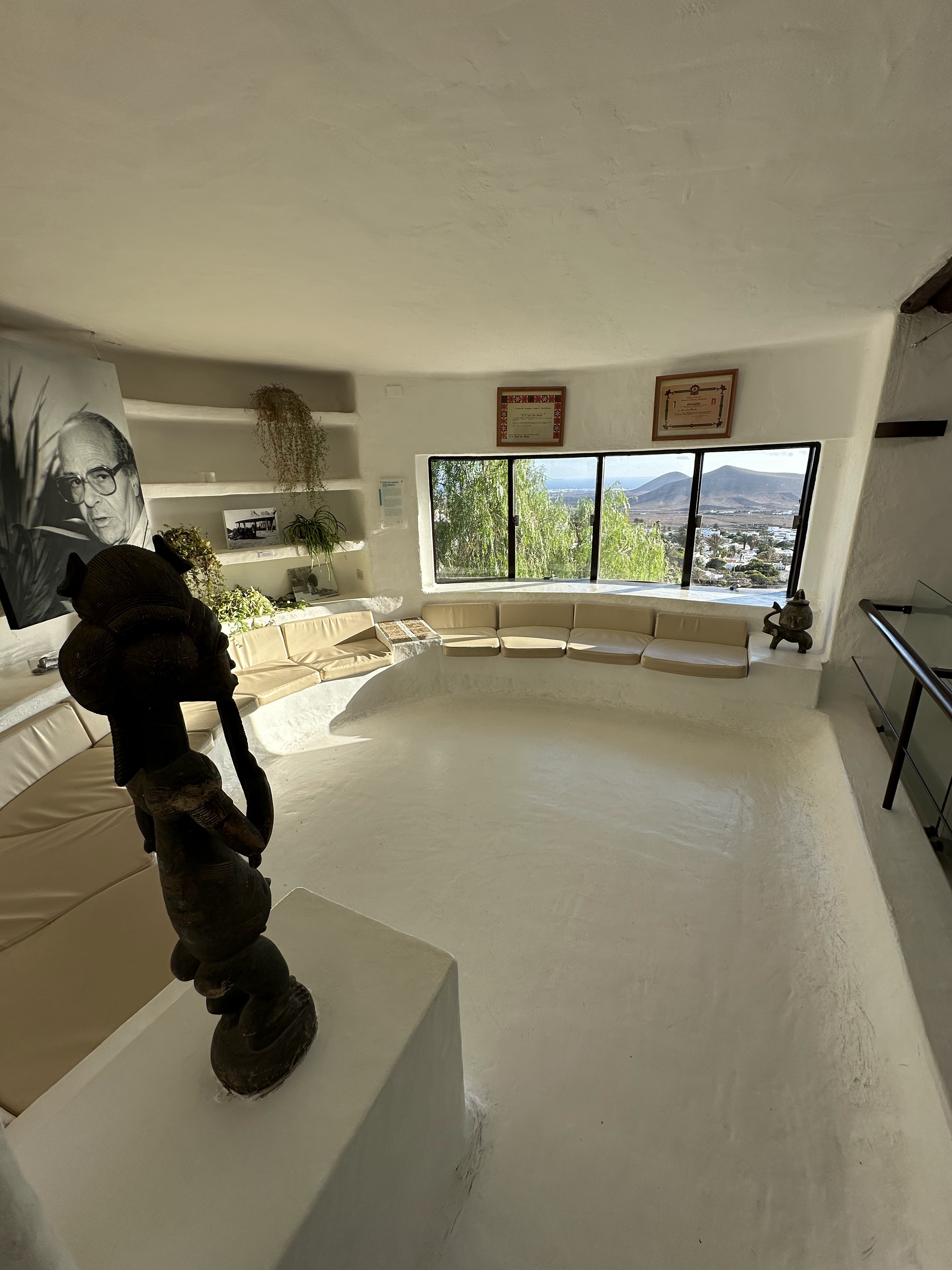 - Por un lado, se encuentra el ventanal circular del interior, desde donde contemplar de frente el mar y el perfil inconfundible de La Graciosa.