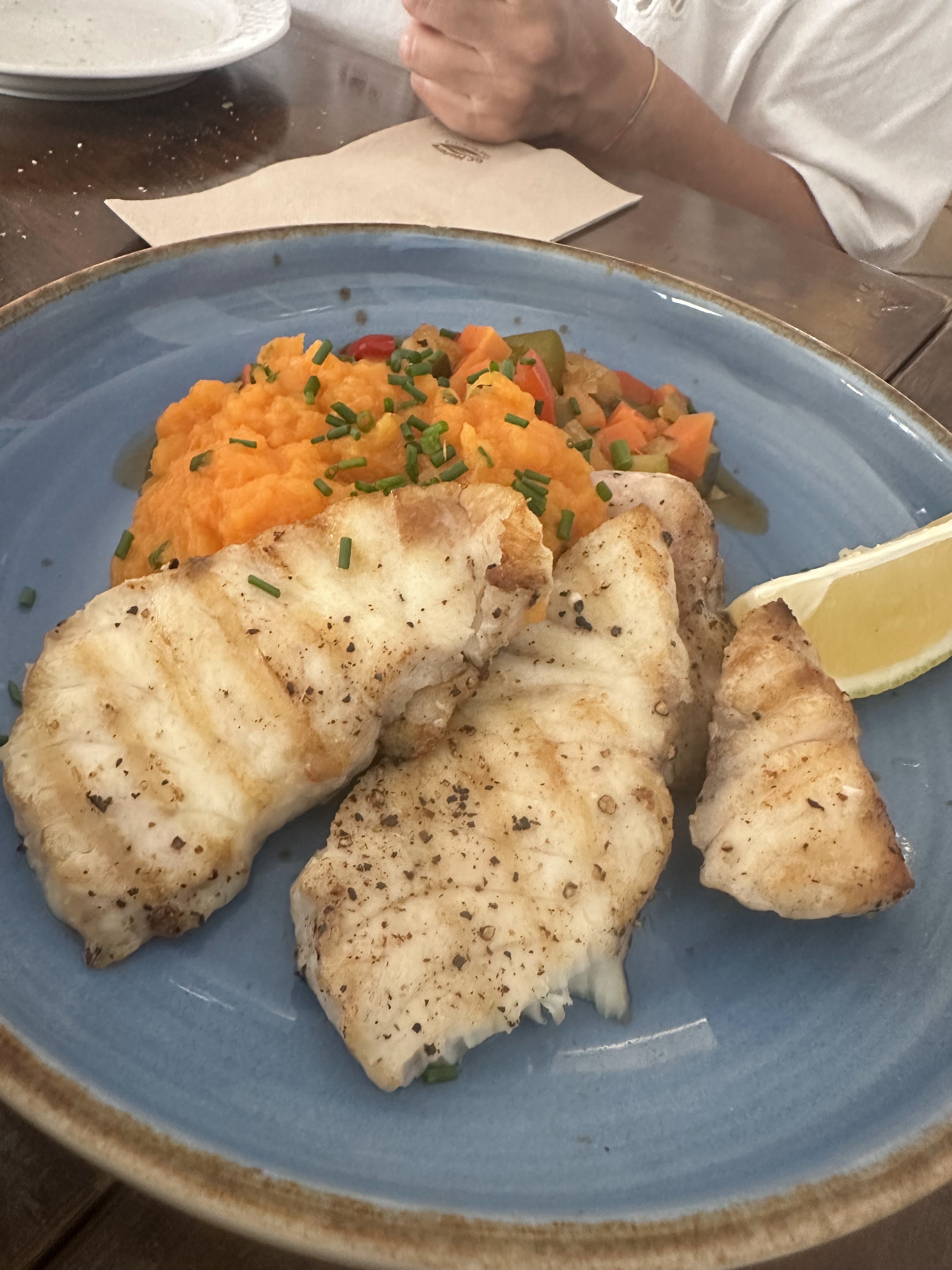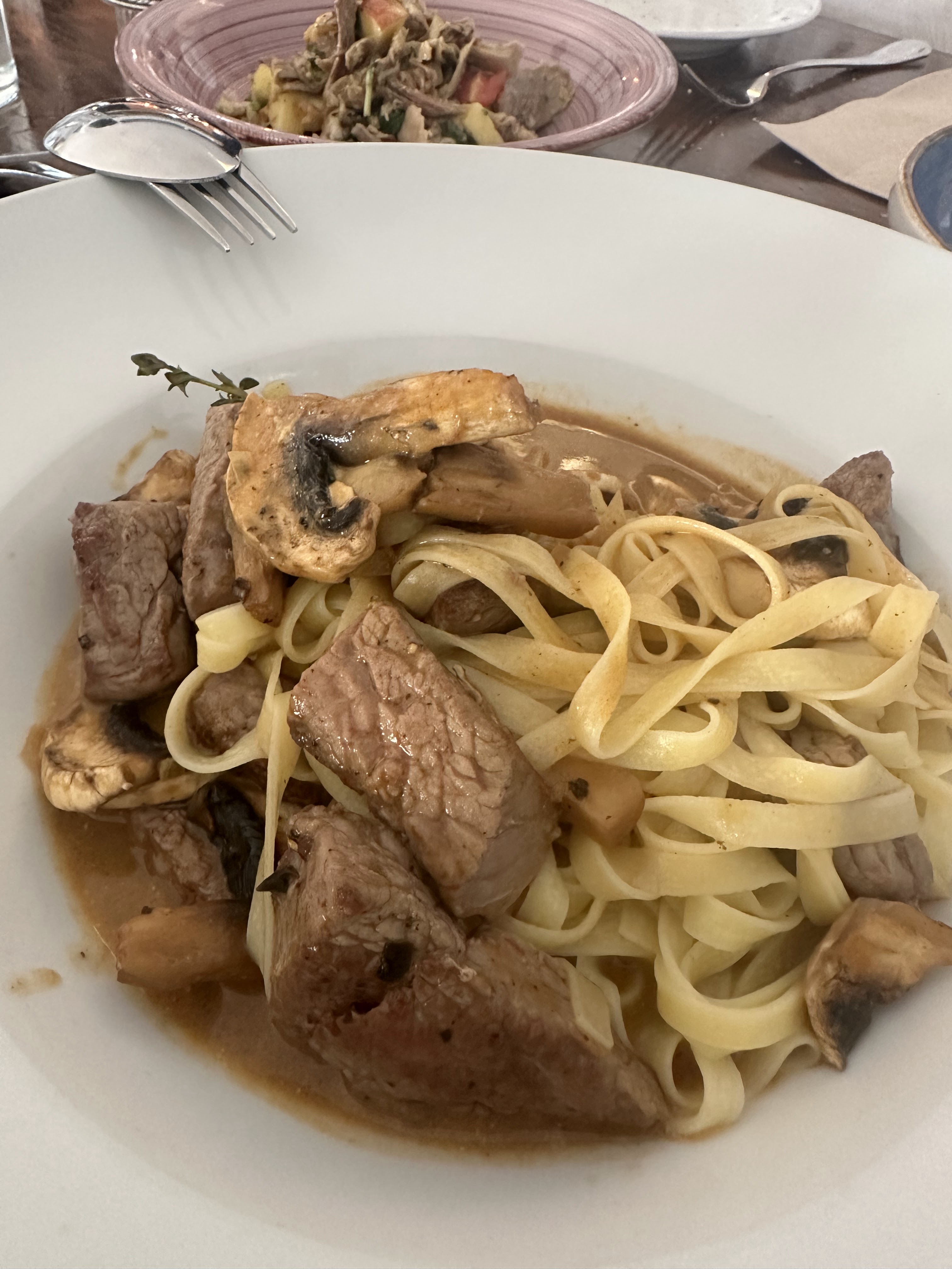 *Ensalada de pato, manzana y menta; tagliatelle de puntas de solomillo y filetes de sama (pescado) con puré de boniato y verduras. De postre : Tiramisú.