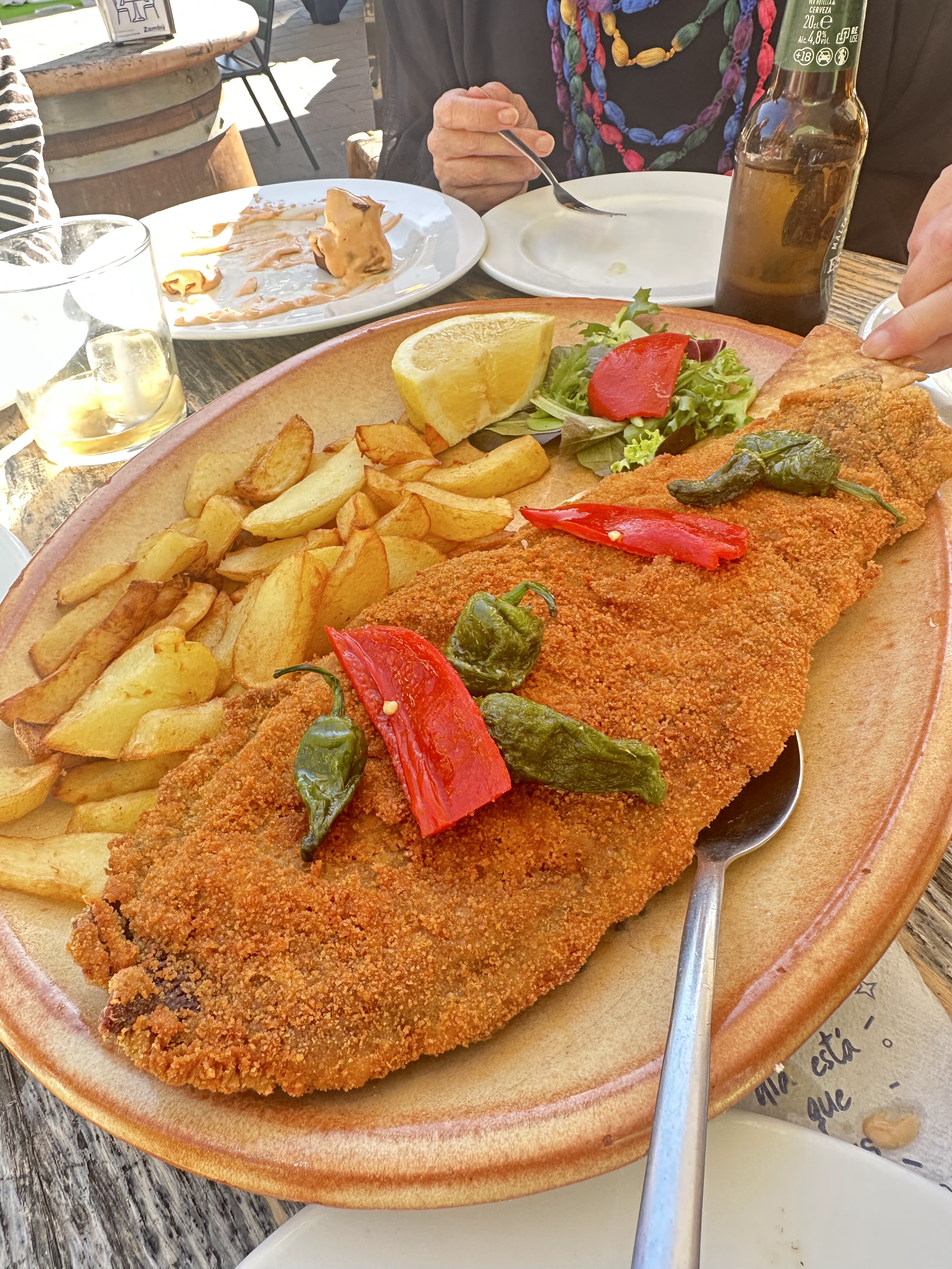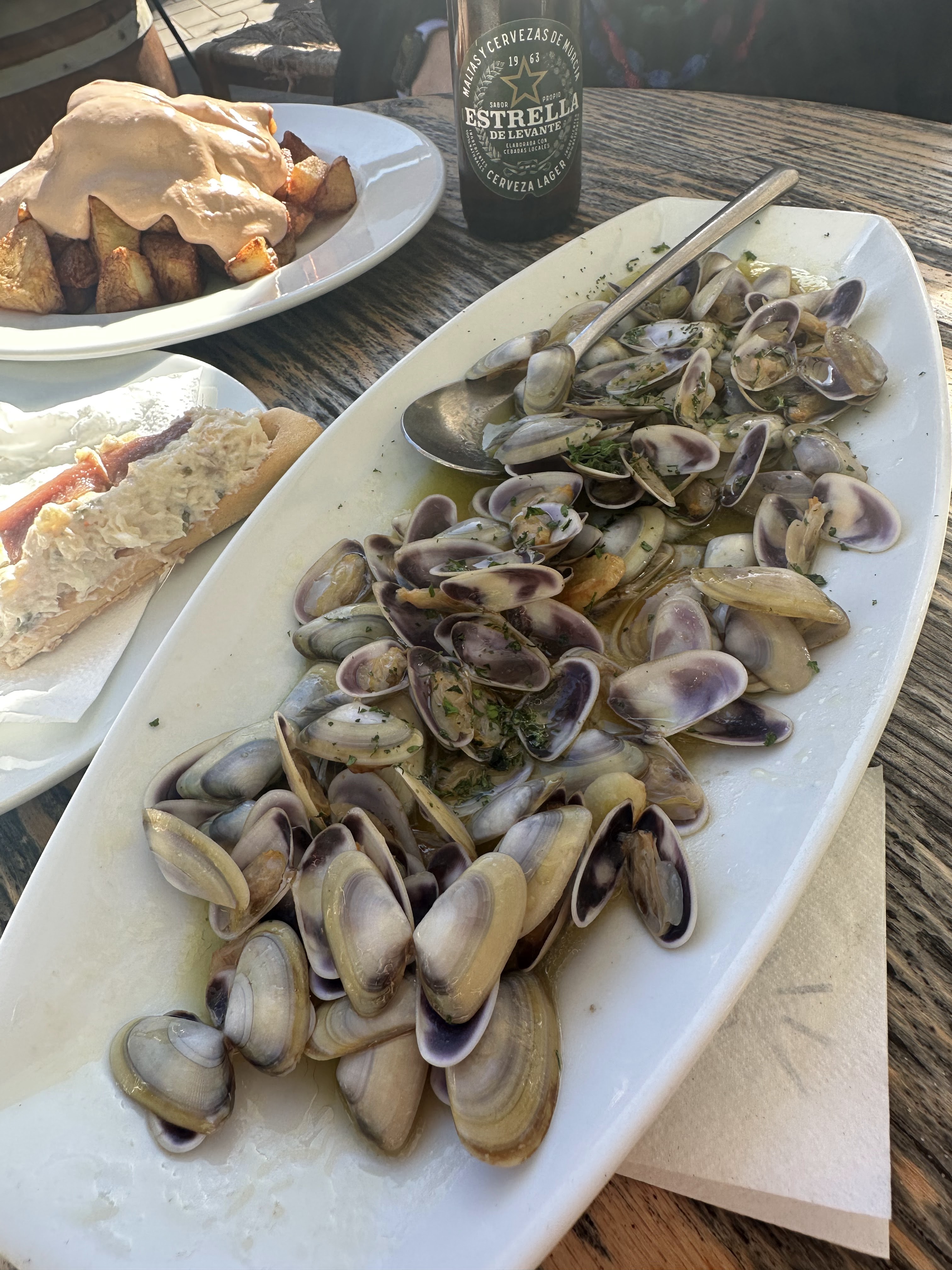Unas marineras, bicicleta, tellinas, bravas, lacón cocido y cachopo fueron nuestros platos tomados en un barril que tenían libre y al solecico.