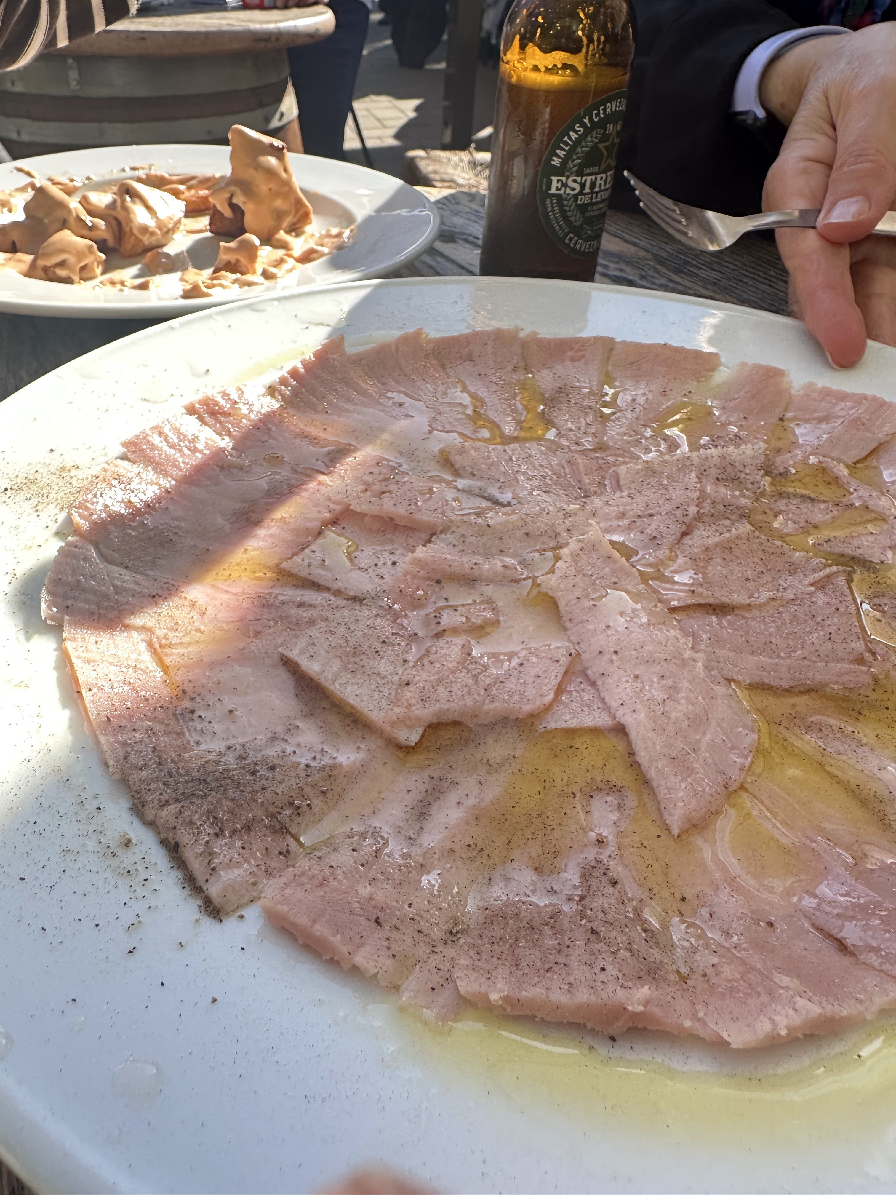 14:00h. Comida en nuestro piso; tocaba aperitivillo de mojama y hueva, pulpito al horno y unas buenísimas chuletillas de cordero segureño, también de la Venta la Asomada, claro.
