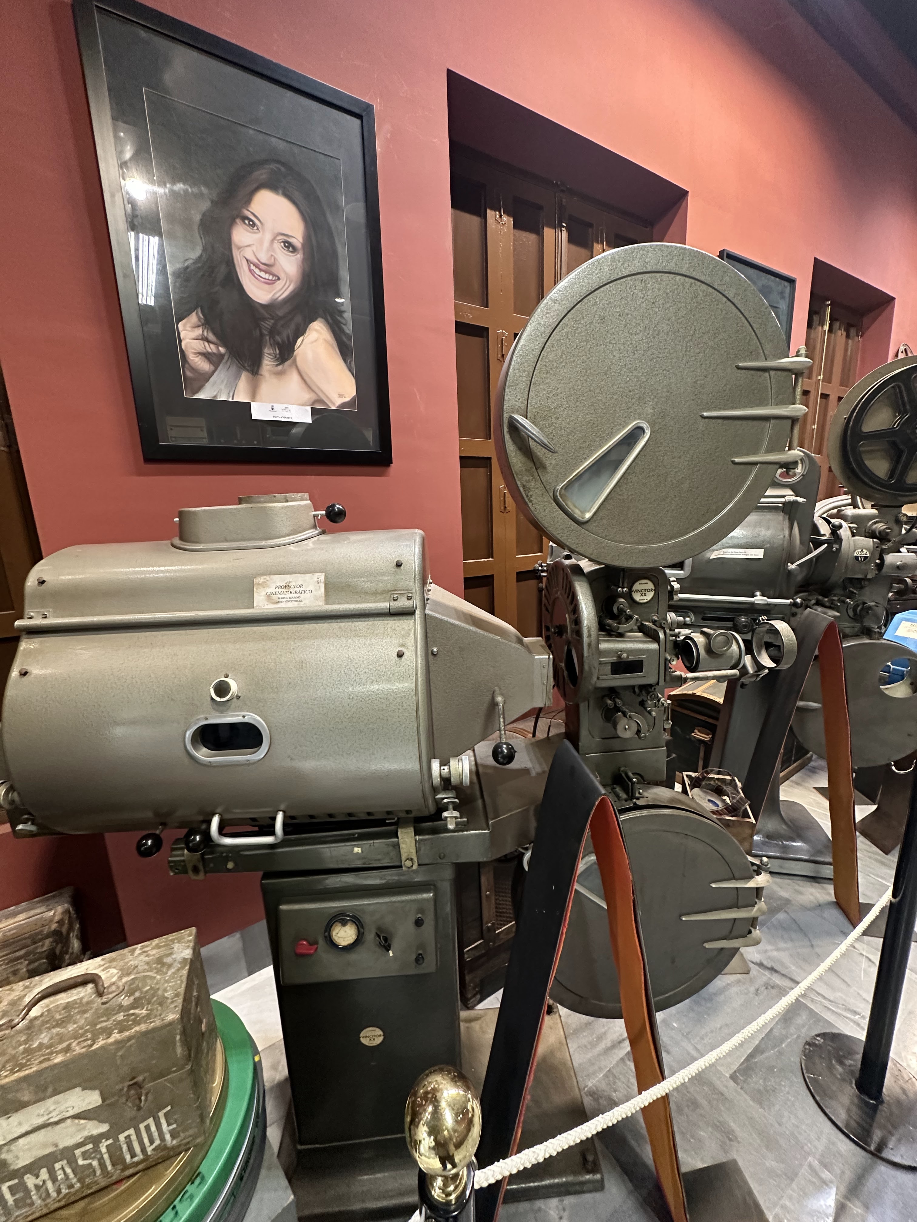 Colección de material cinematográfico antiguo: Proyectores antiguos, cámaras de fotos y material propio de las cabinas de proyección, asi como una selección de afiches de películas rodadas en el municipio.»