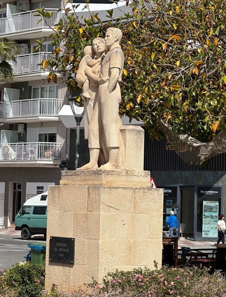 Sobre un pedestal de piedra caliza de 2,50 metros de alto se alzan tres figuras también en piedra (una pareja con su hijo pequeño en brazos) que representan la despedida del pescador antes de partir a la mar.