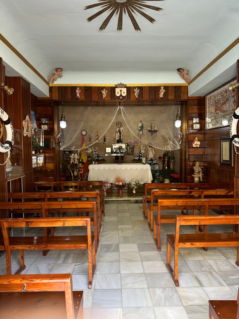 En ese triángulo que forma la plaza Constitución y calle del Muelle/calle Astilleros, podéis contemplar la escultura «Despedida del Pescador» (1968) y la Capilla de la Virgen del Carmen.