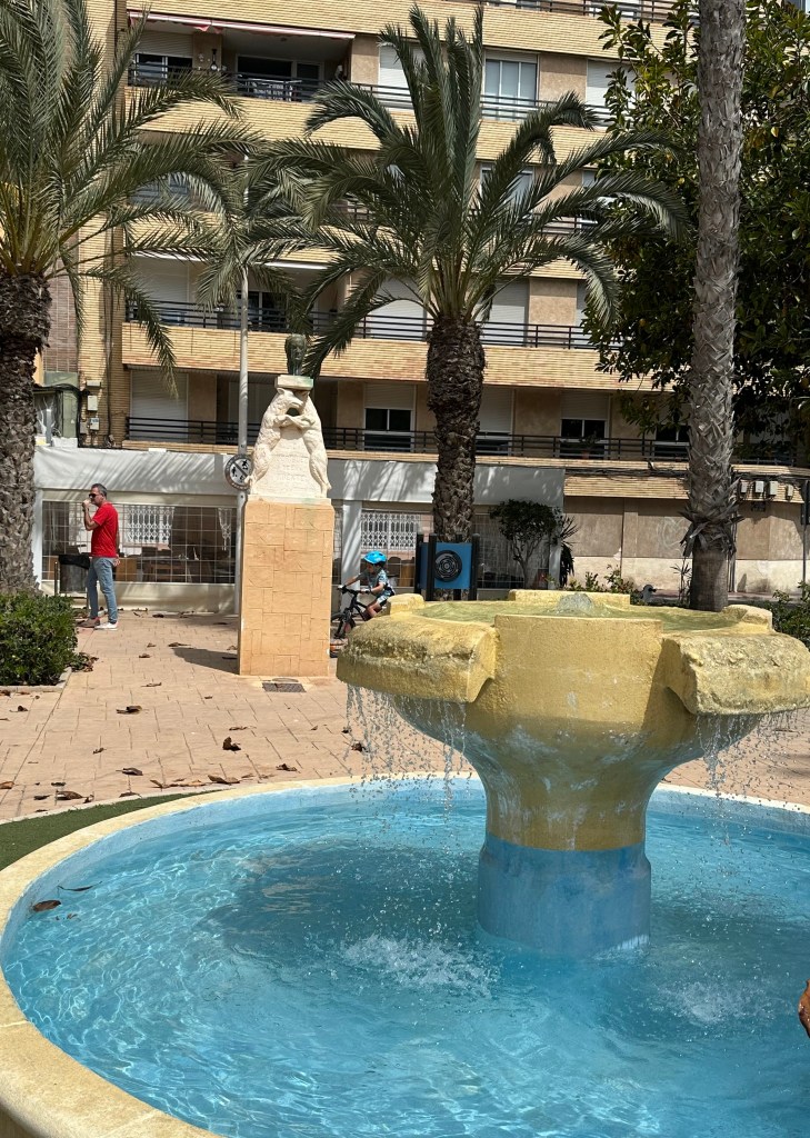 La plaza de la Comunidad Valenciana es un jardín donde comienza dicho paseo y donde podéis ver a parte de una escultura de un pescador y un ancla (homenaje al poeta Pepe Alonso y con las piernas cruzadas y mirando al mar, una escultura del ex-ministro Francisco Fernández Ordoñez.