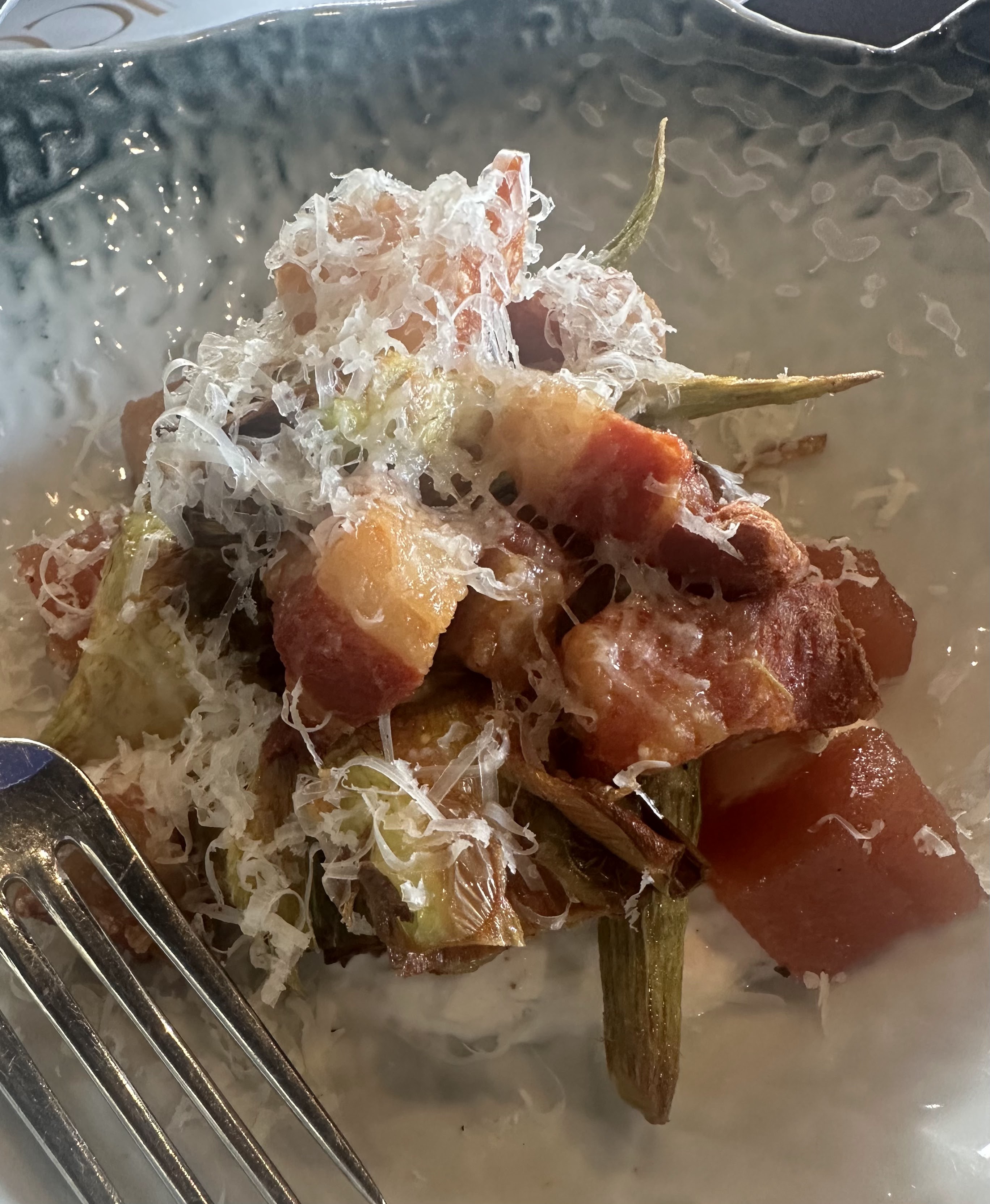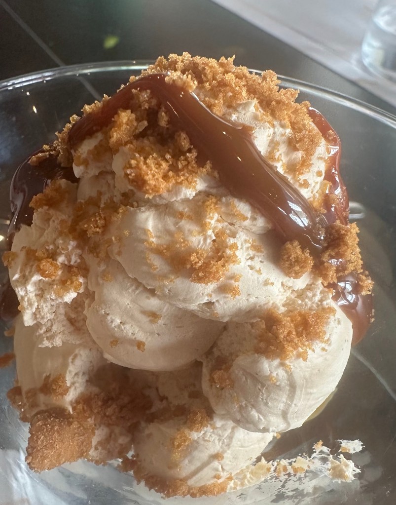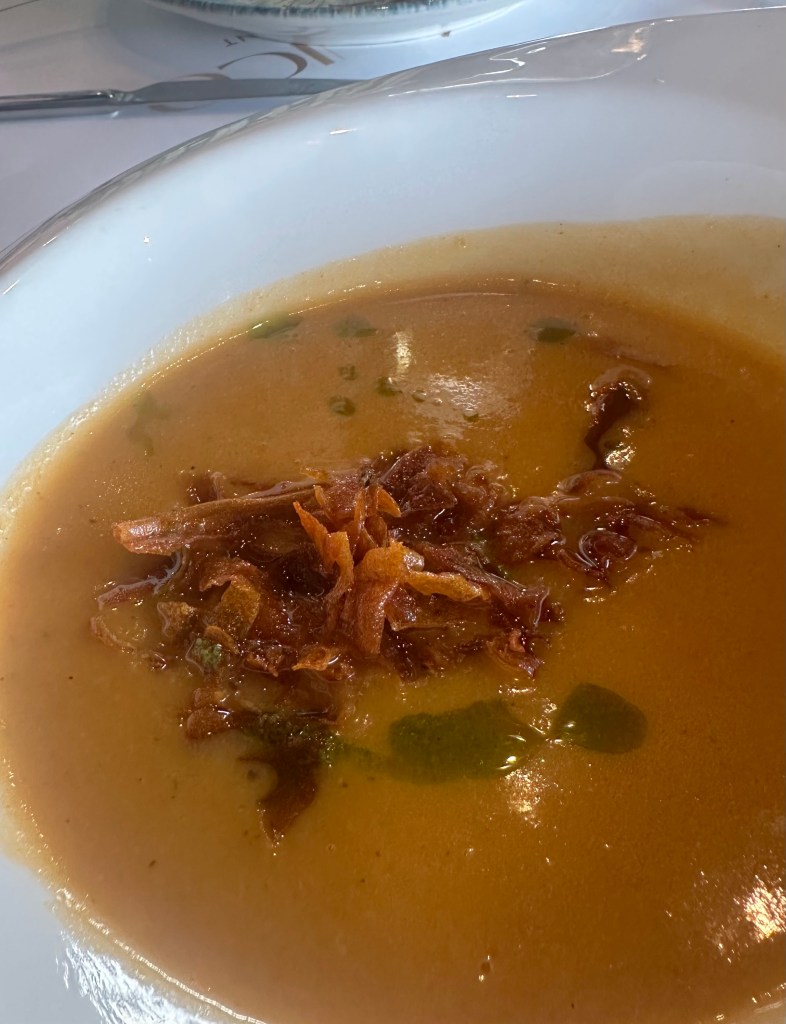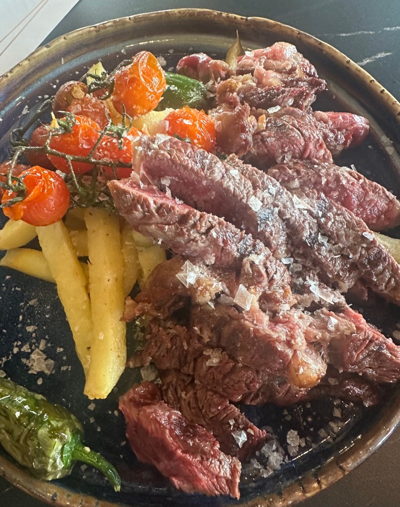 También pedimos una ensaladilla de gamba, alcachofas torrezno y burrata, y lomo de ternera brasa.