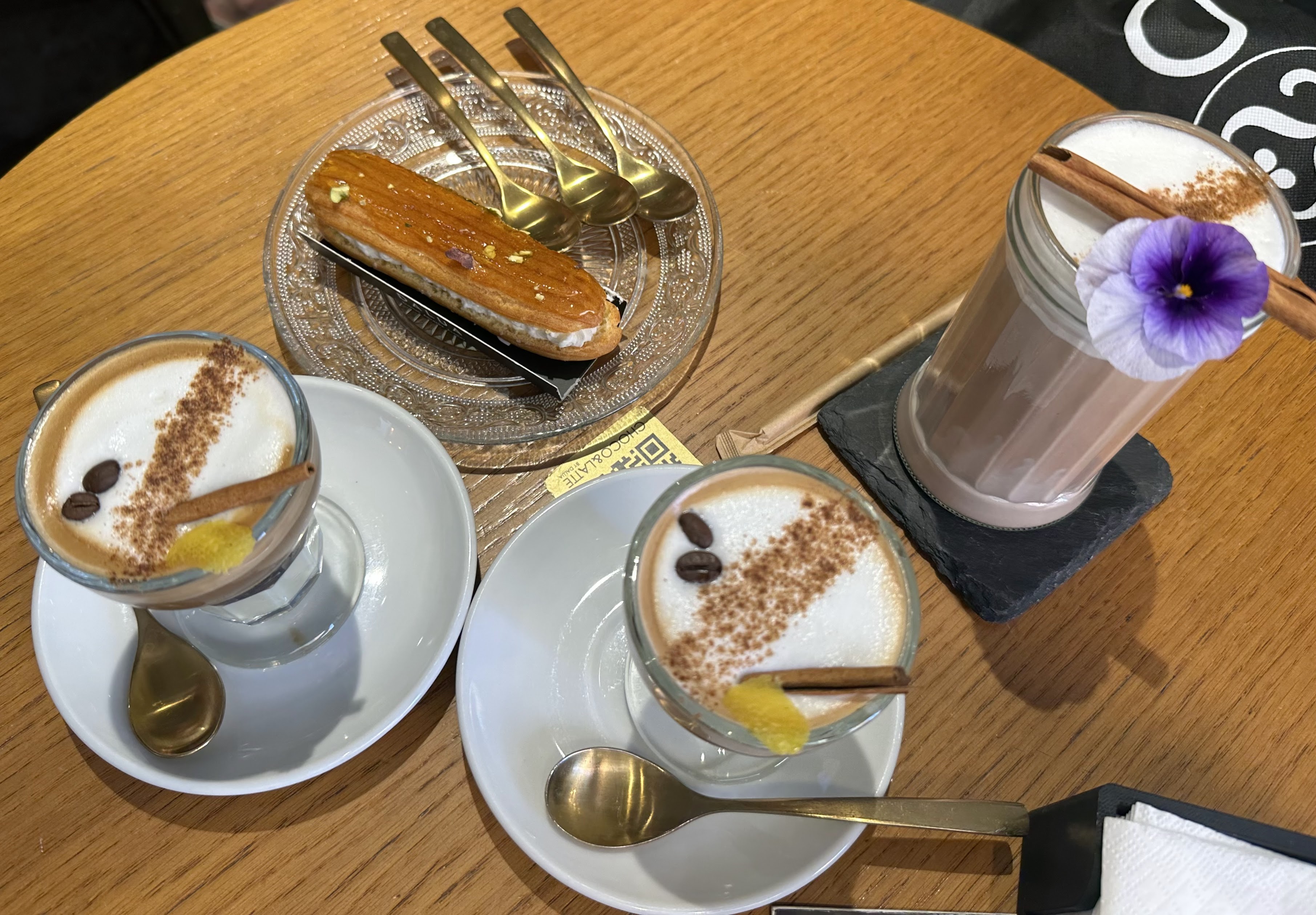 Tomamos un cacao, dos asiáticos y un eclair de nata y caramelo y comprado para llevar, 2 ensaimadas (una normal y una de crema-espectacularmente buena-) y un croisant de pistacho.